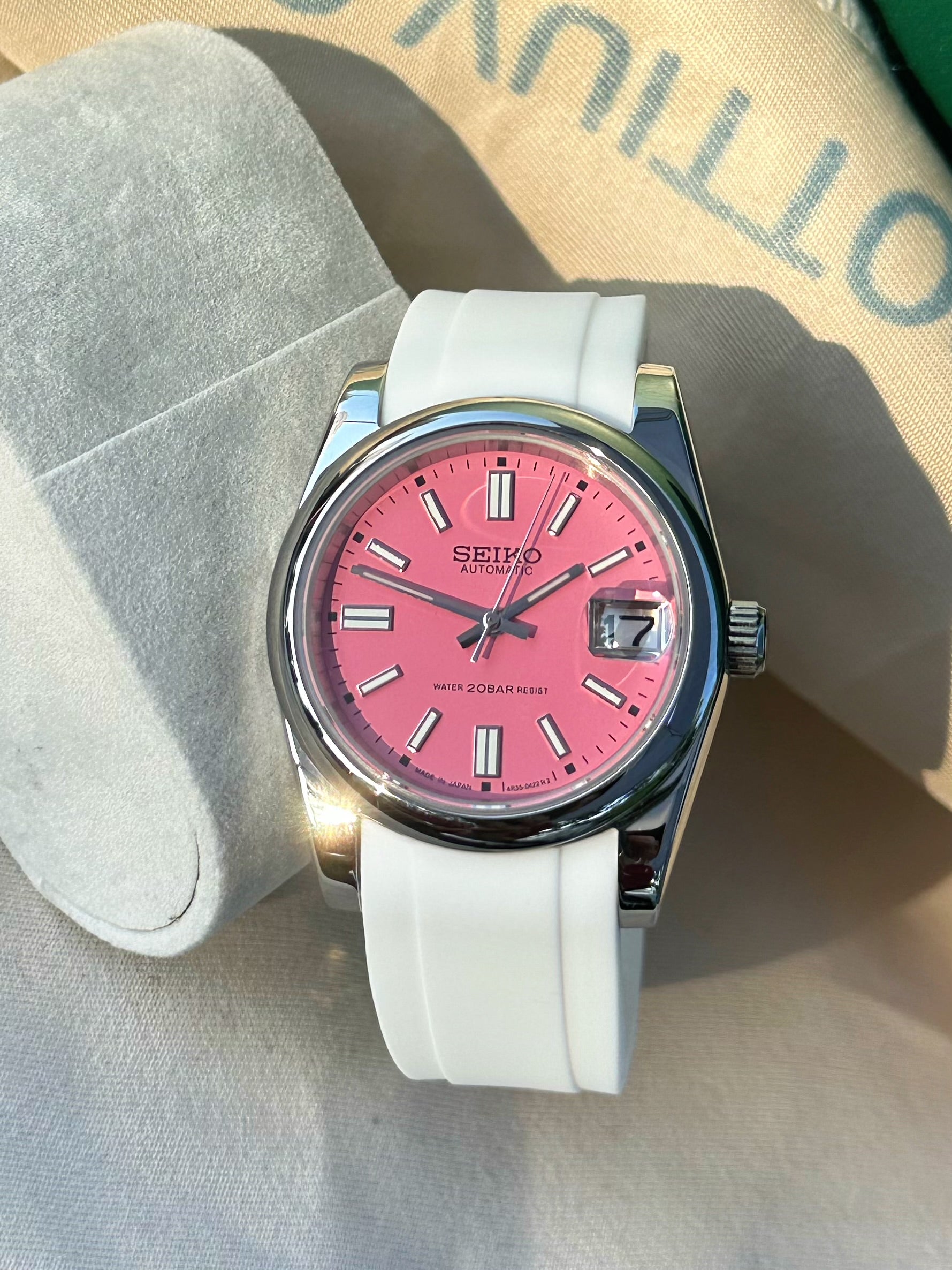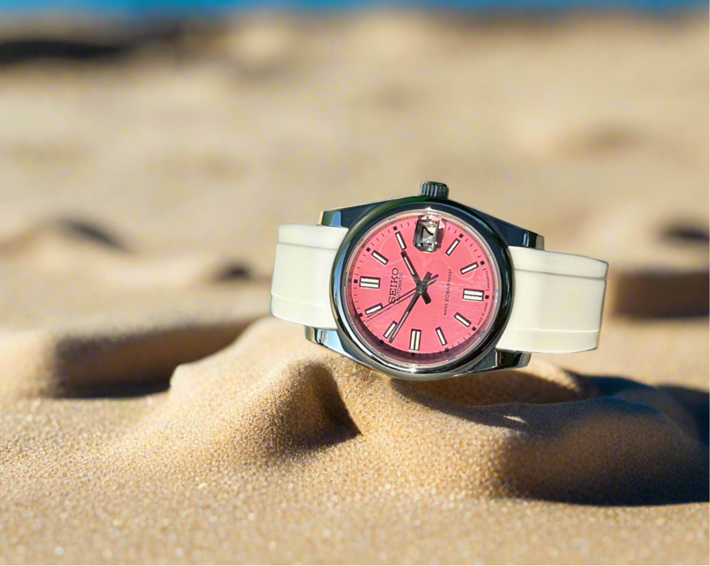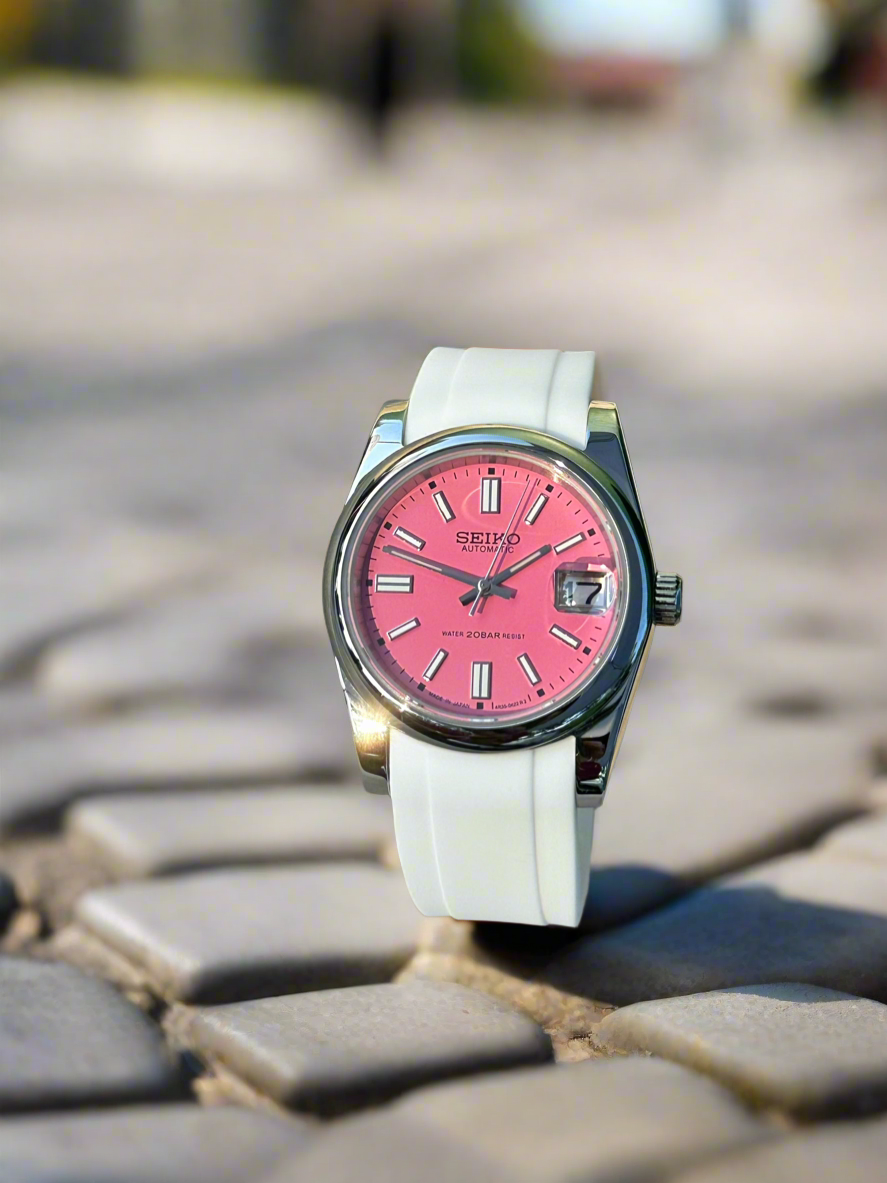 36mm stainless steel case, sapphire crystal, exhibition case back, screw down crown, beautiful matte pink dial , on 20 mm rubber strap subtitle for men or women’s wrist size