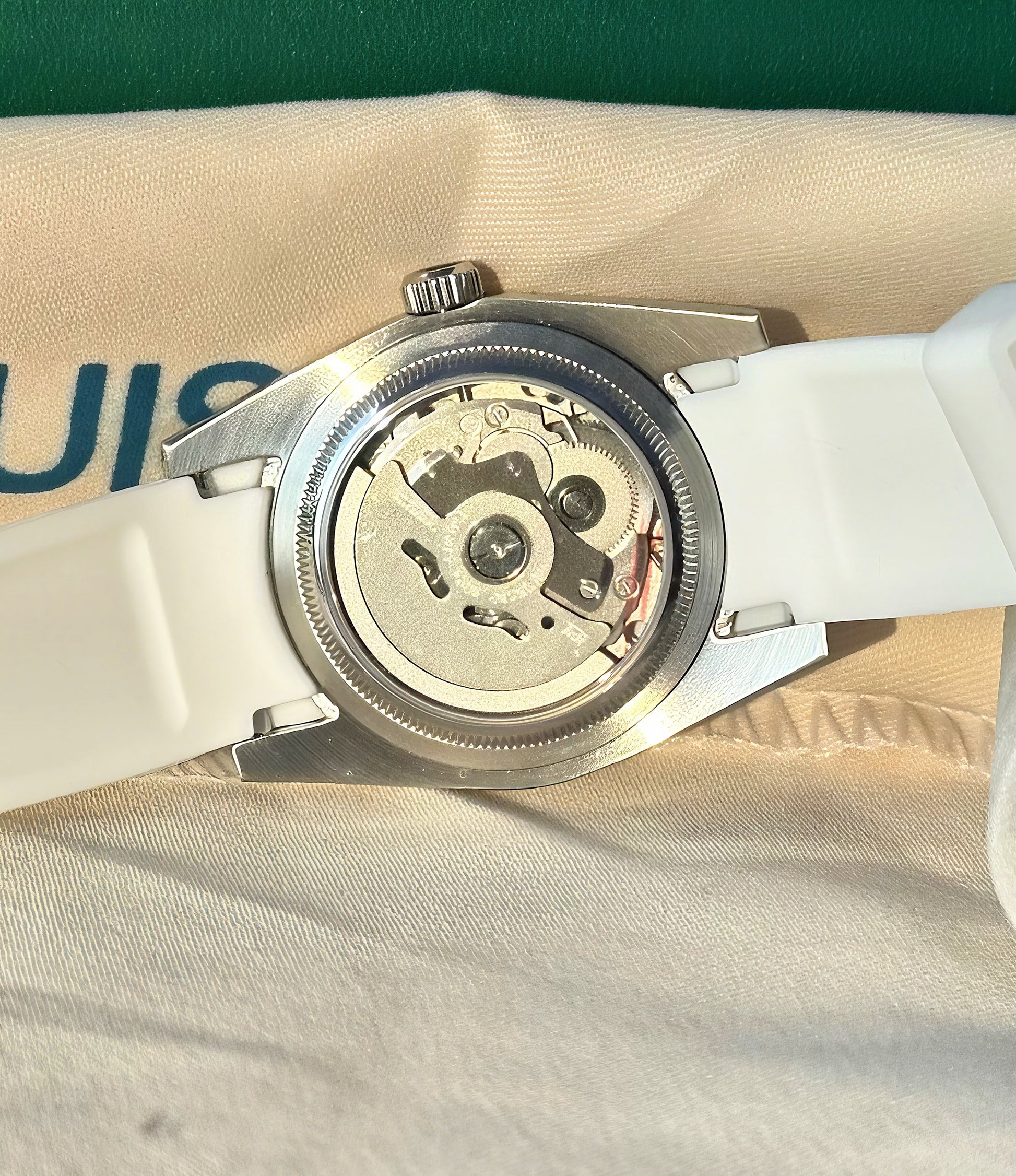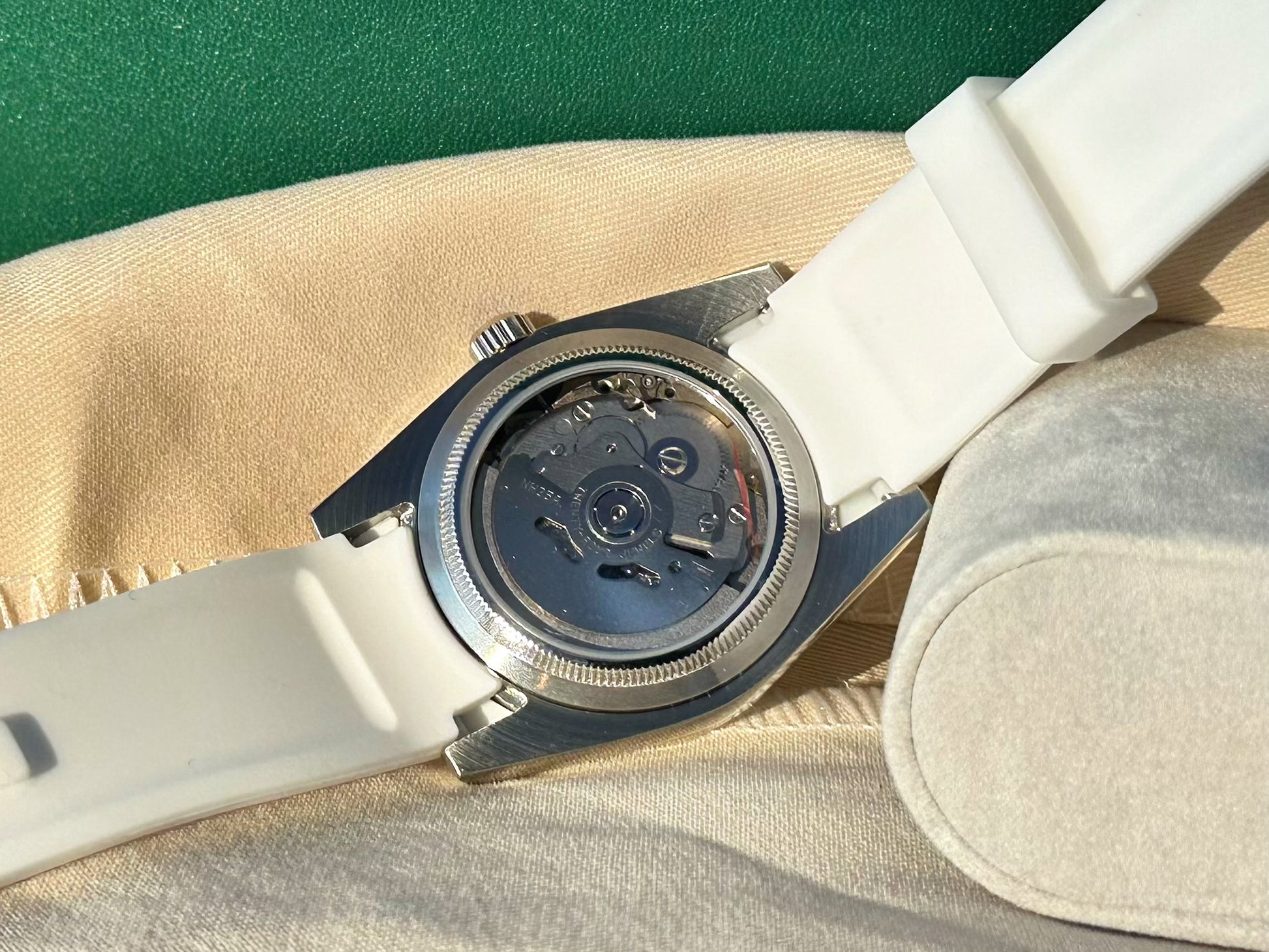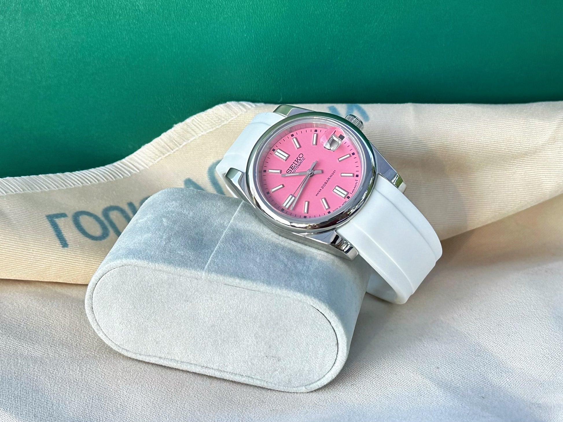 36mm stainless steel case, sapphire crystal, exhibition case back, screw down crown, beautiful matte pink dial , on 20 mm rubber strap subtitle for men or women’s wrist size