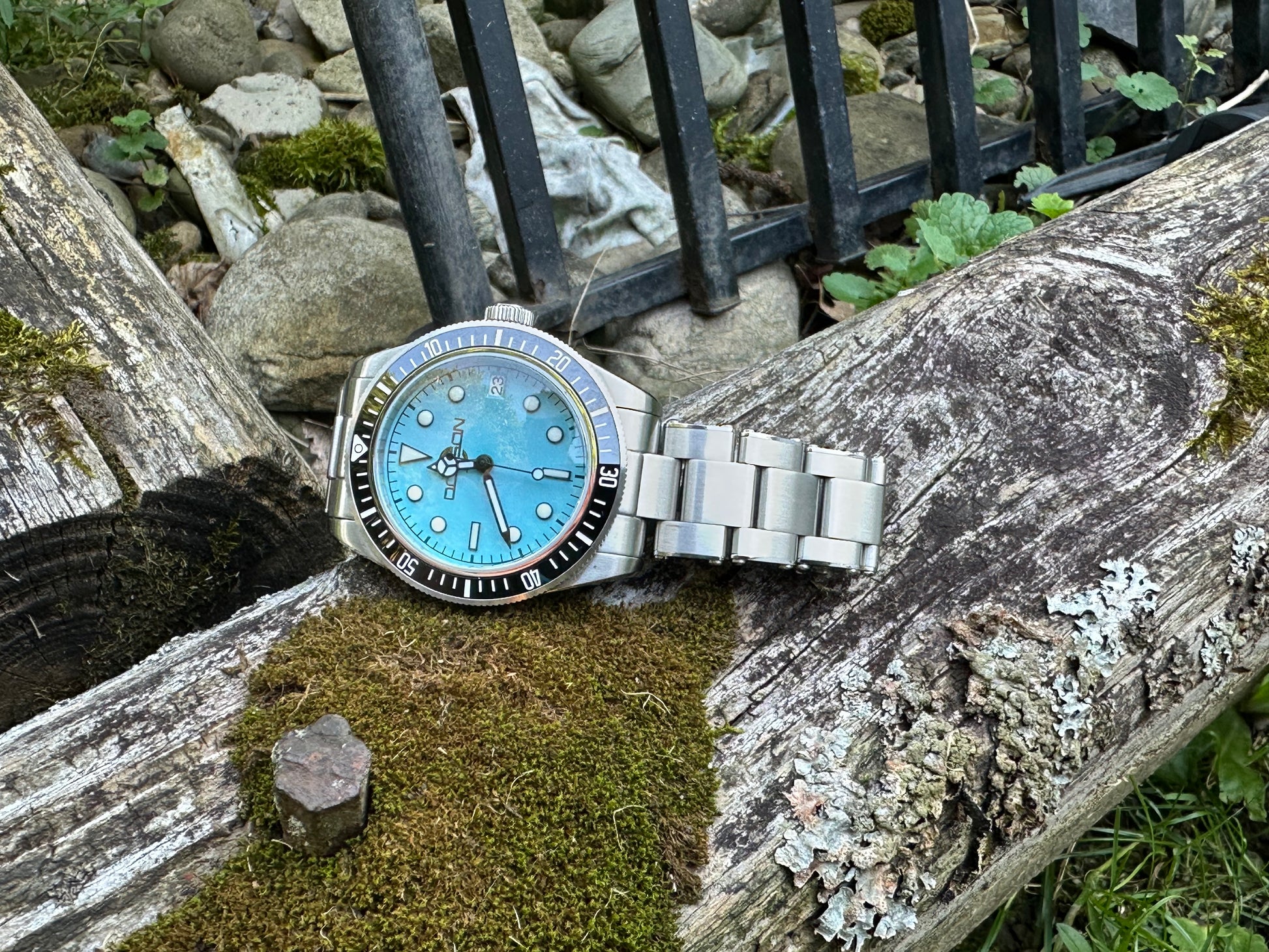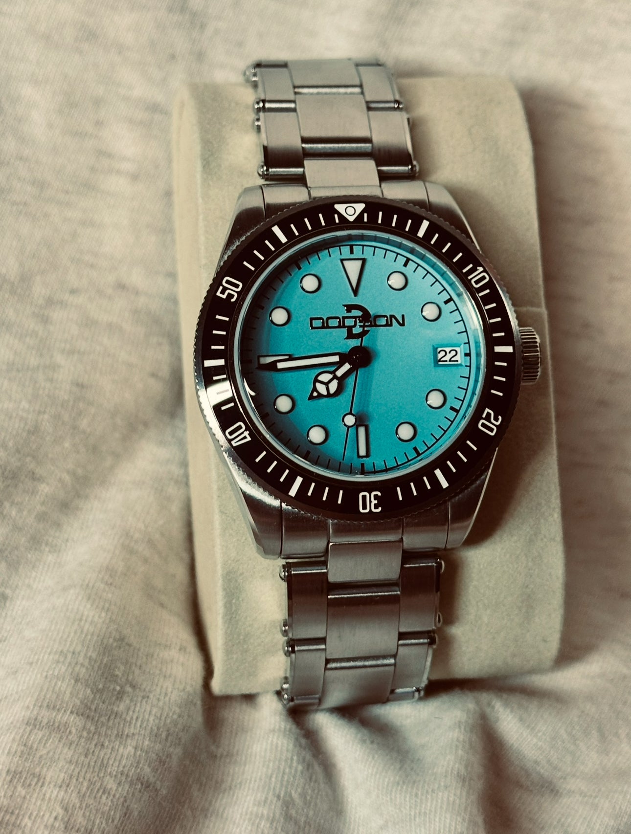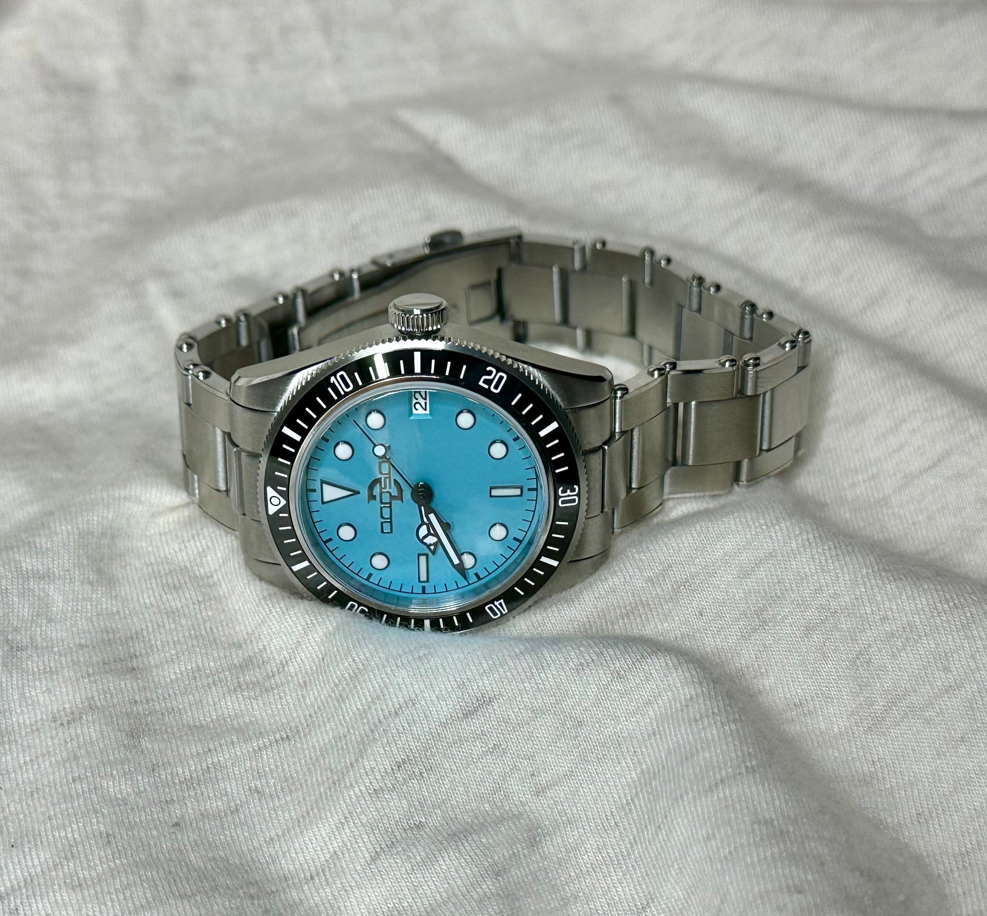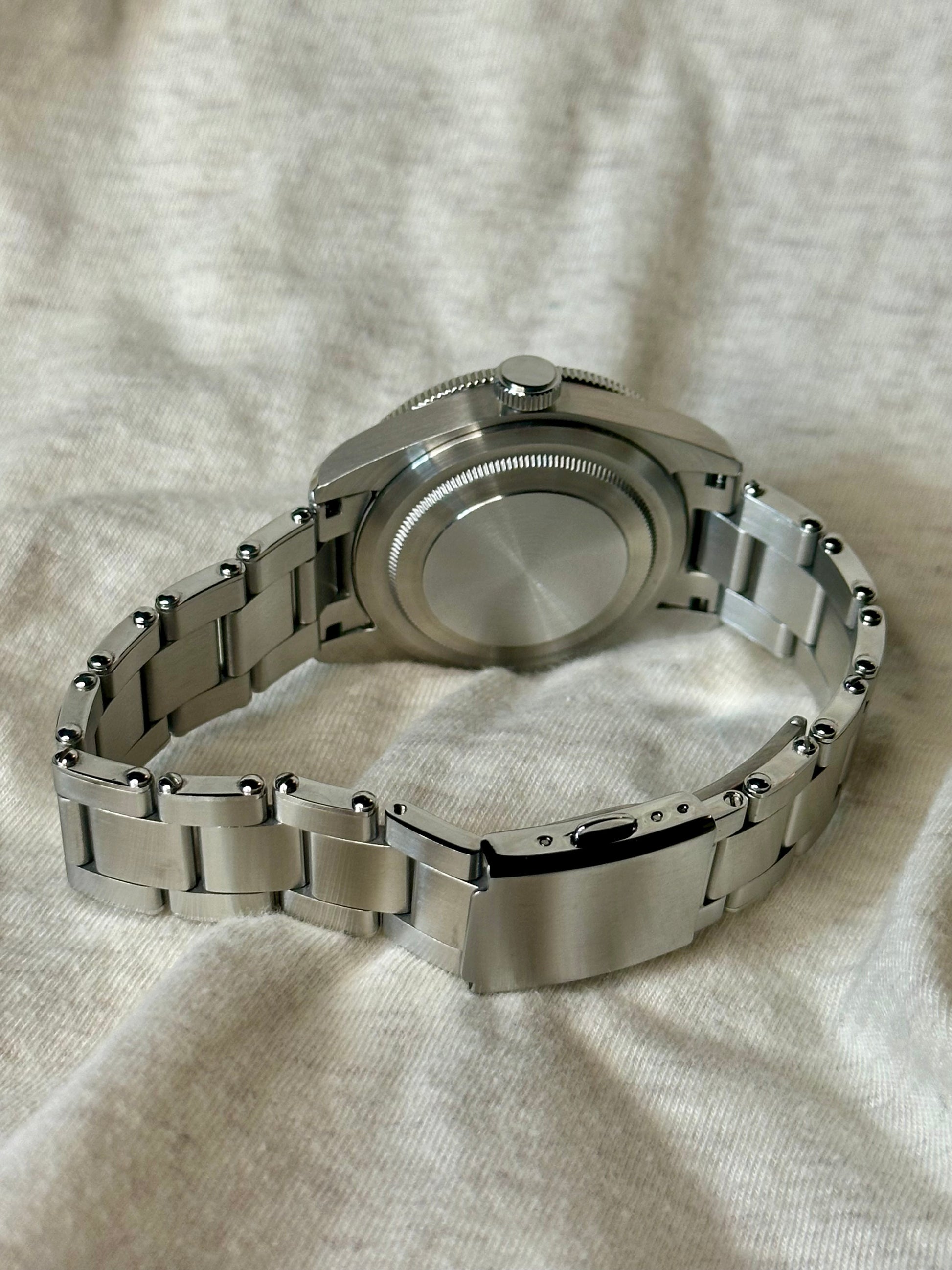 The 39mm vintage style submariner watch boasts a classic design and a sturdy stainless steel rivet bracelet. Its omni directional ceramic bezel and brushed steel finish make it perfect for everyday wear. With its comfortable 39mm size, this dive watch is suitable for any wrist.