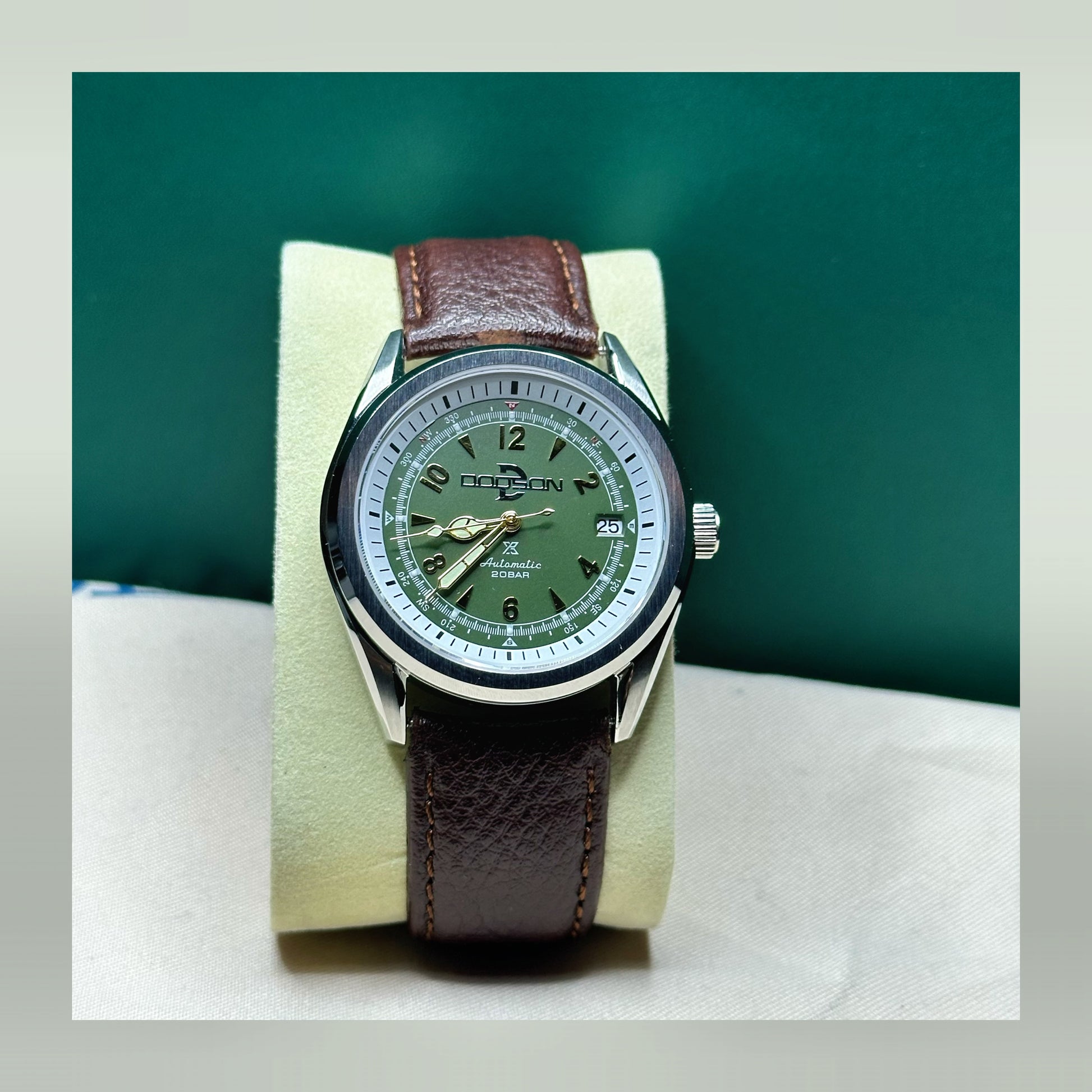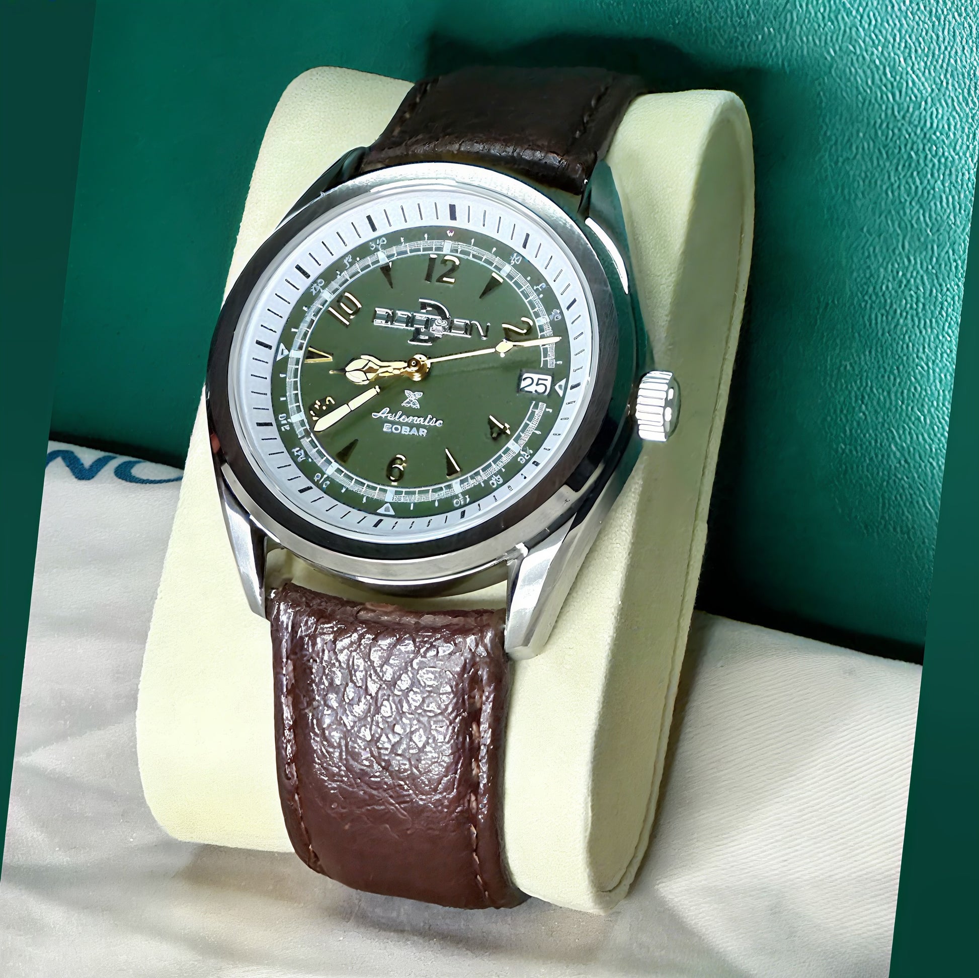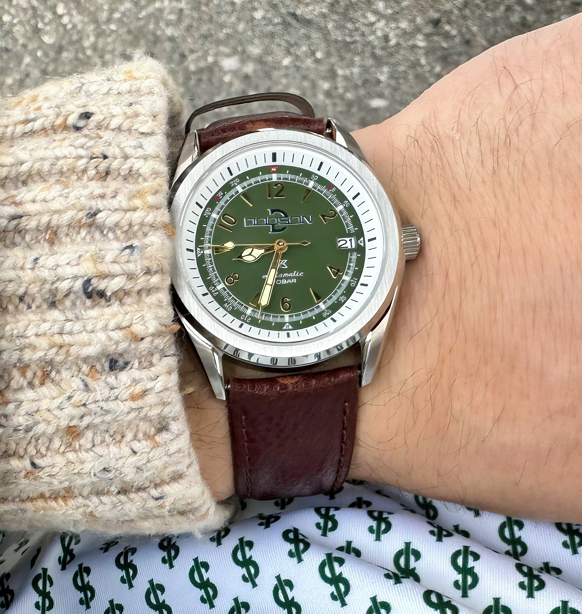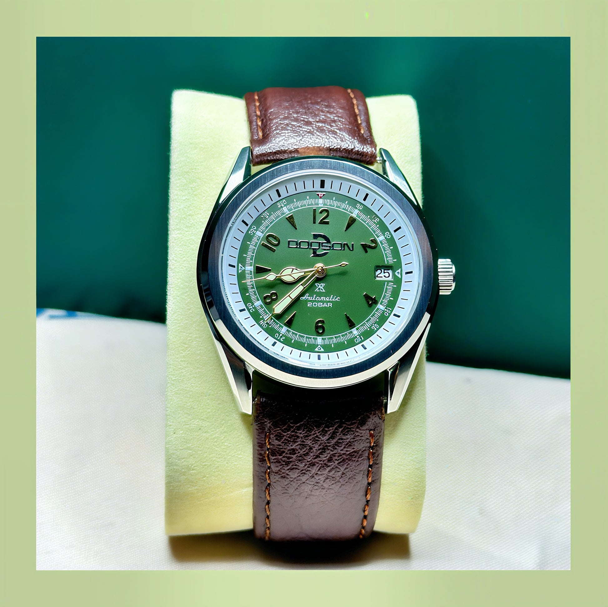 striking green dial with white chapter ring, in a 40mm stainless steel case, screw down crown and a authentic 20mm brown leather strap.