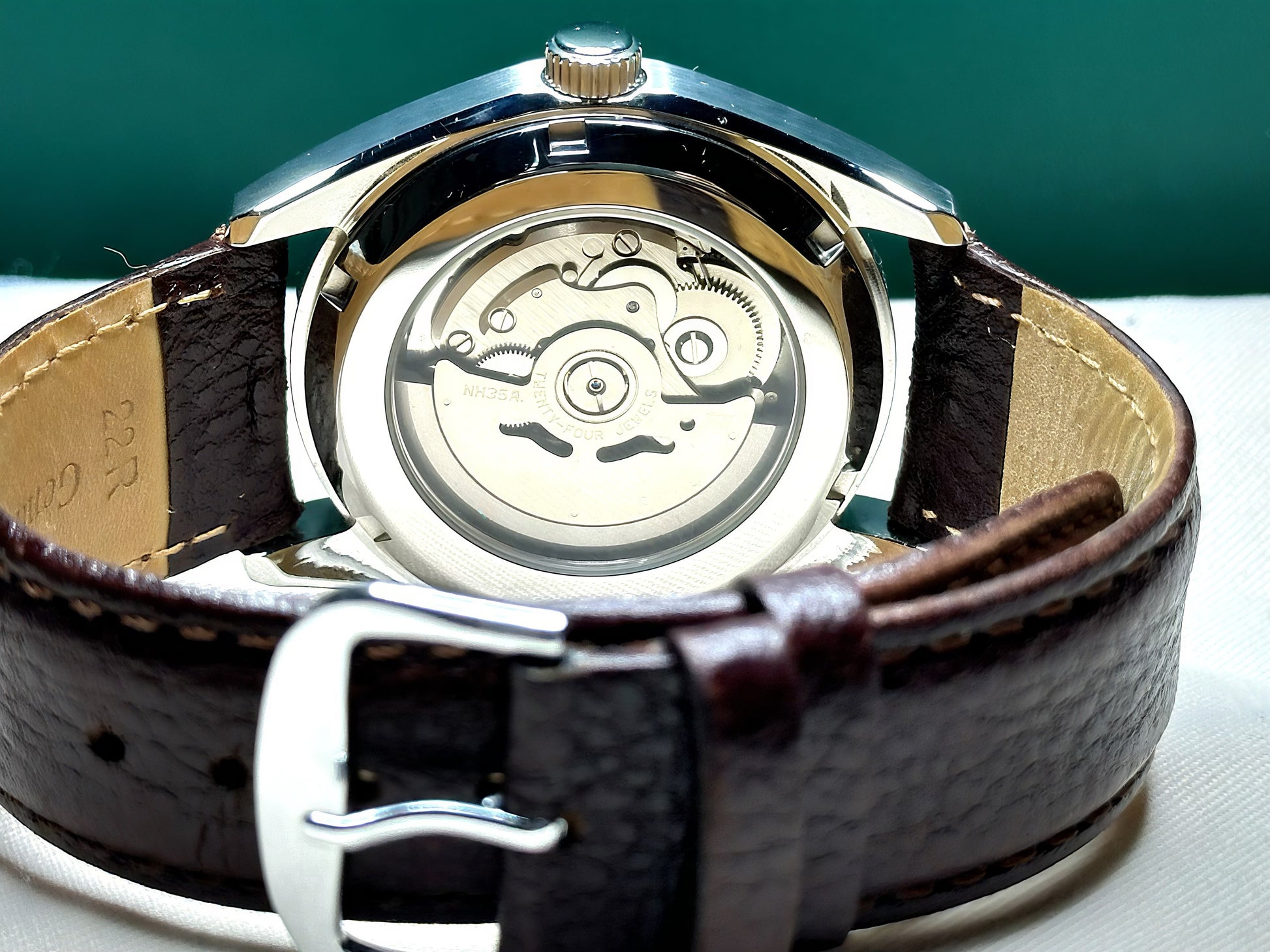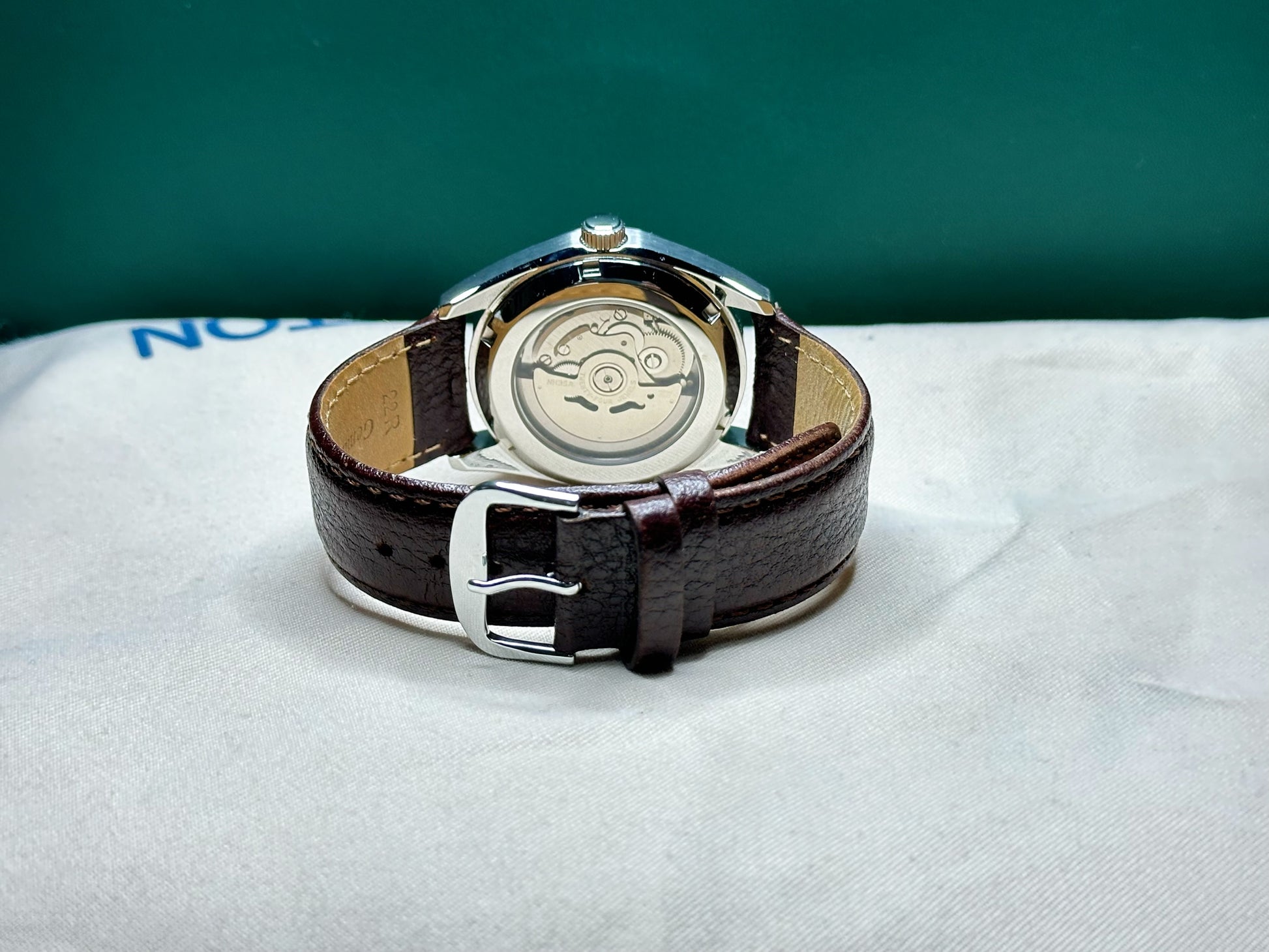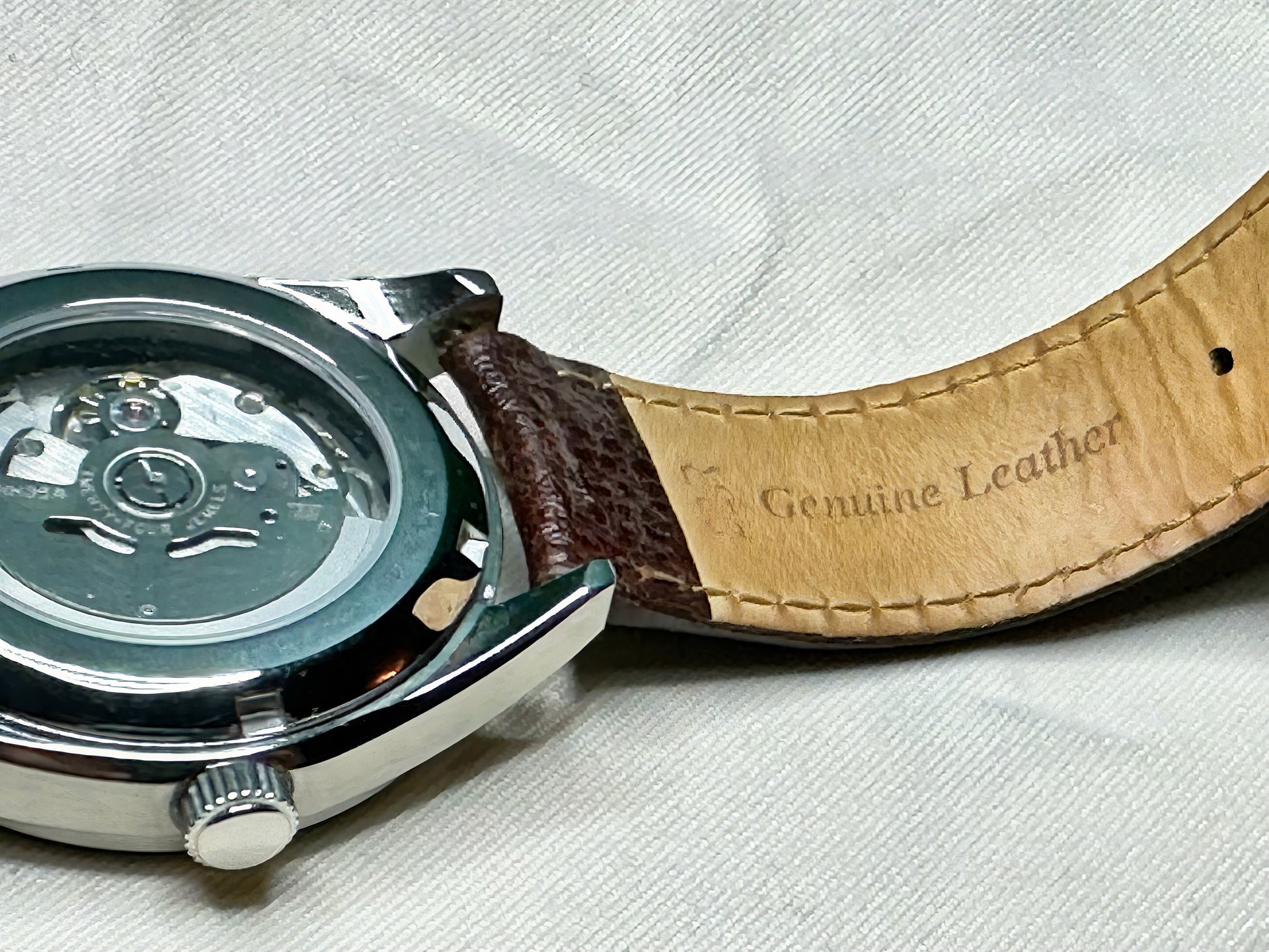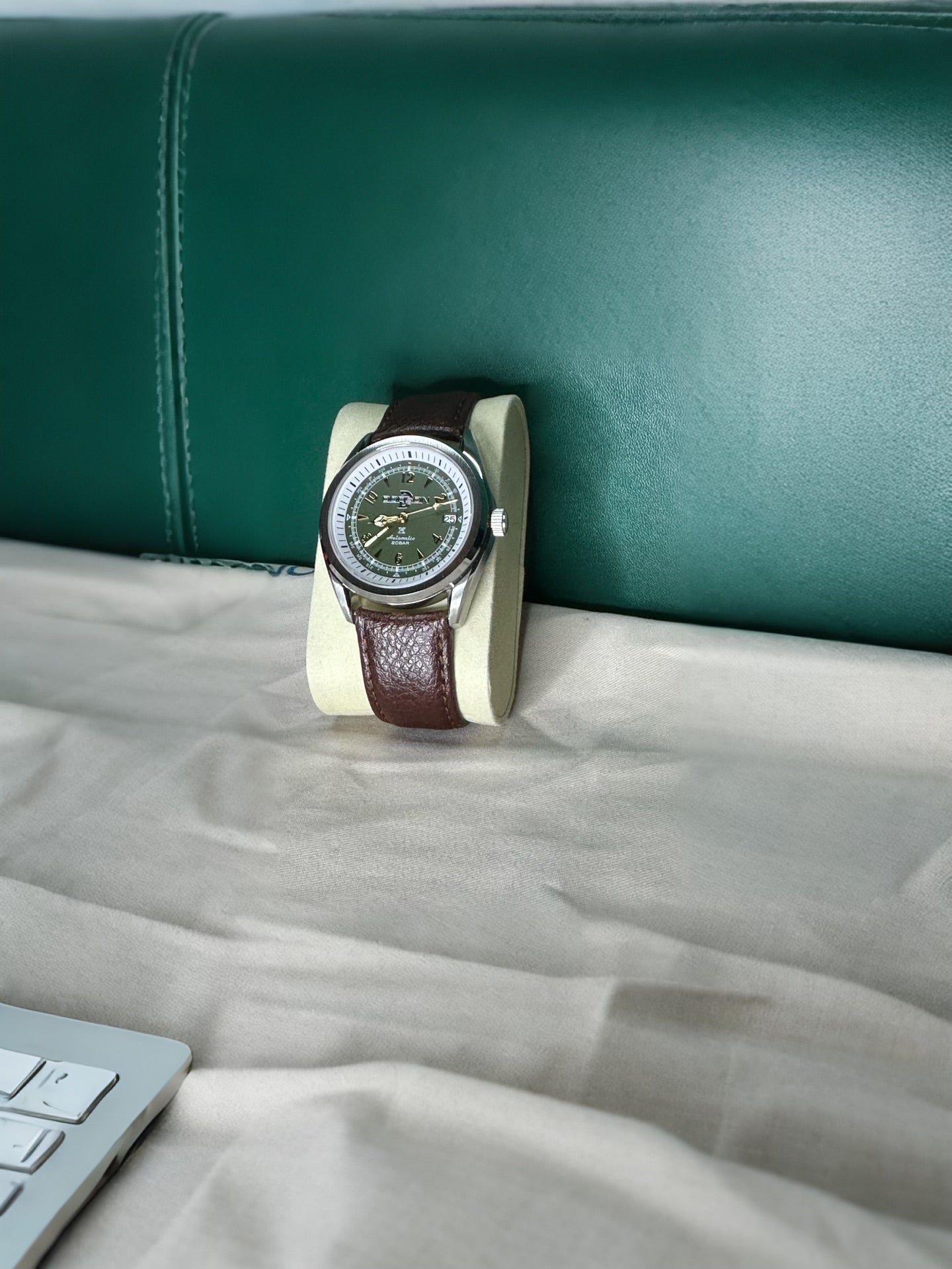striking green dial with white chapter ring, in a 40mm stainless steel case, screw down crown and a authentic 20mm brown leather strap.