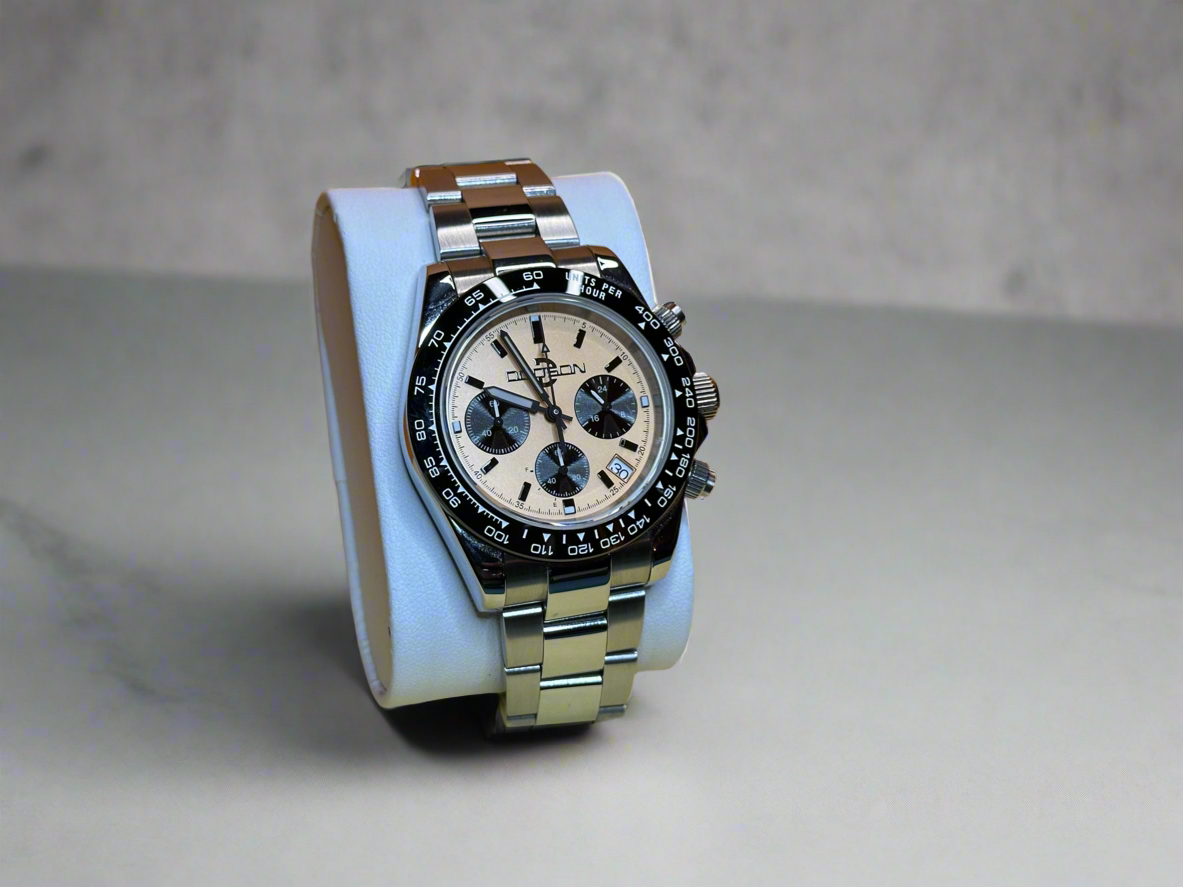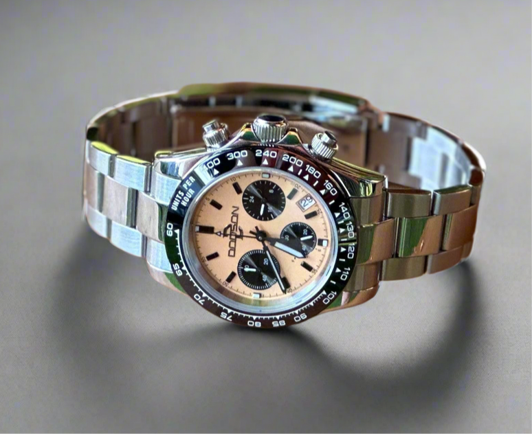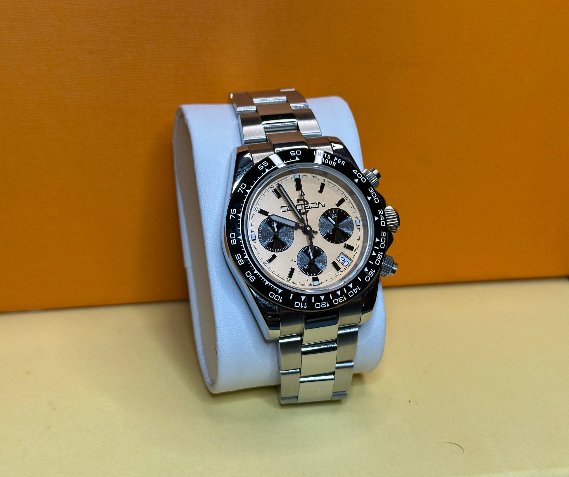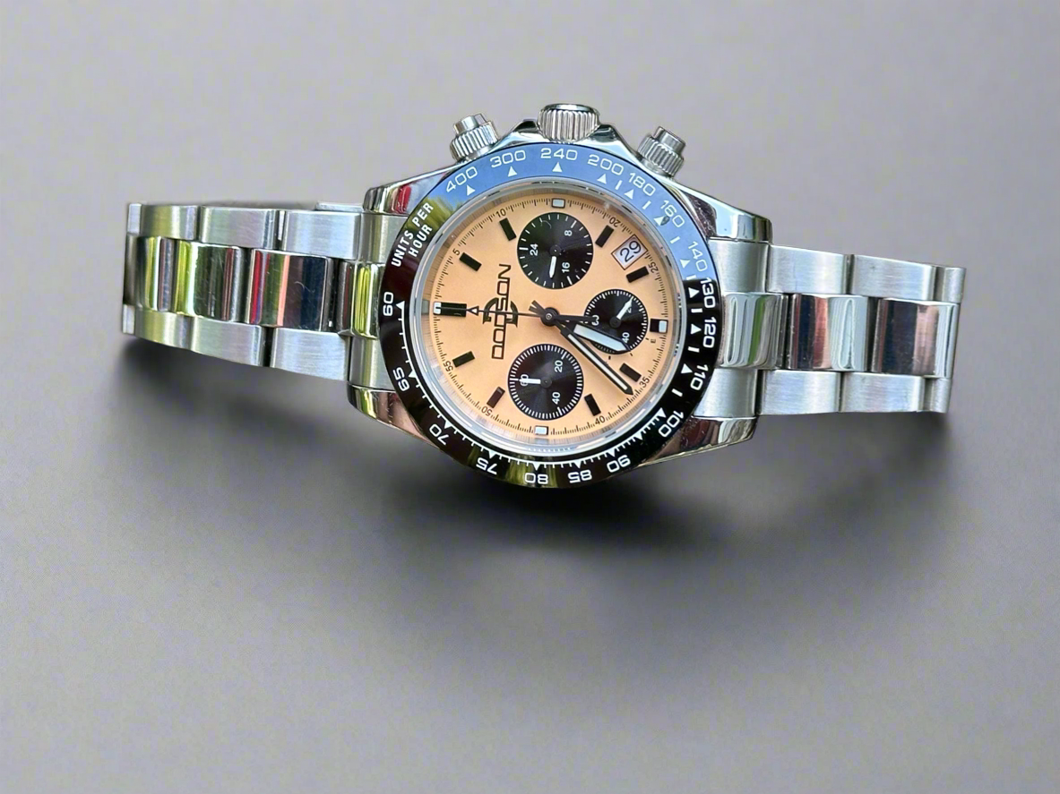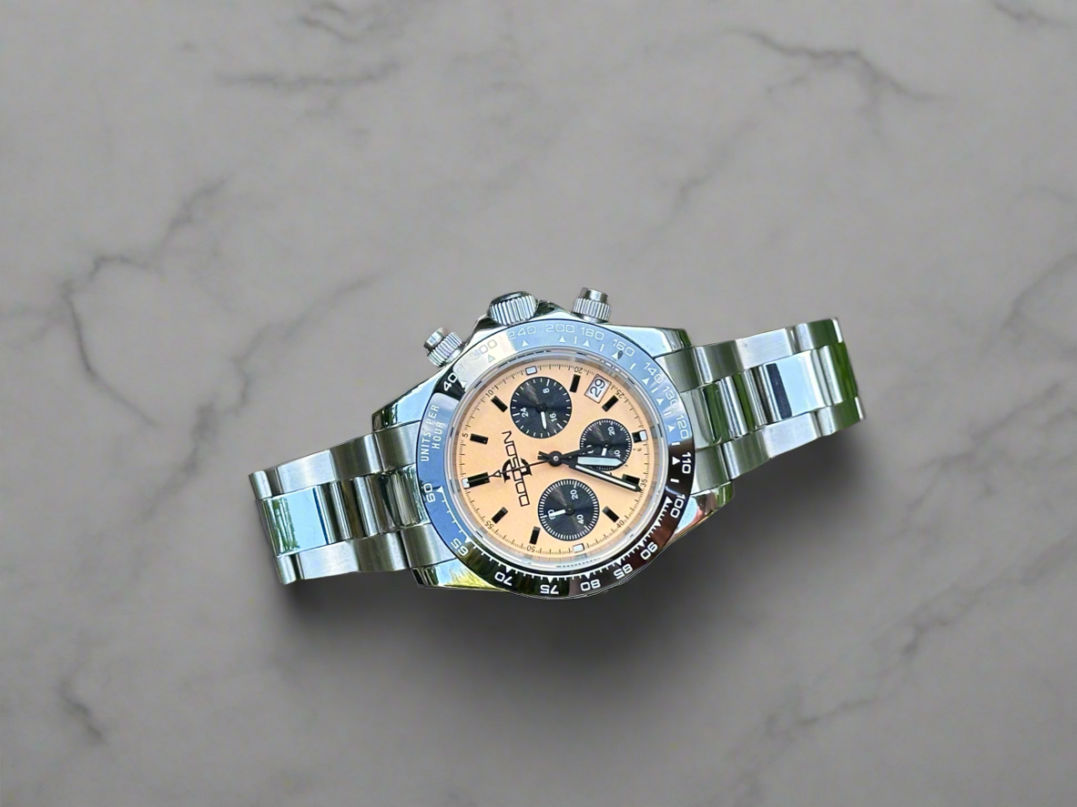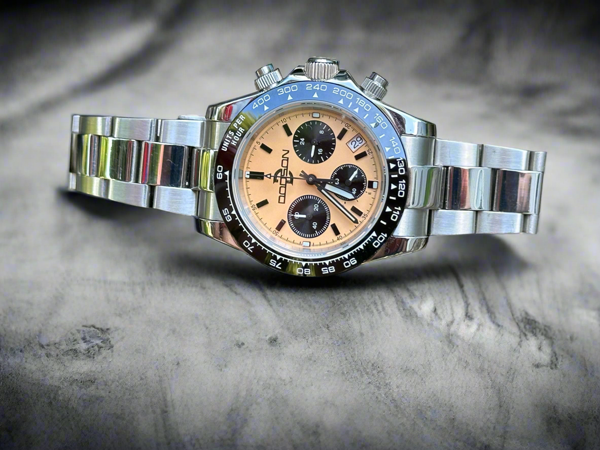 This 40mm Sand Yellow dial Vk63 chronograph boasts a sleek black tachometer and solid stainless steel bracelet with polished center links. Powered by a Japanese mechaquarz VK63 movement, this timepiece offers both style and functionality. An homage to the iconic Daytonas.
