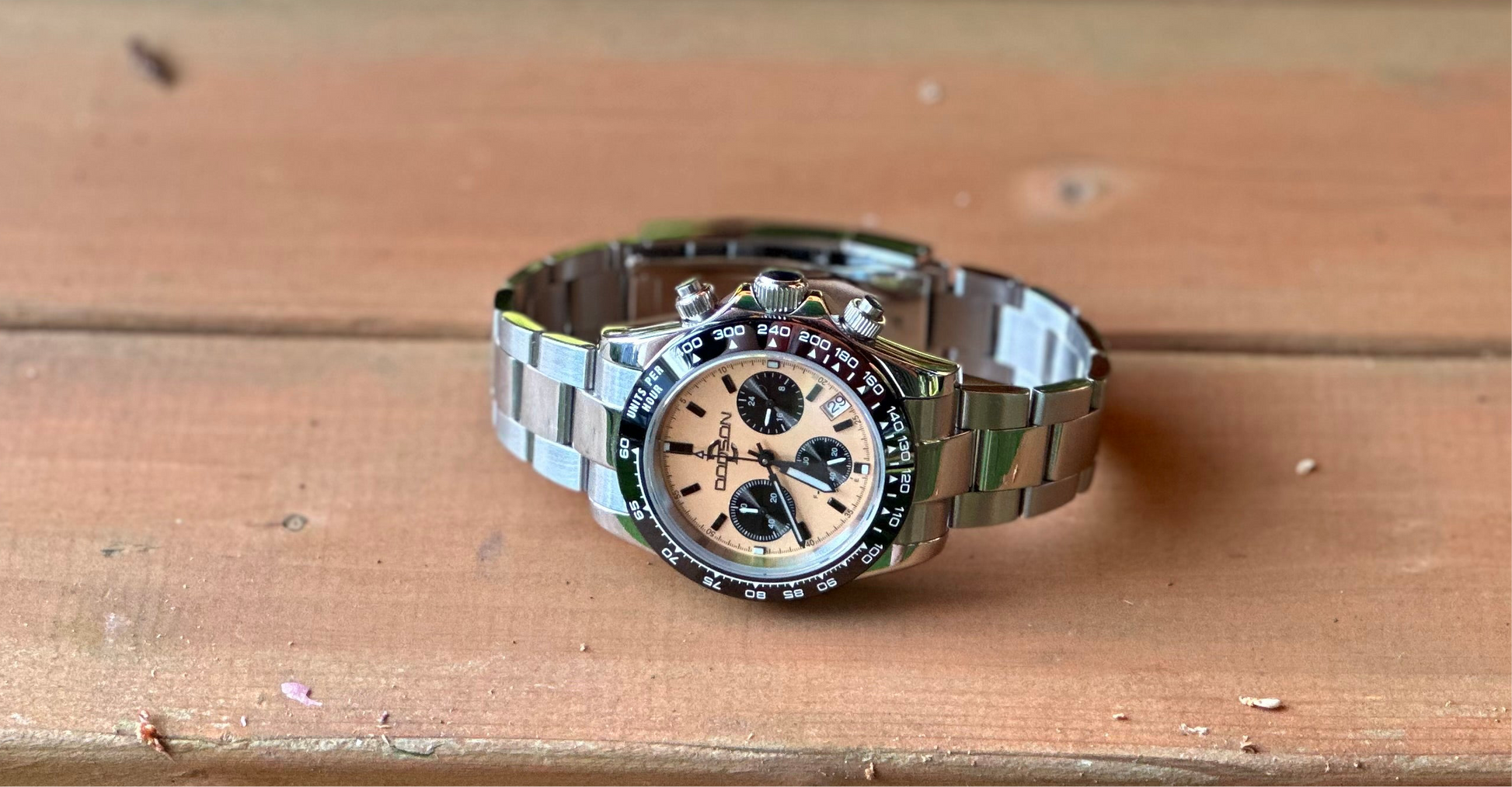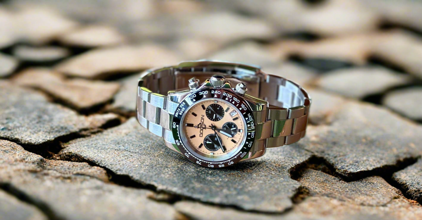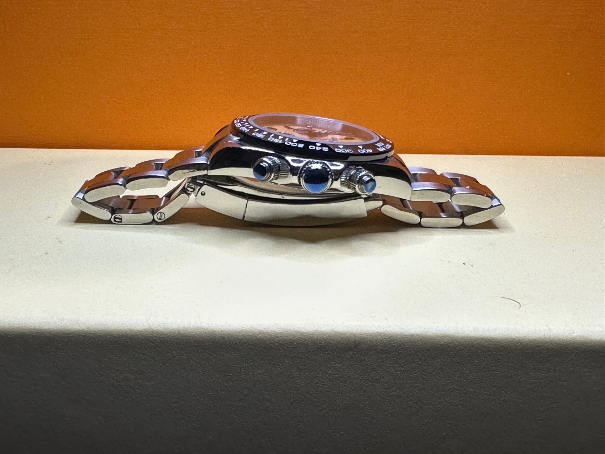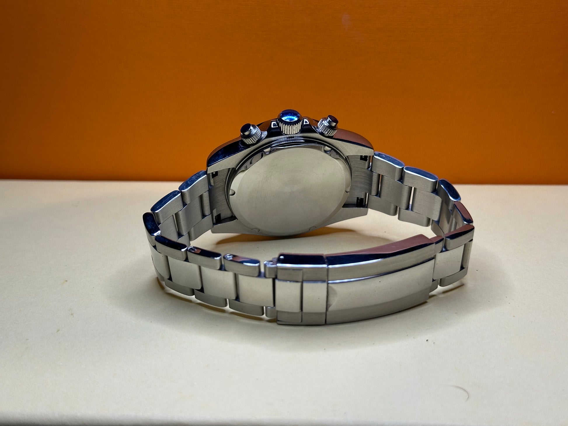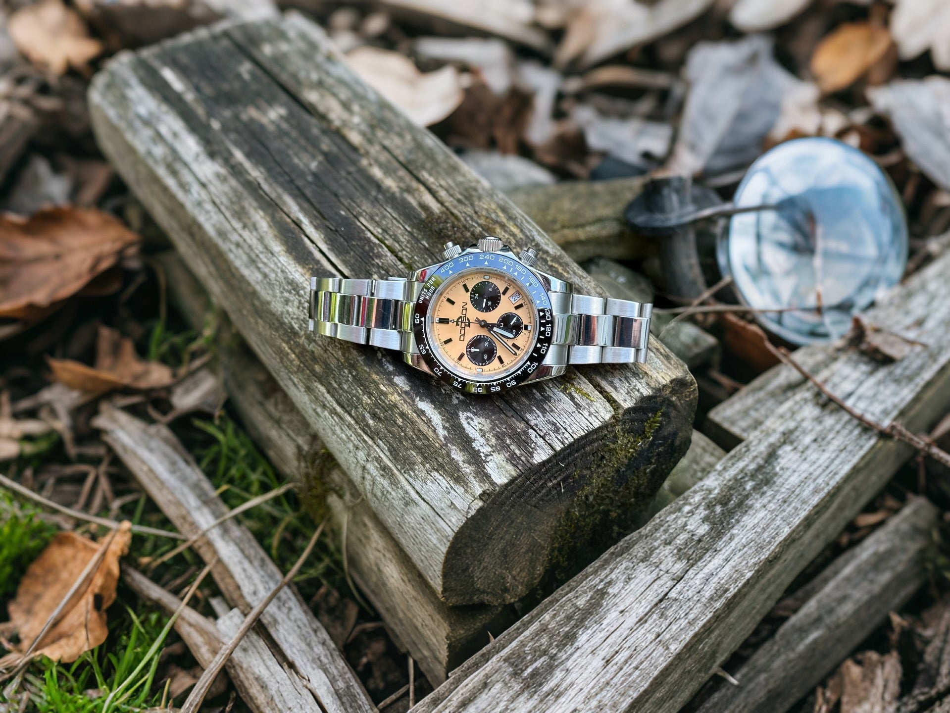 This 40mm Sand Yellow dial Vk63 chronograph boasts a sleek black tachometer and solid stainless steel bracelet with polished center links. Powered by a Japanese mechaquarz VK63 movement, this timepiece offers both style and functionality. An homage to the iconic Daytonas.