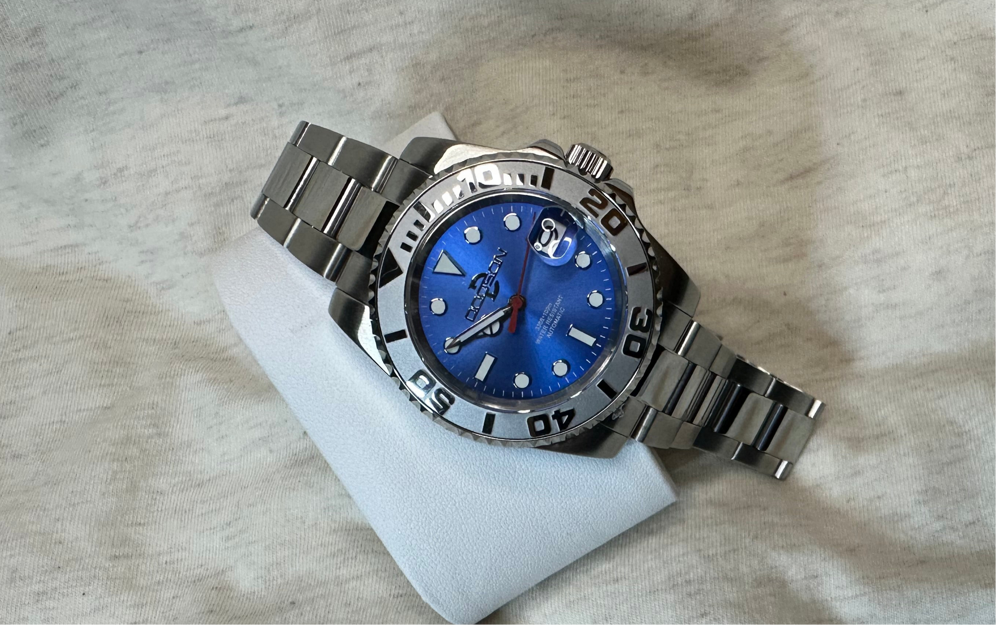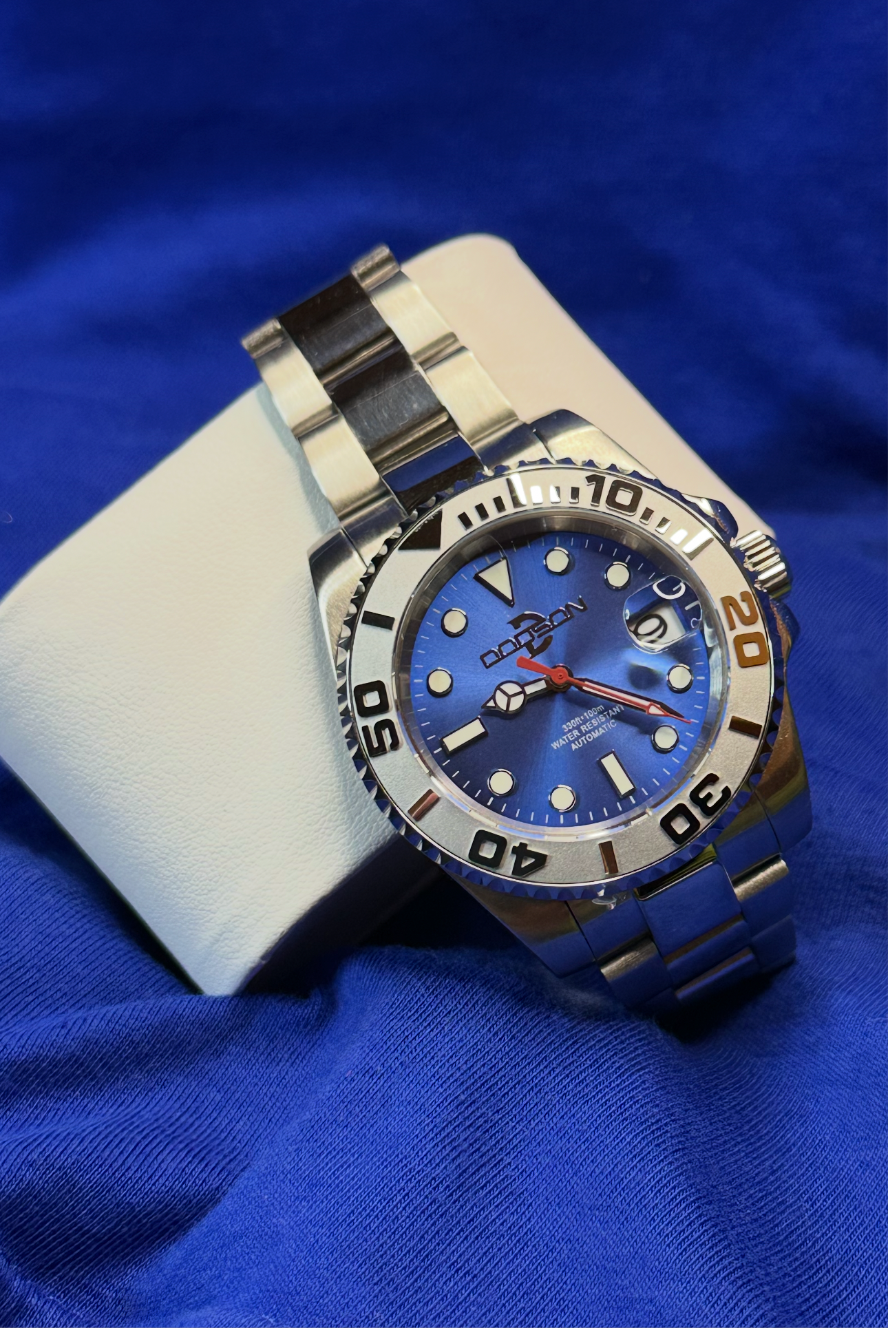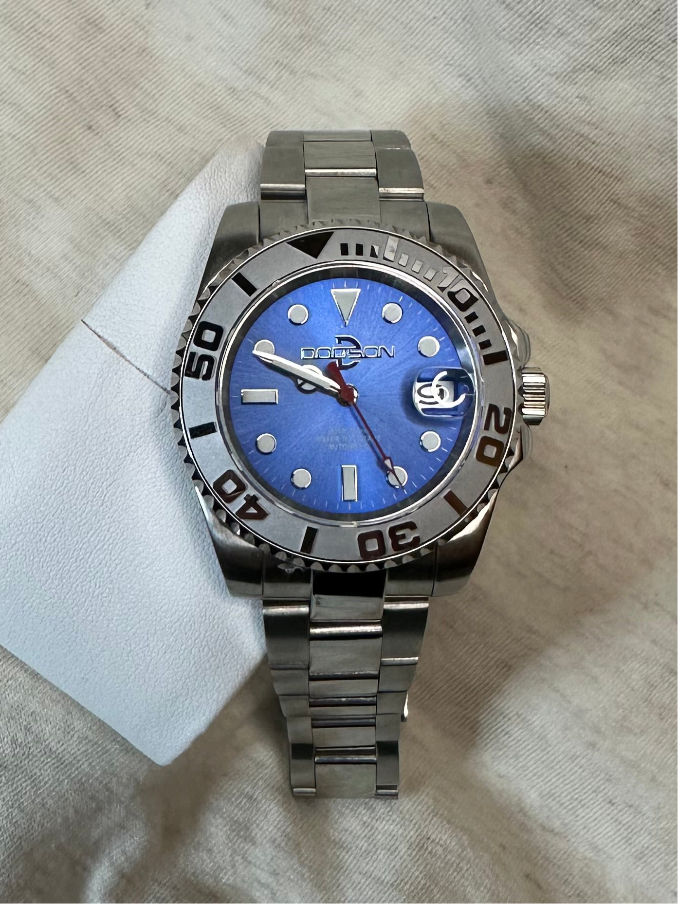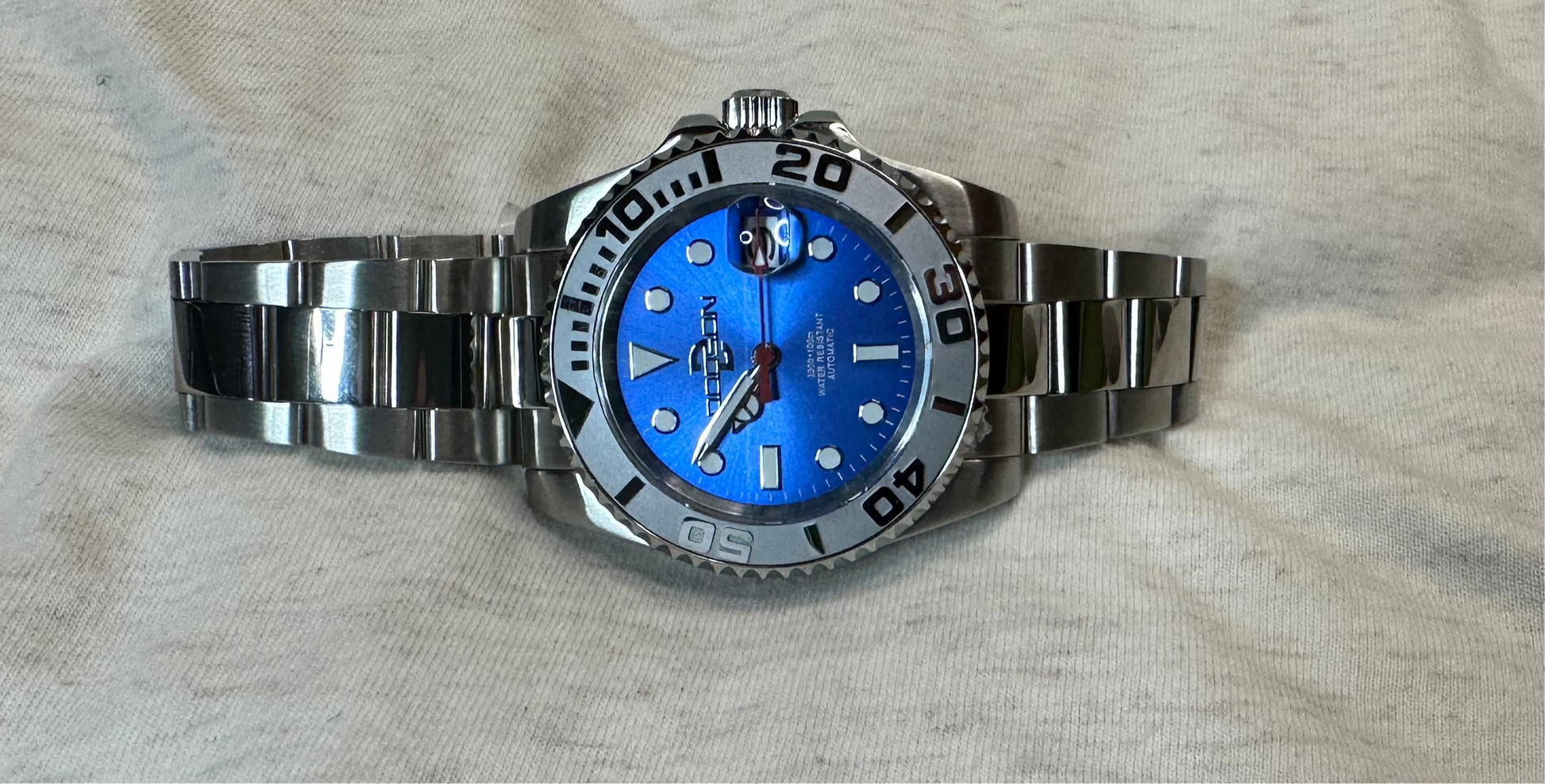40mm Silver bezel, Blue dial yacht master , beautiful blue sunburst dial , a sapphire crystal and alloy omnidirectional dive bezel. striking red ,sweeping second hand, on the fly adjustable glide lock clasp. Solid end link stainless