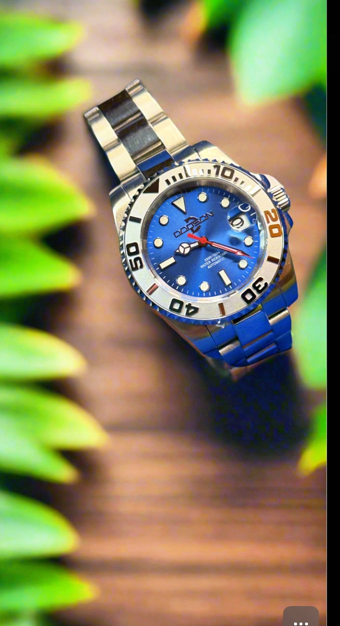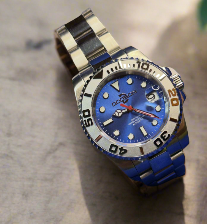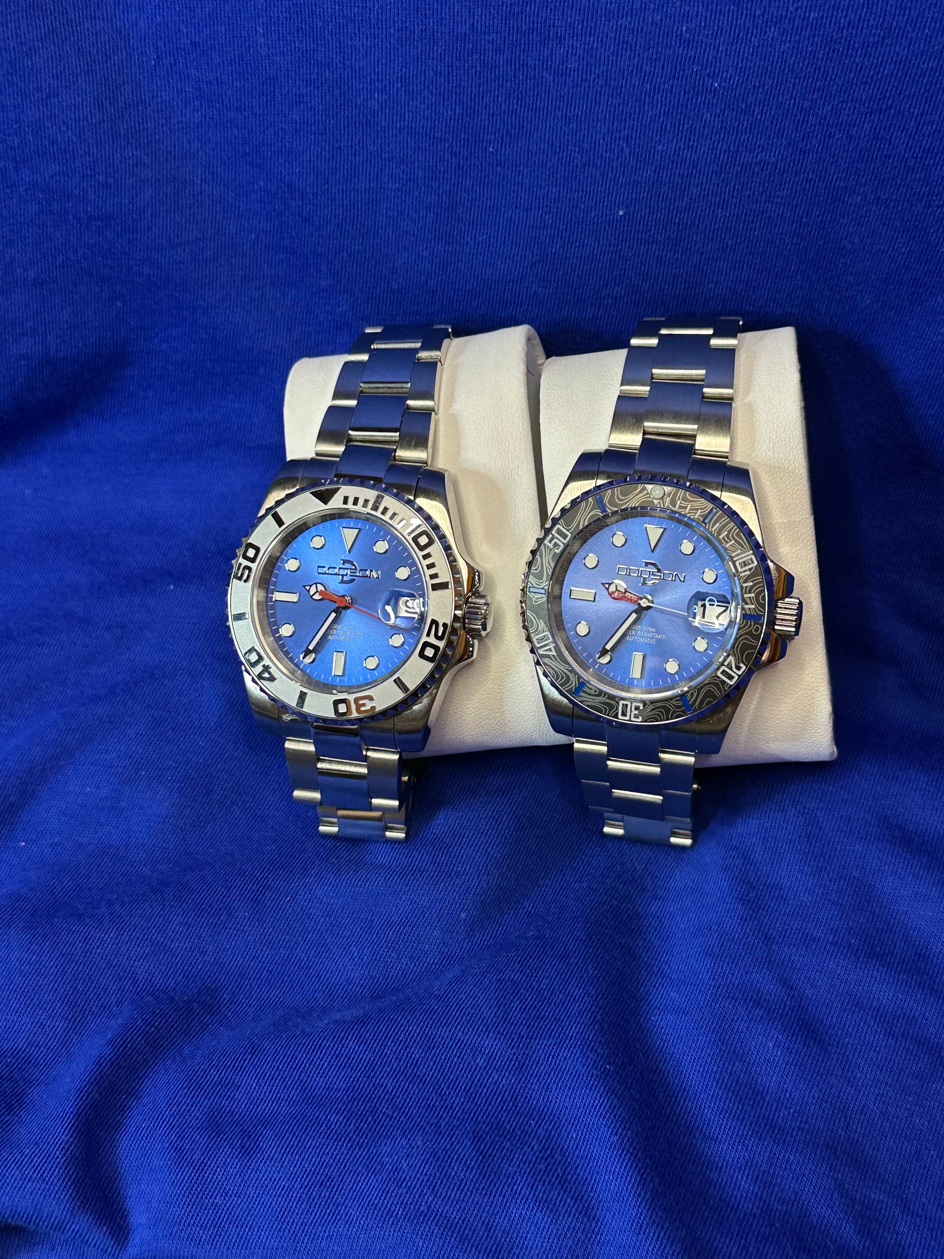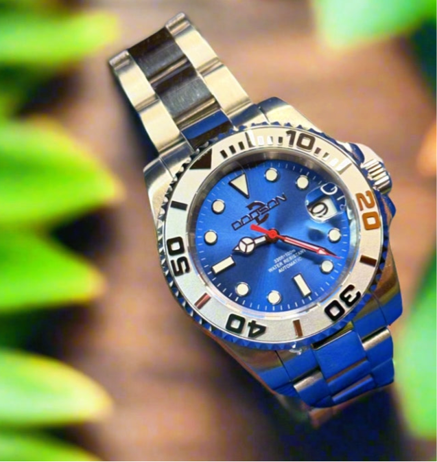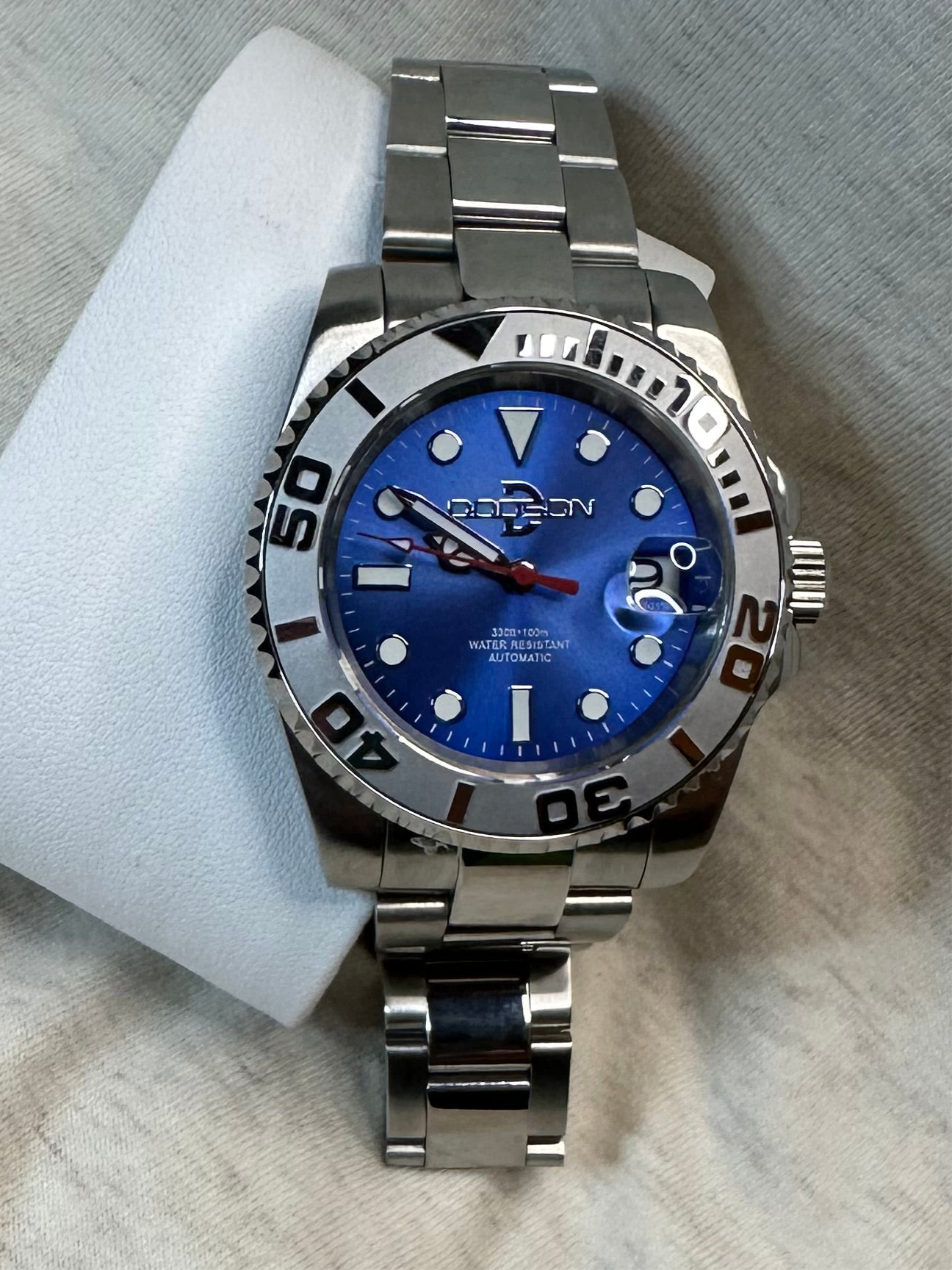 40mm Silver bezel, Blue dial yacht master , beautiful blue sunburst dial , a sapphire crystal and alloy omnidirectional dive bezel. striking red ,sweeping second hand, on the fly adjustable glide lock clasp. Solid end link stainless