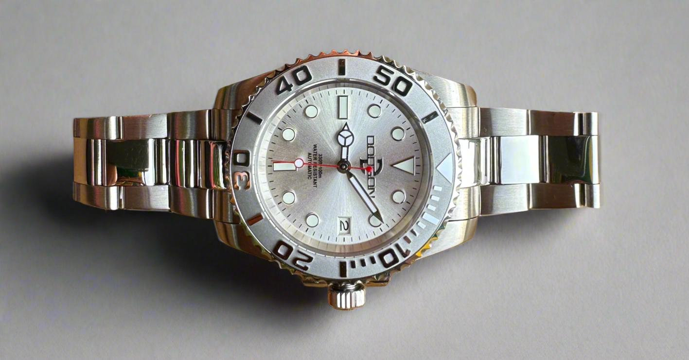 classic dive watch design , beautiful silver dial and bezel combination with a standout red second hand, sapphire crystal and screw down crown, on the fly micro adjustable stainless steel clasp and solid polished center link bracelet