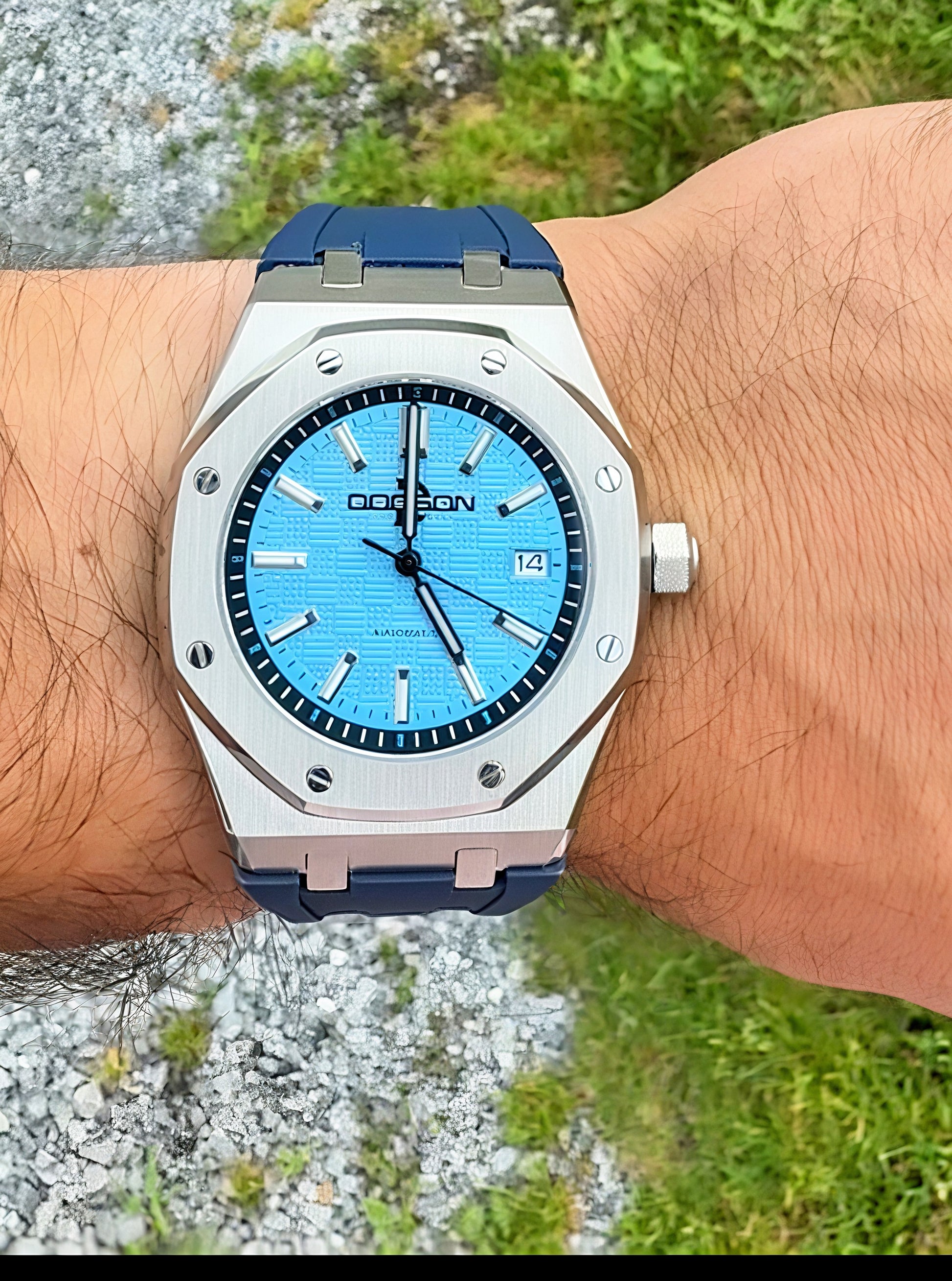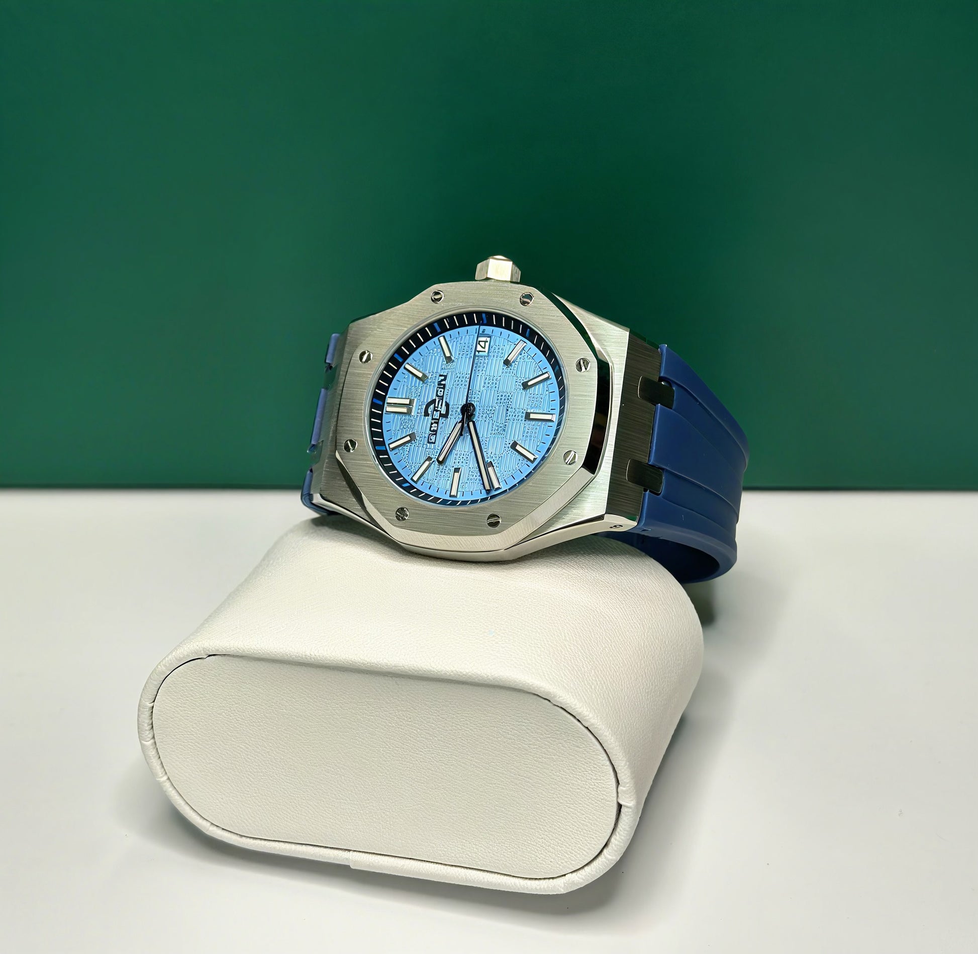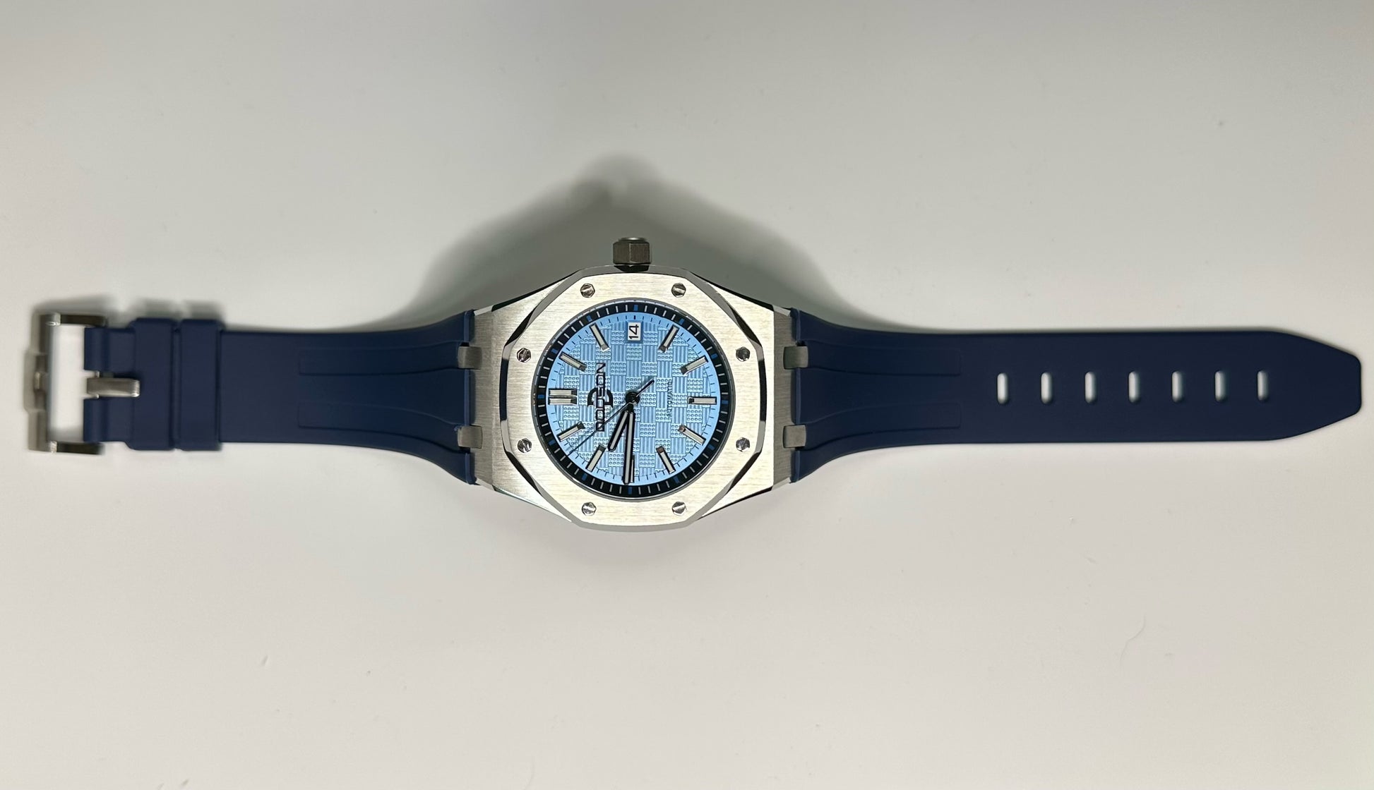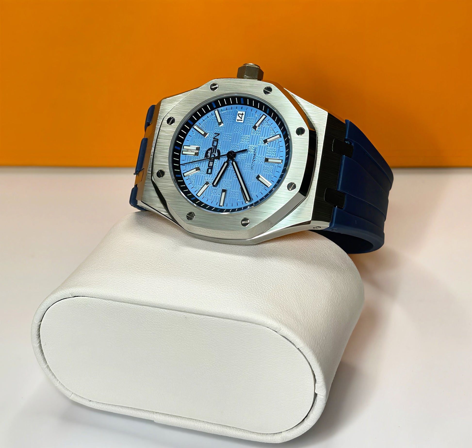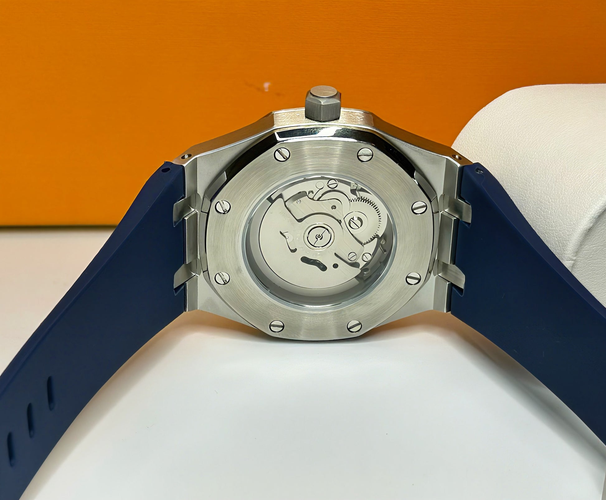 This timepiece features an octagonal bezel with exposed screws and a finely brushed integrated bracelet, capturing the bold geometry and refined craftsmanship of classic luxury sports watches. Its textured dial adds depth and detail, complemented by slim baton-style hour markers and a precise automatic movement visible through the exhibition caseback. Built from solid stainless steel and finished with alternating polished and brushed surfaces, it offers both everyday durability and an unmistakably elegant wrist presence.