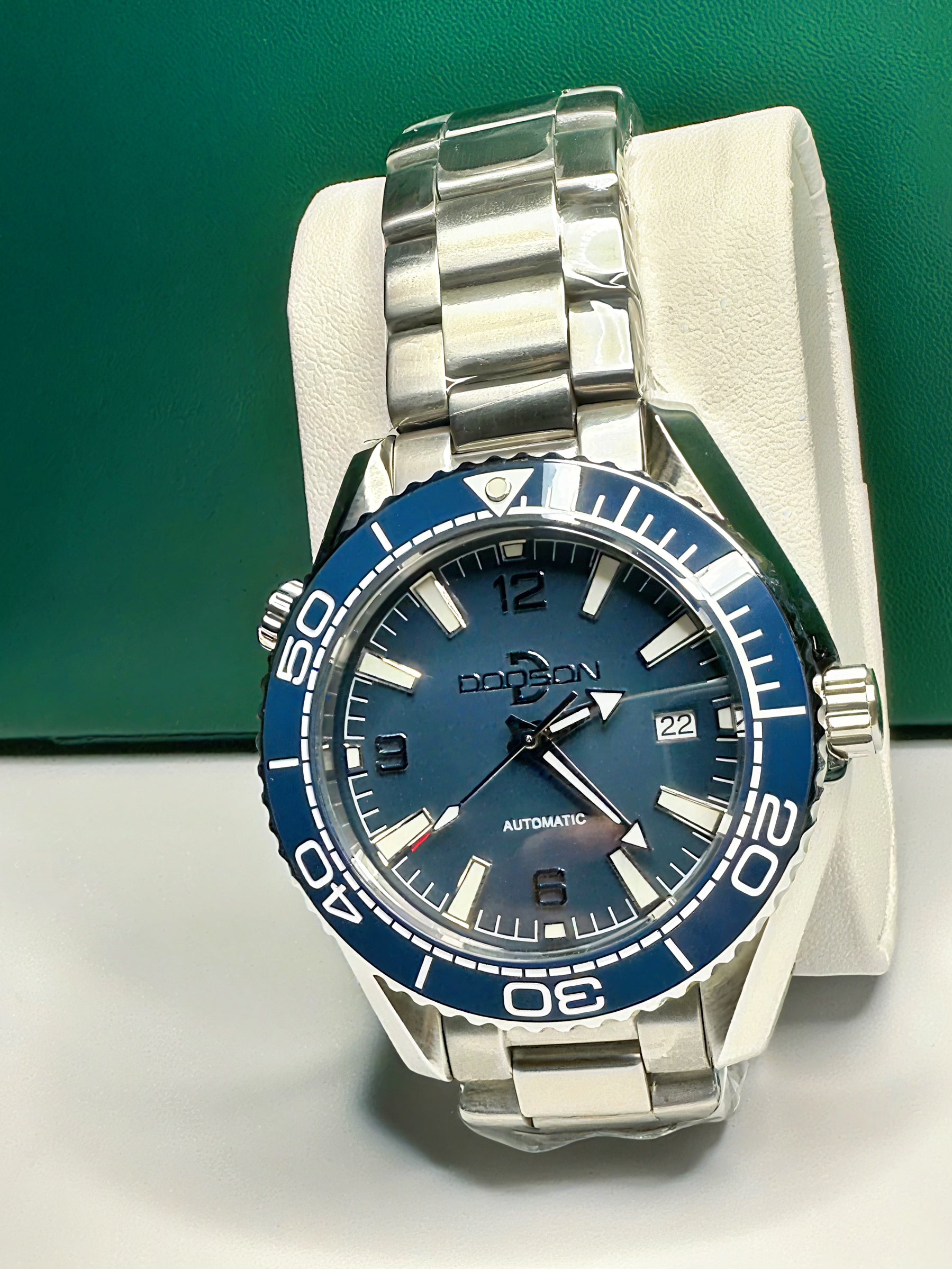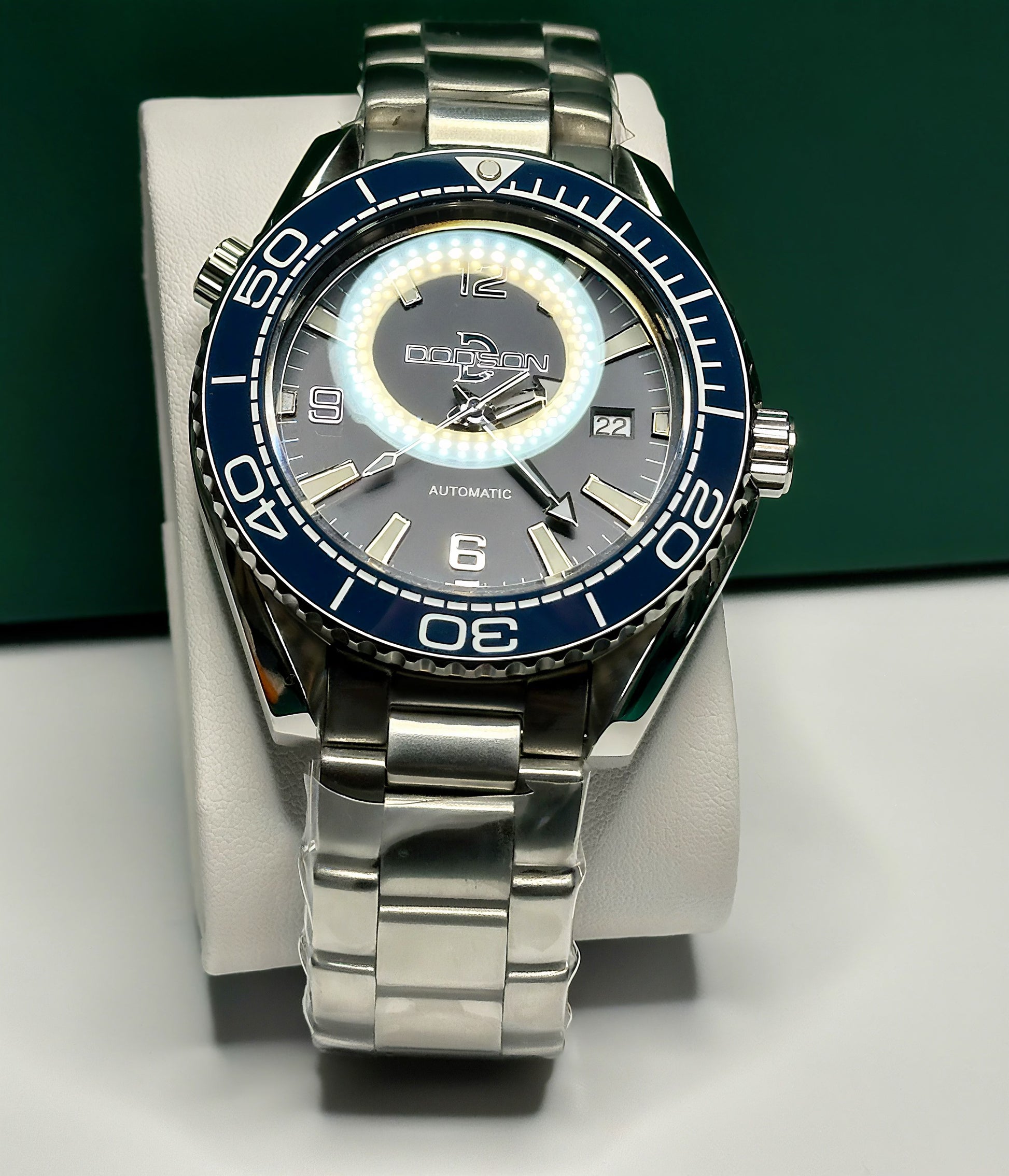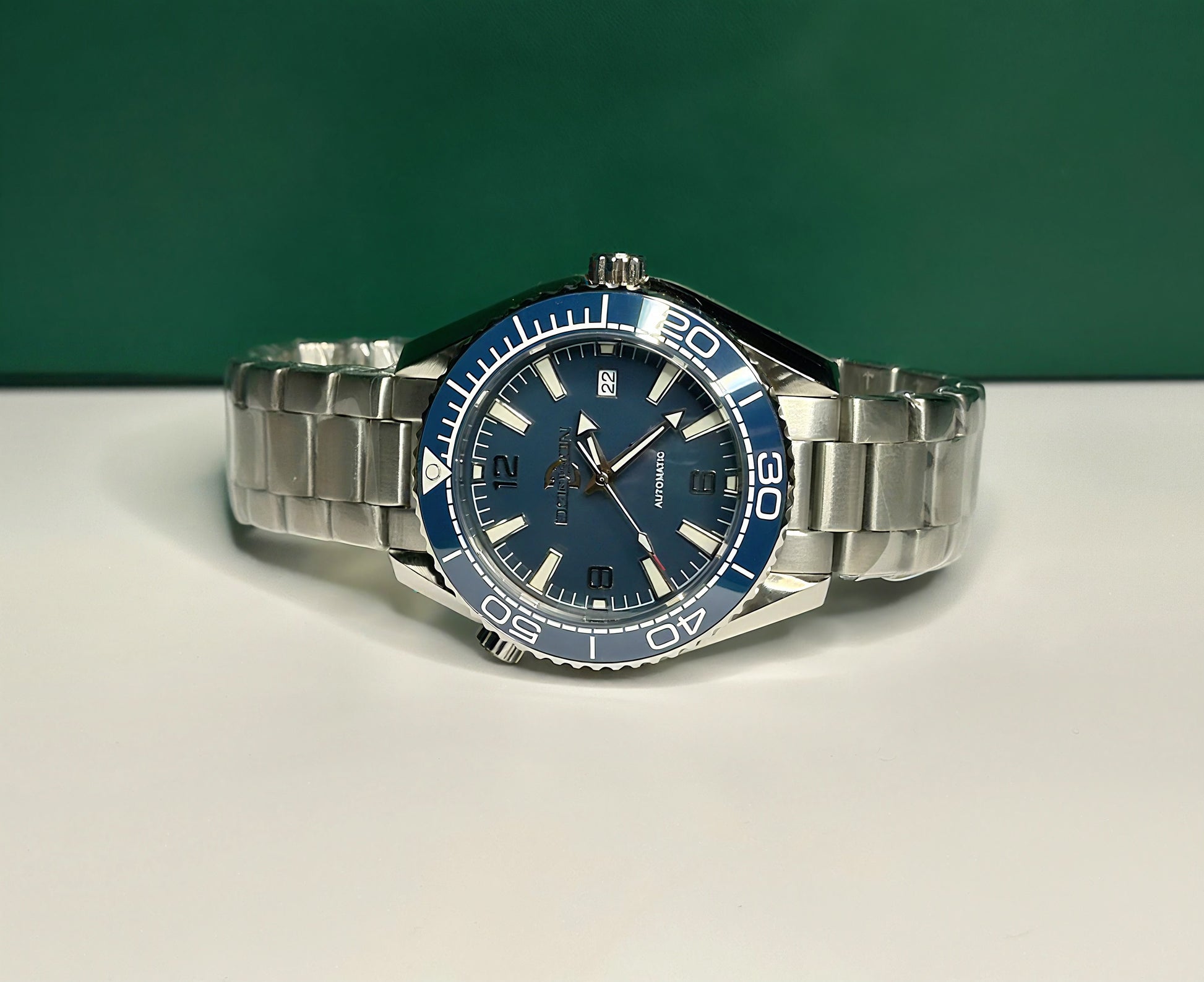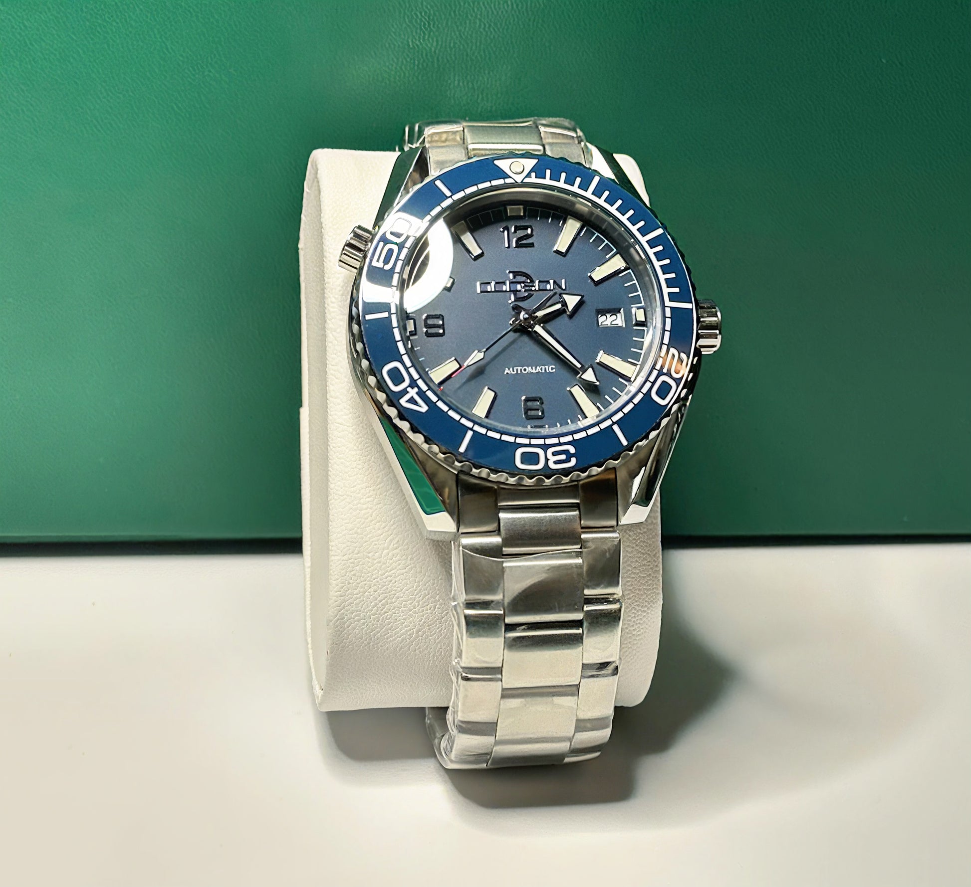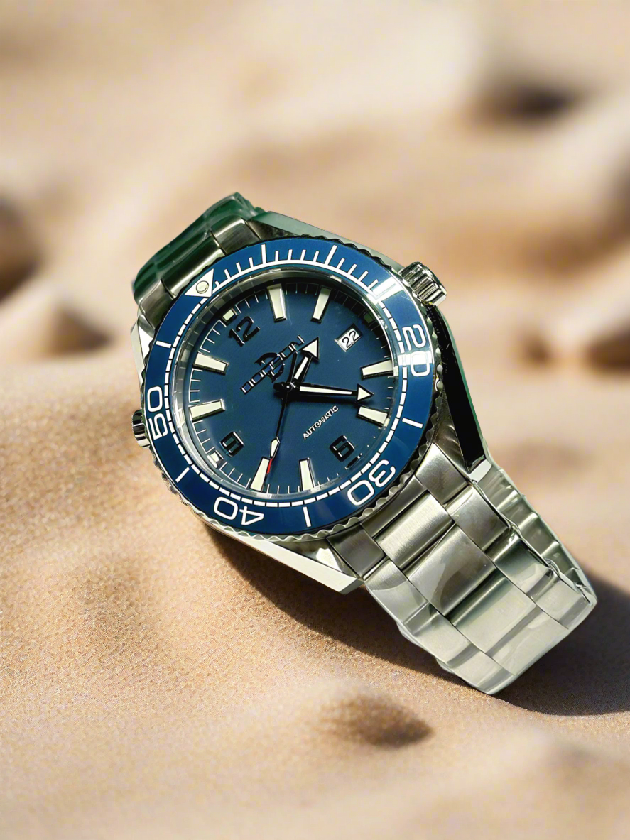 Striking blue dial and blue ceramic Omni directional bezel on beautiful solid stainless steel bracelet with dive suit extension built into the clasp