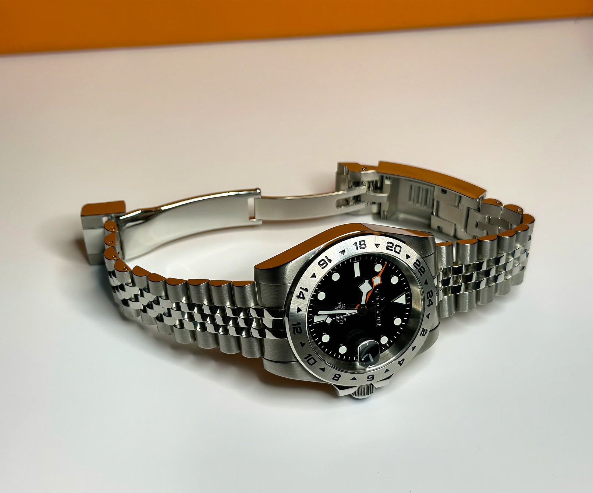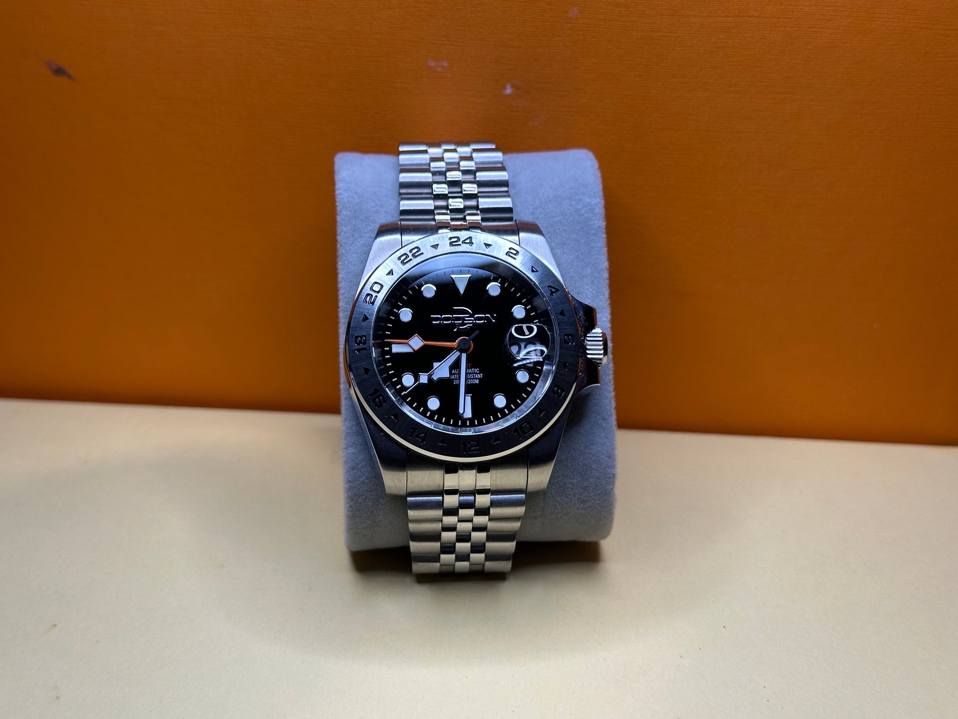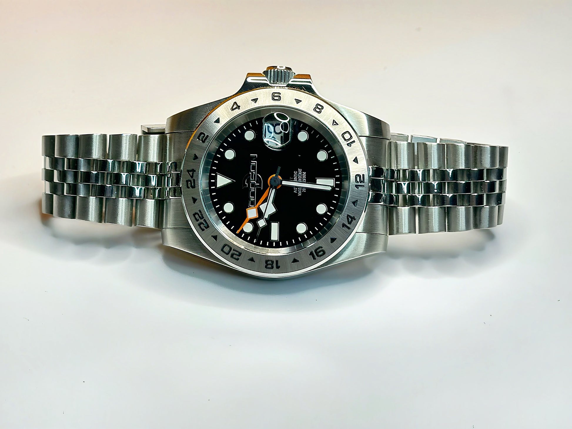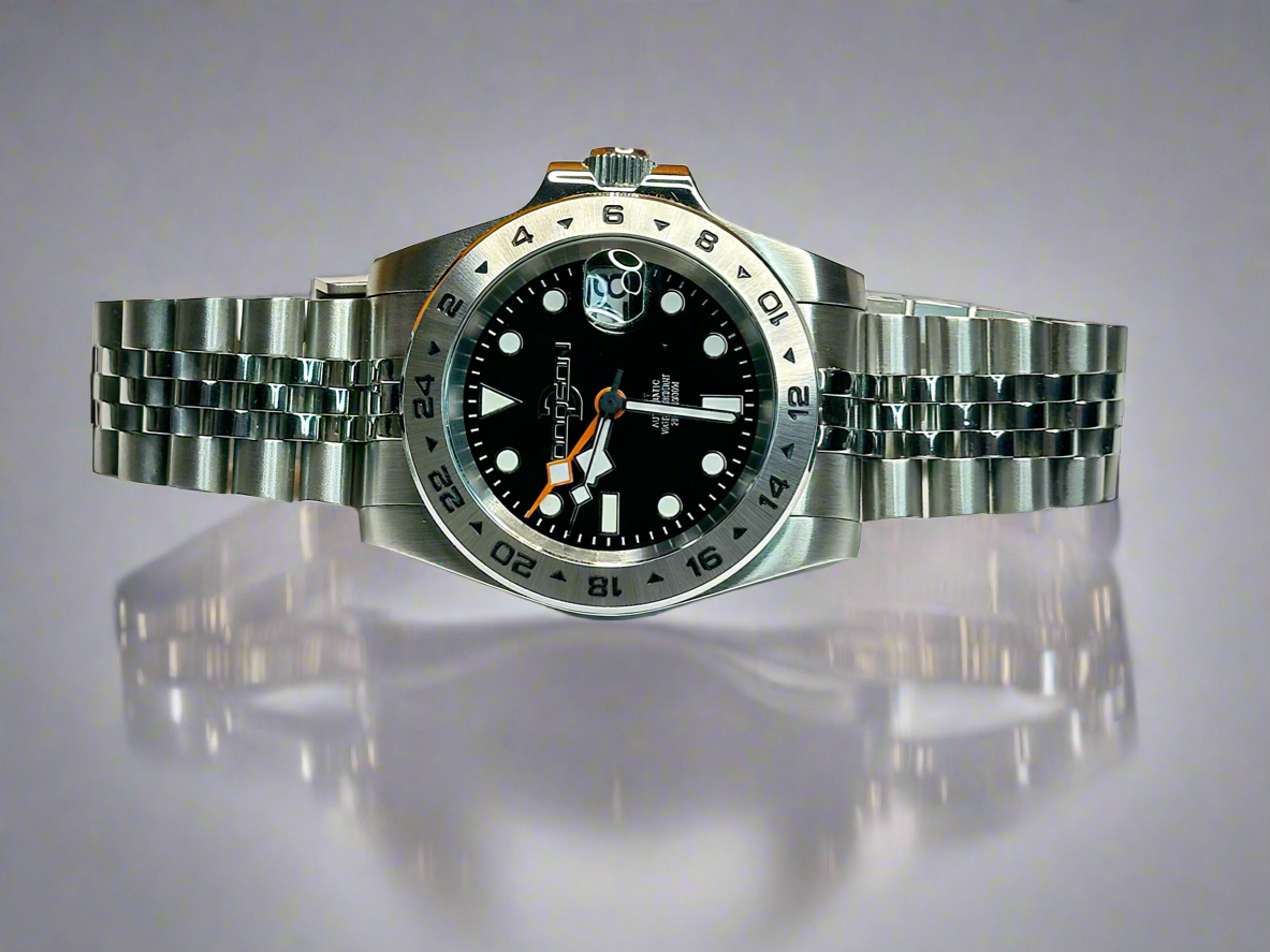 This is a true GMT watch with a striking Black dial, powered by the seiko NH34 and is on a jubilee bracelet, a Homage to a legendary watch. It is the perfect fusion of luxury and precision. Featuring an automatic NH34 movement and GMT bezel, this watch allows you to track multiple time zones with ease. Its exhibition case-back and sapphire crystal offer a glimpse into the intricate workings of the watch. With a solid stainless steel jubilee bracelet and screw down crown, this watch is built to last. Elevate your style and functionality with this Explorer 2 black dial true GMT watch. A perfect “every day watch” looks great for every occasion and compliments any outfit.