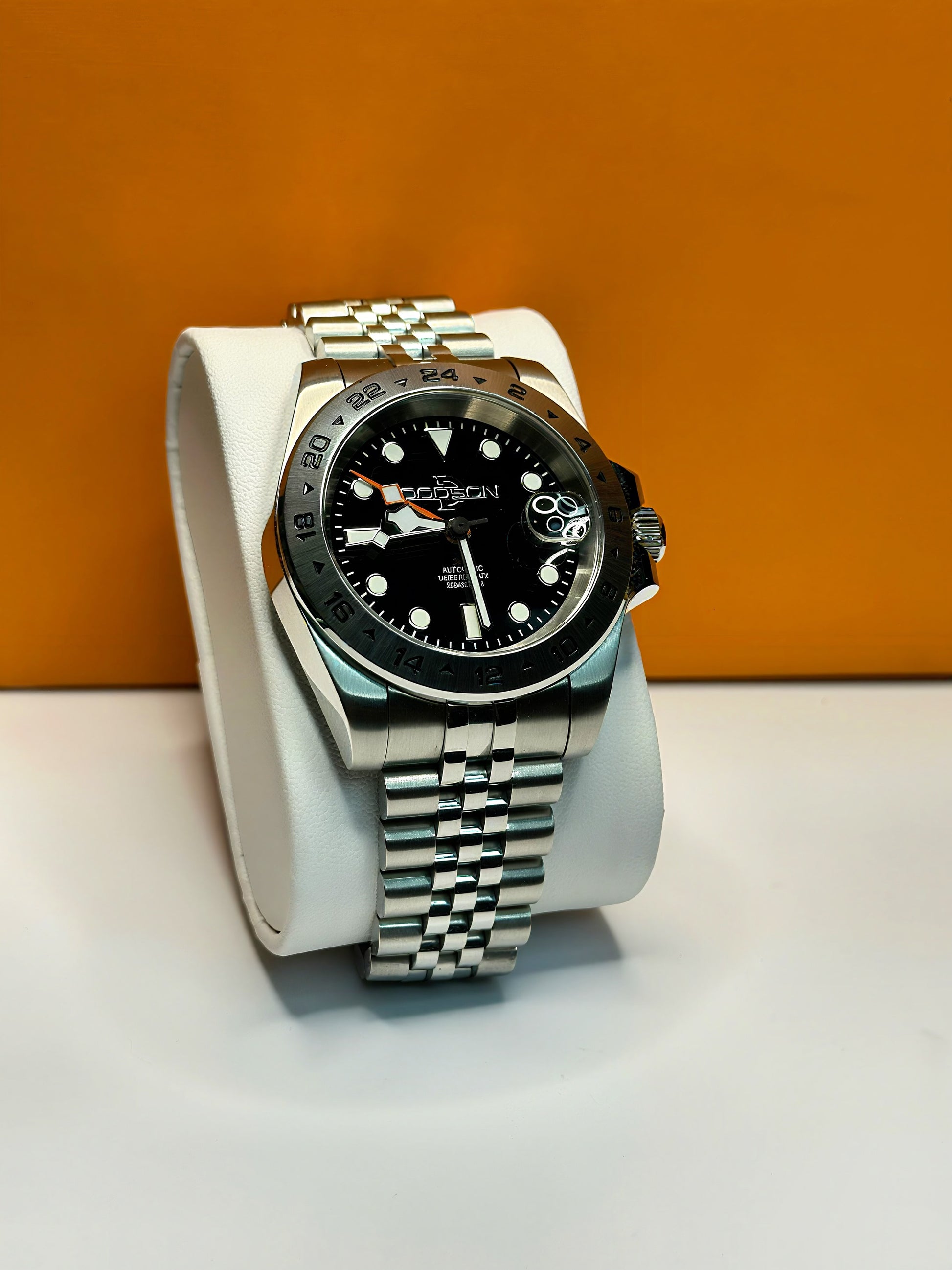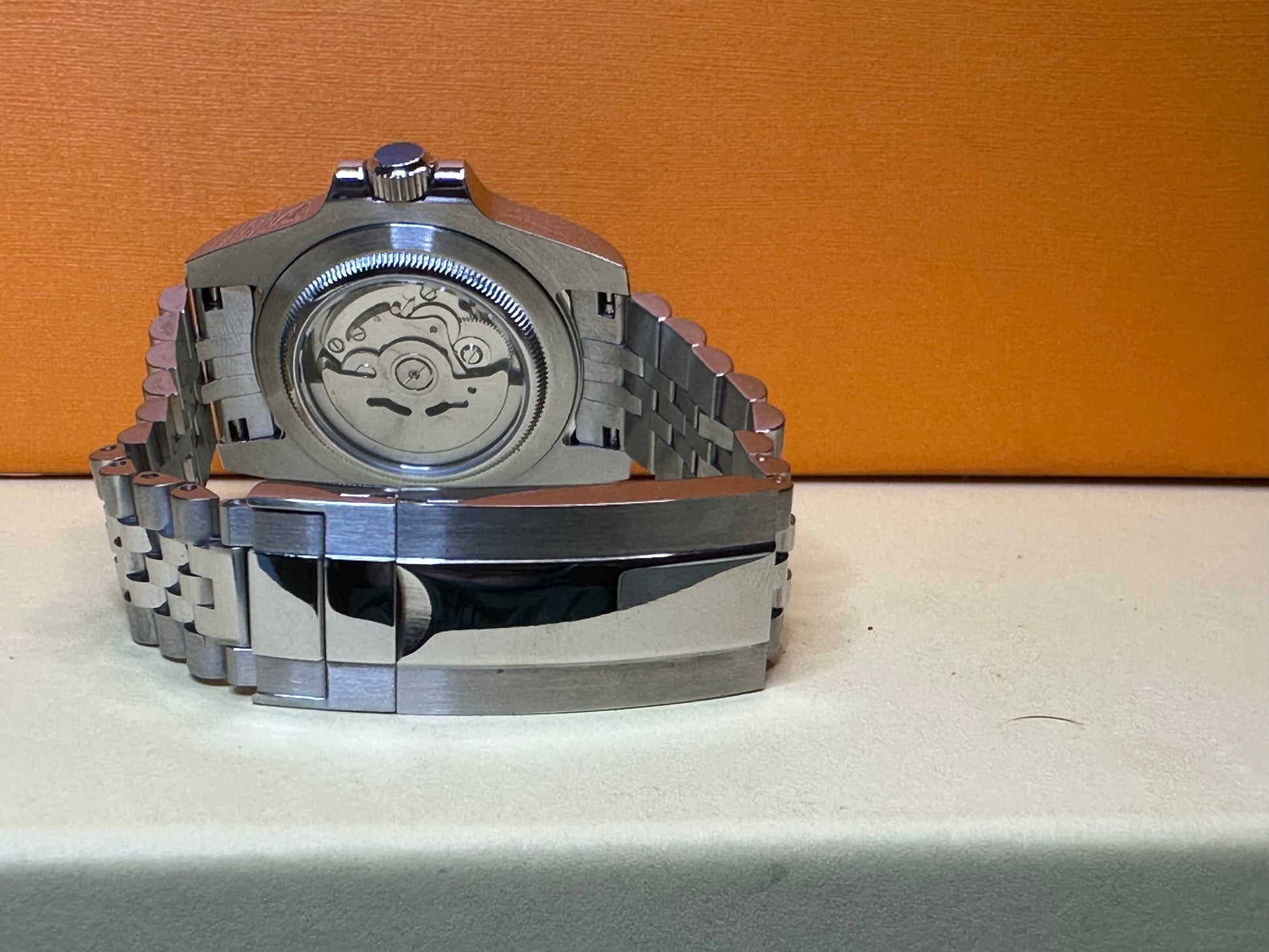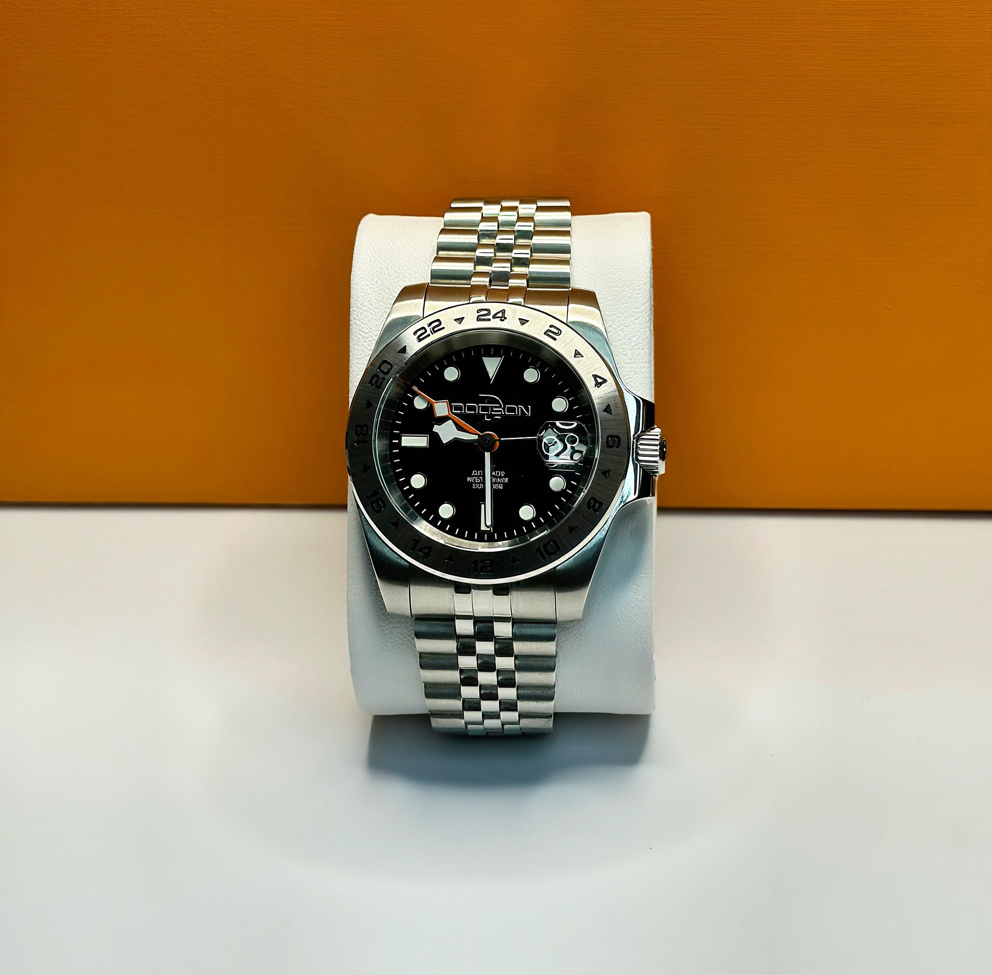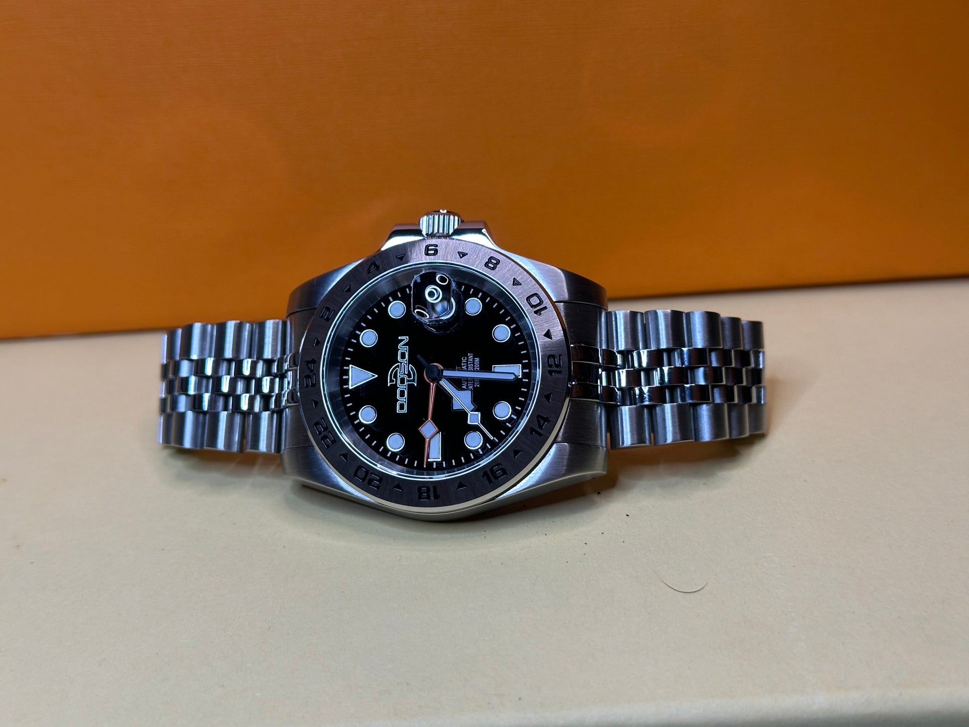 This is a true GMT watch with a striking Black dial, powered by the seiko NH34 and is on a jubilee bracelet, a Homage to a legendary watch. It is the perfect fusion of luxury and precision. Featuring an automatic NH34 movement and GMT bezel, this watch allows you to track multiple time zones with ease. Its exhibition case-back and sapphire crystal offer a glimpse into the intricate workings of the watch. With a solid stainless steel jubilee bracelet and screw down crown, this watch is built to last. Elevate your style and functionality with this Explorer 2 black dial true GMT watch. A perfect “every day watch” looks great for every occasion and compliments any outfit.