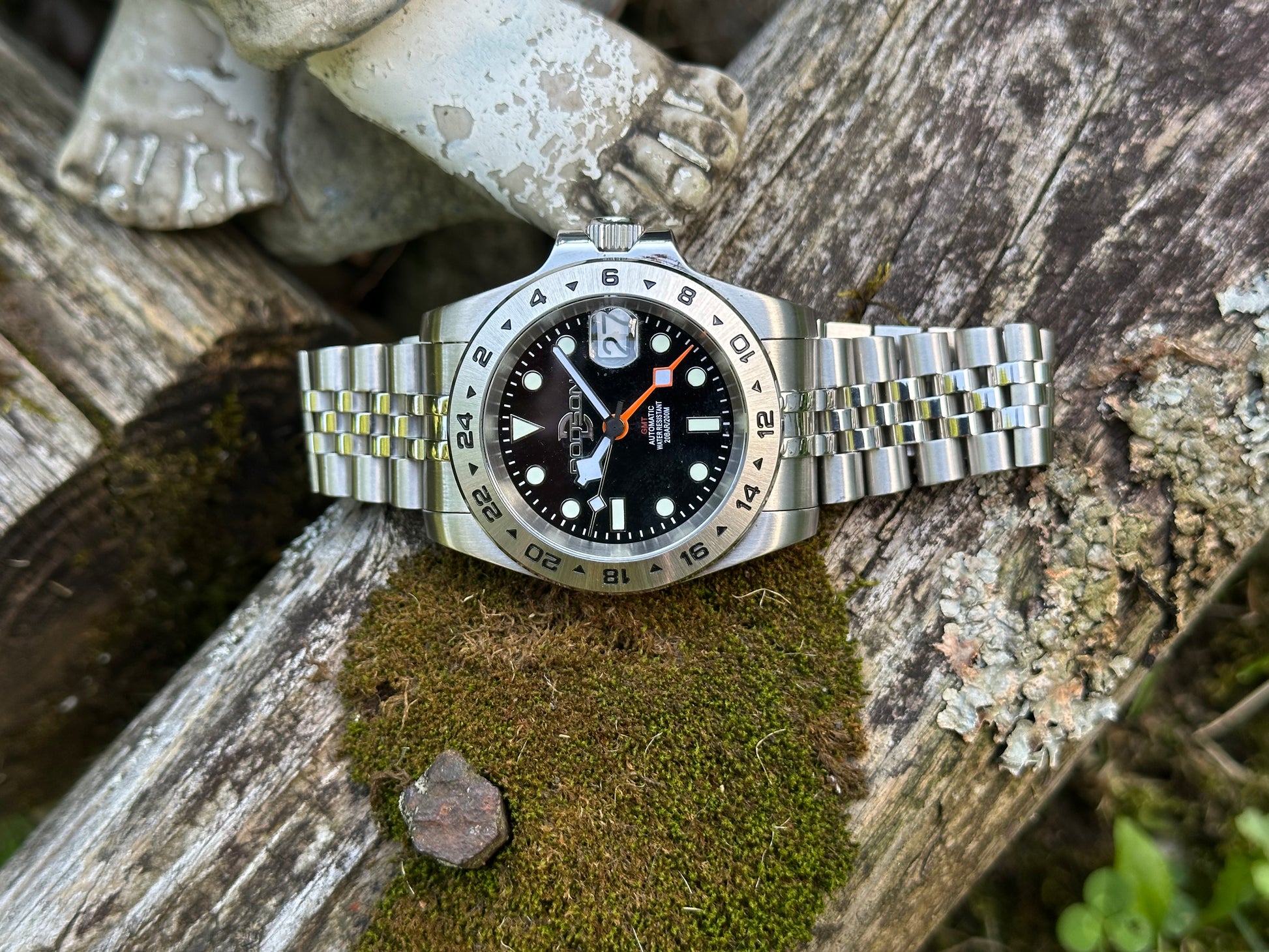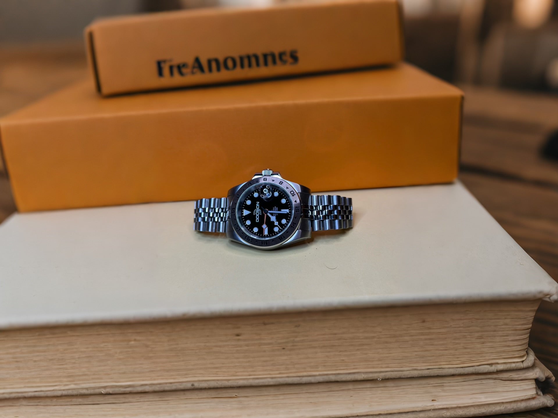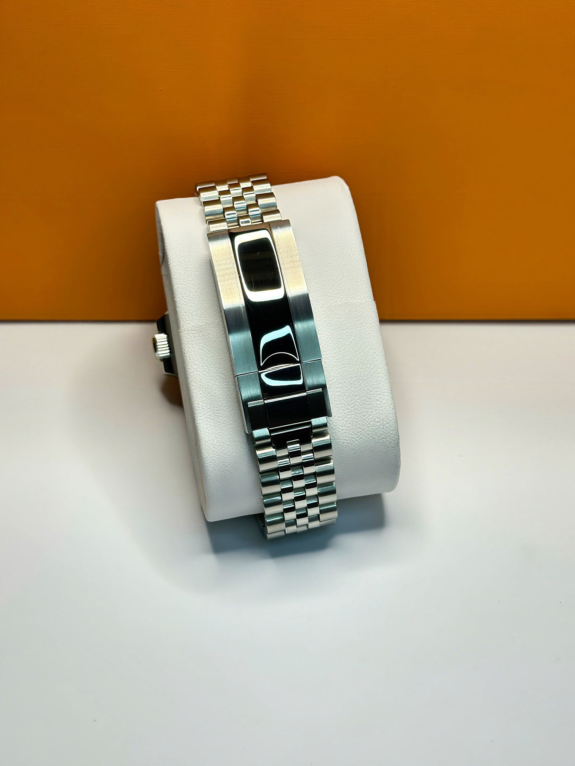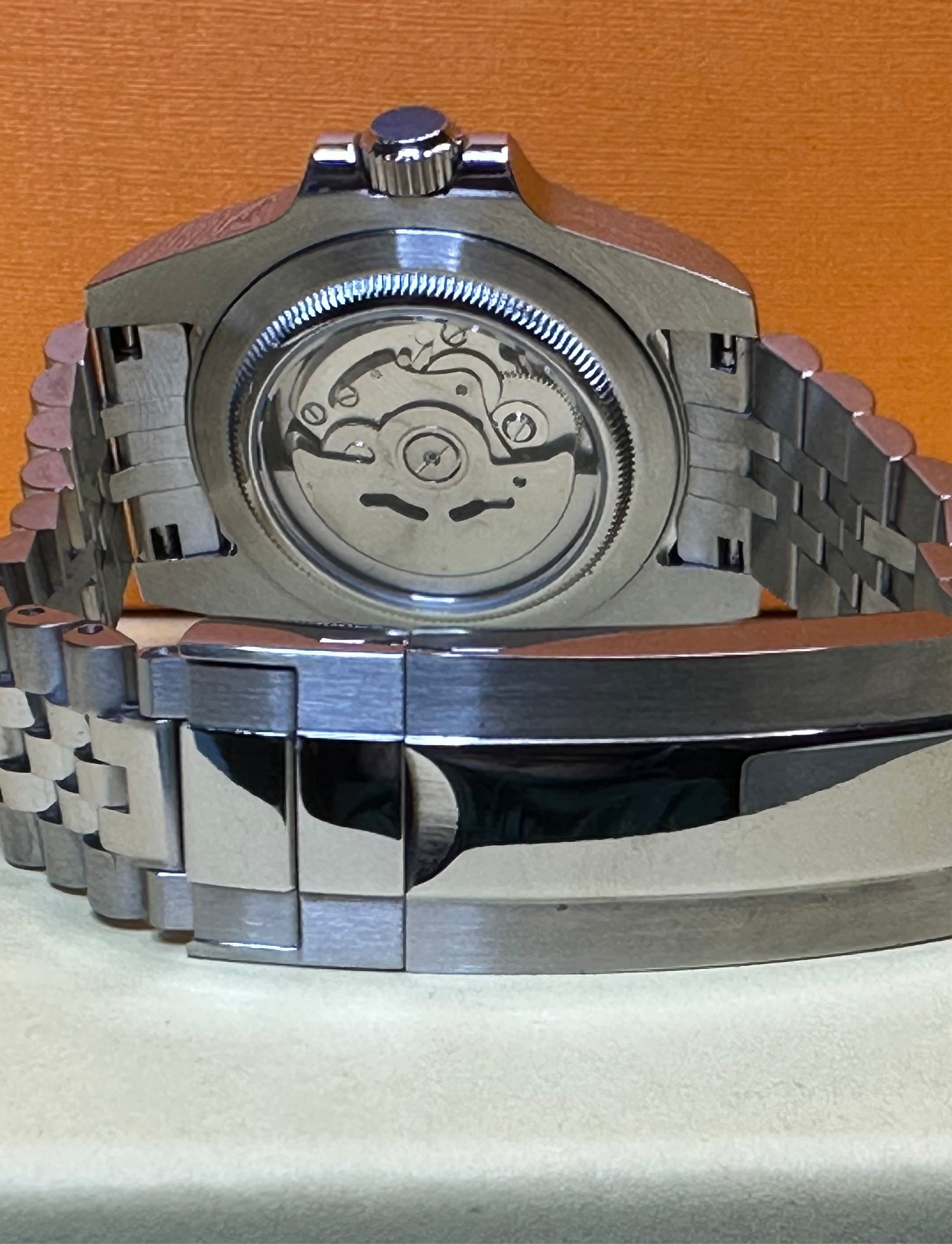 This is a true GMT watch with a striking Black dial, powered by the seiko NH34 and is on a jubilee bracelet, a Homage to a legendary watch. It is the perfect fusion of luxury and precision. Featuring an automatic NH34 movement and GMT bezel, this watch allows you to track multiple time zones with ease. Its exhibition case-back and sapphire crystal offer a glimpse into the intricate workings of the watch. With a solid stainless steel jubilee bracelet and screw down crown, this watch is built to last. Elevate your style and functionality with this Explorer 2 black dial true GMT watch. A perfect “every day watch” looks great for every occasion and compliments any outfit.