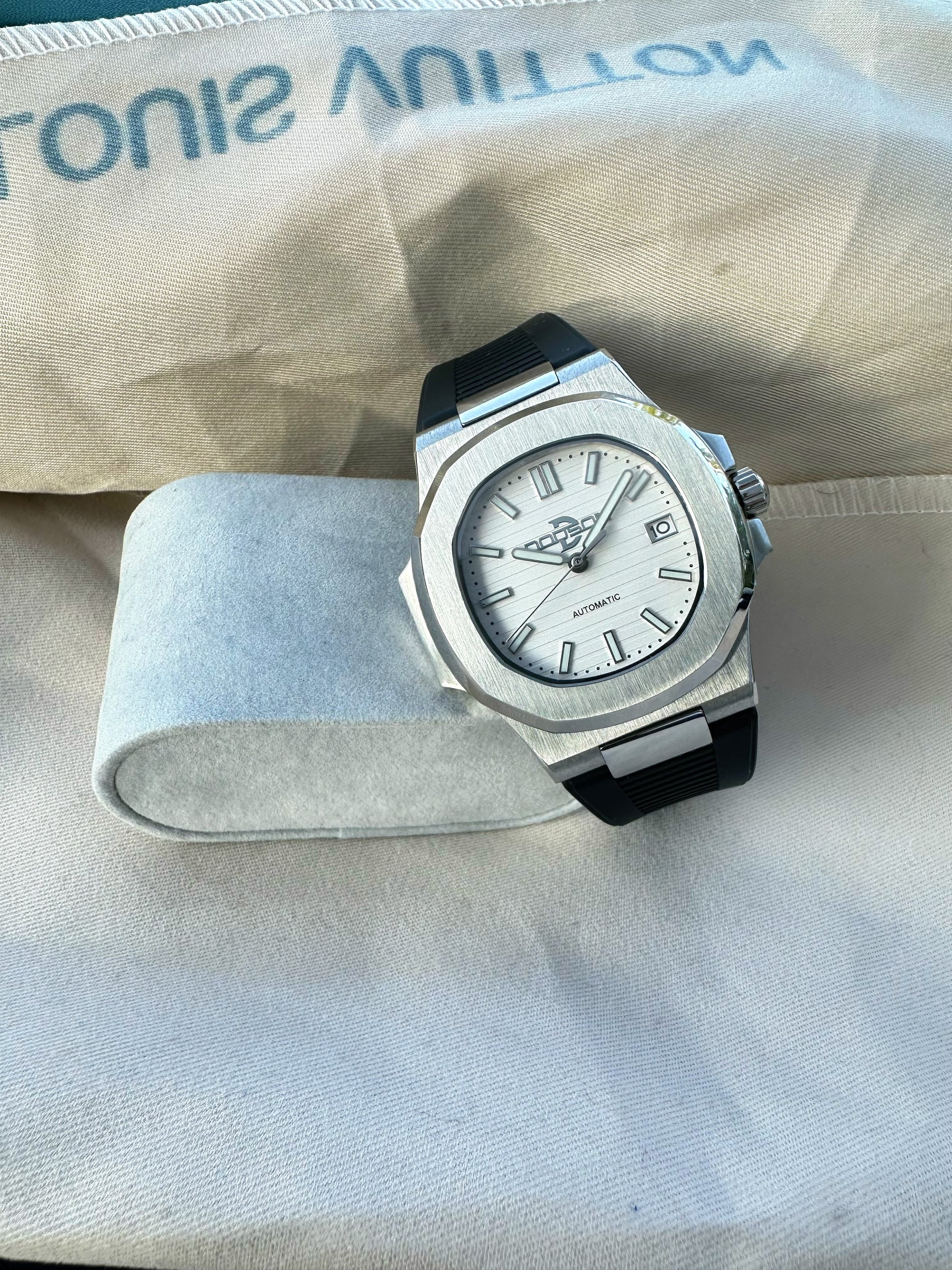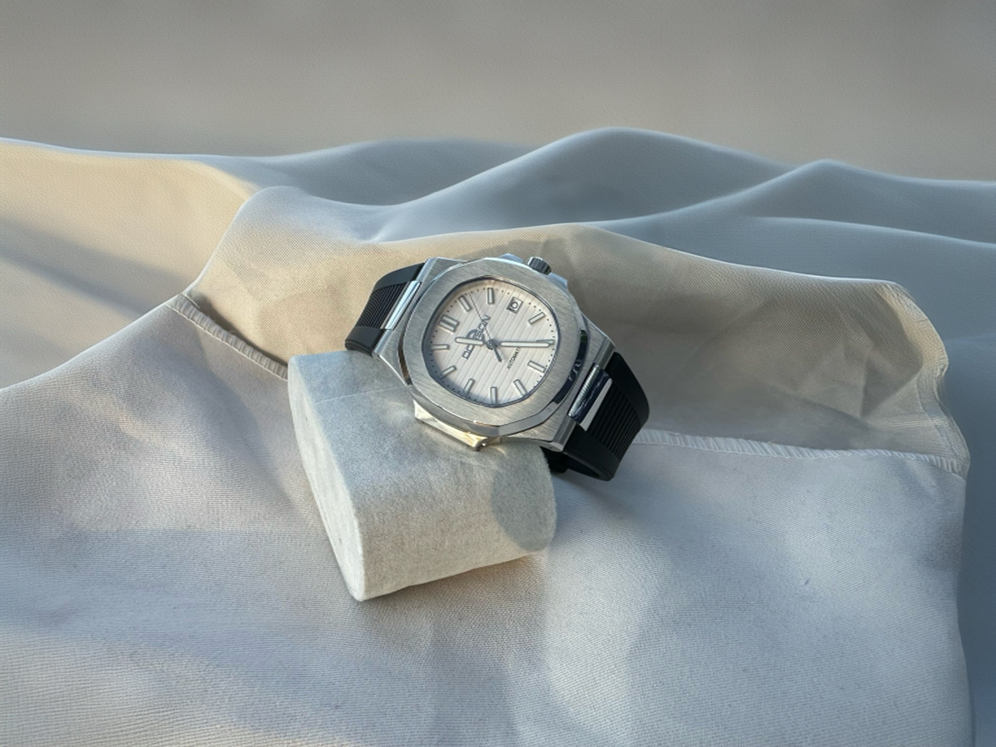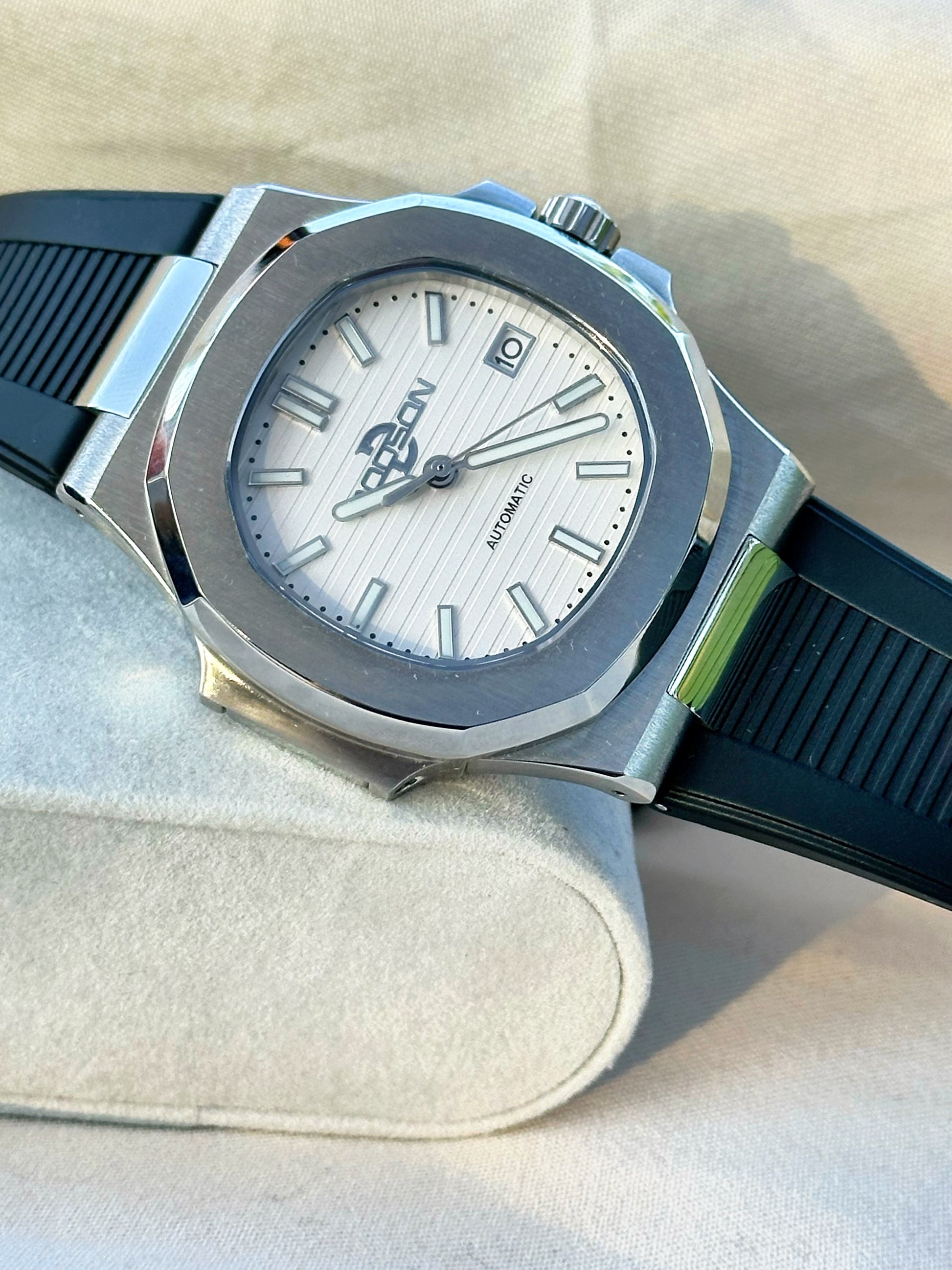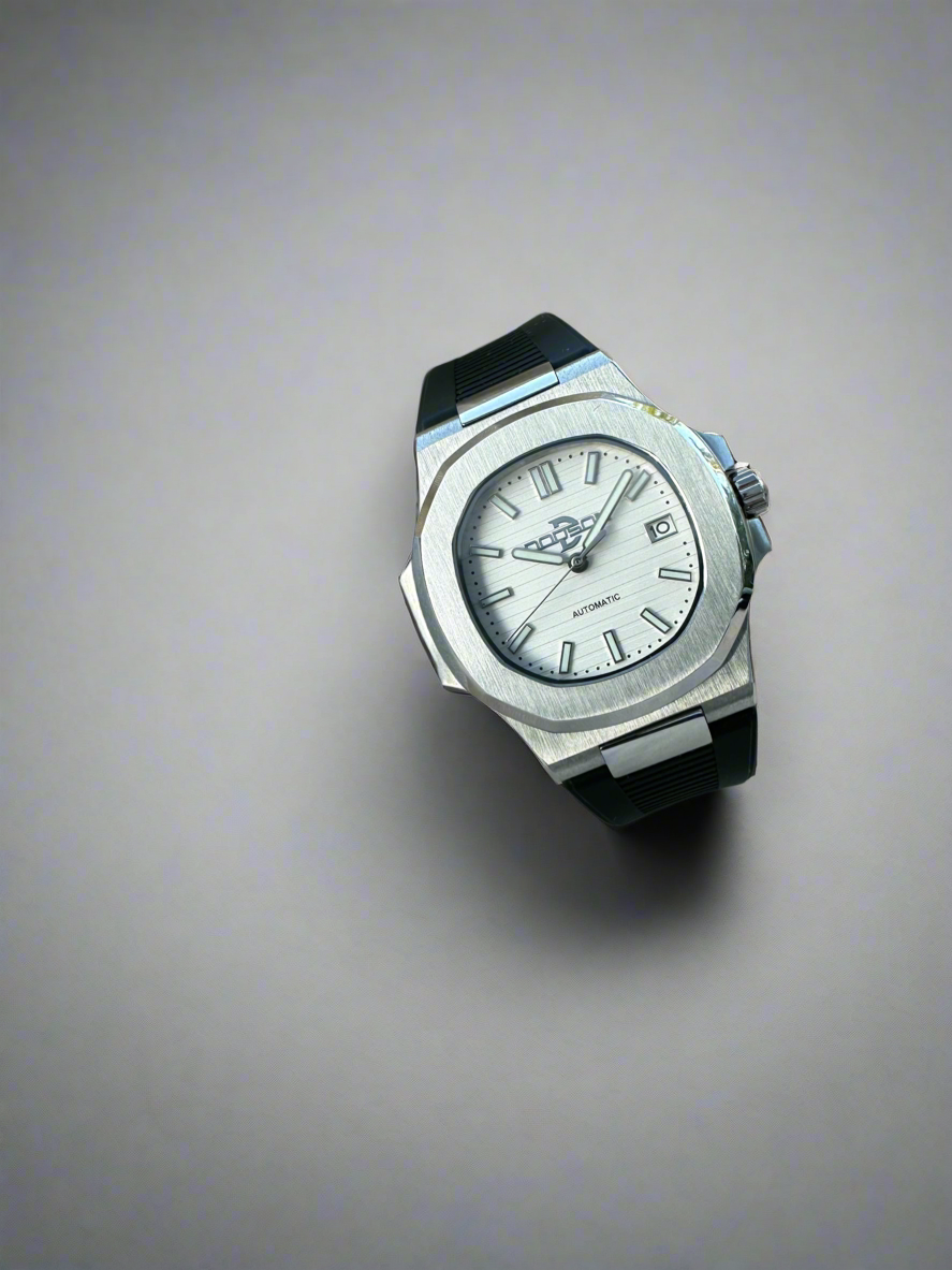 Experience luxury timekeeping with our Nautilus style white dial automatic watch. The beautiful horizontal texture dial and iconic case shape will make a statement anywhere. Fully automatic with a silicone black strap and deployment clasp for a comfortable and secure fit. Elevate your style with this must-have timepiece.