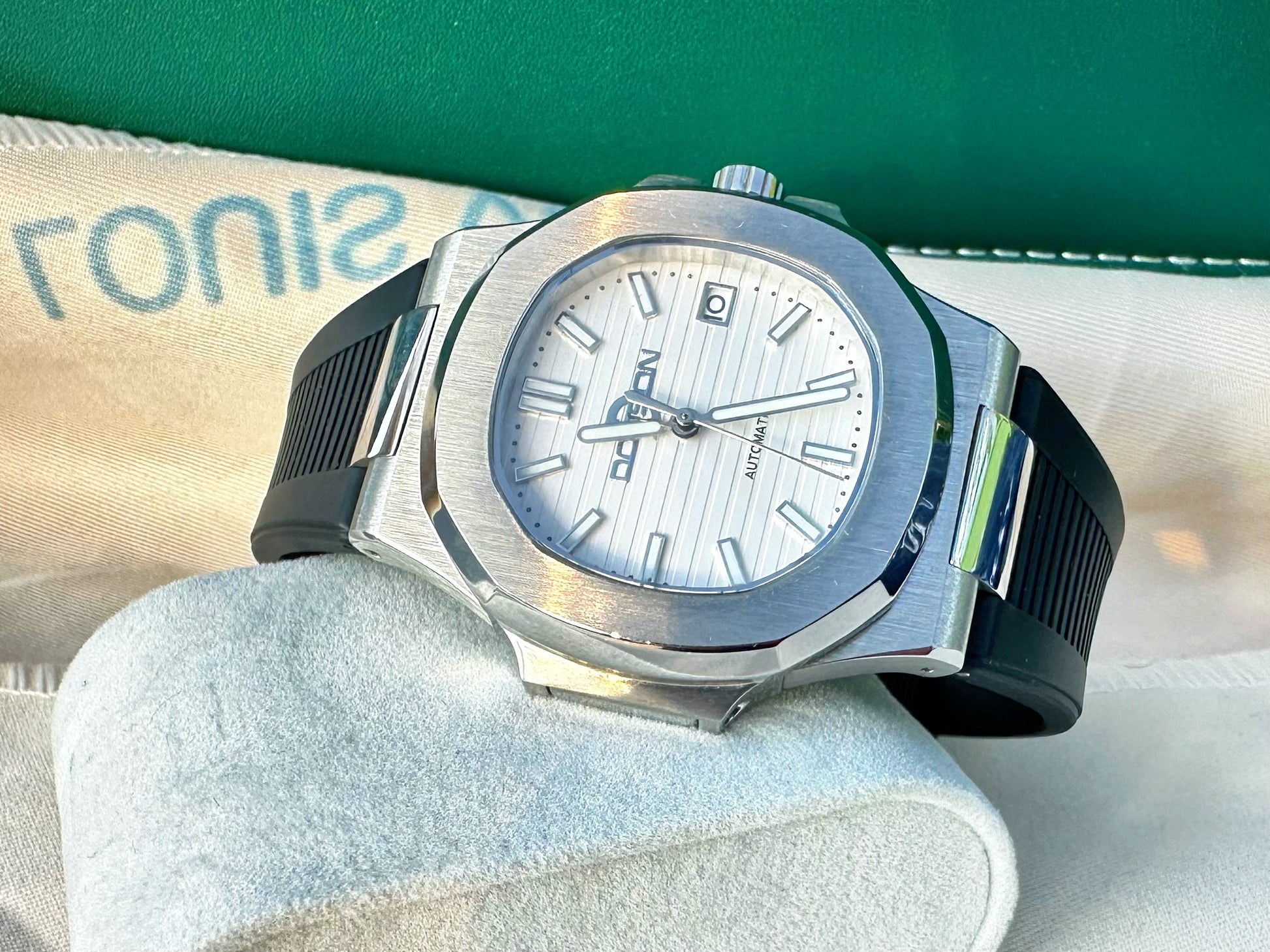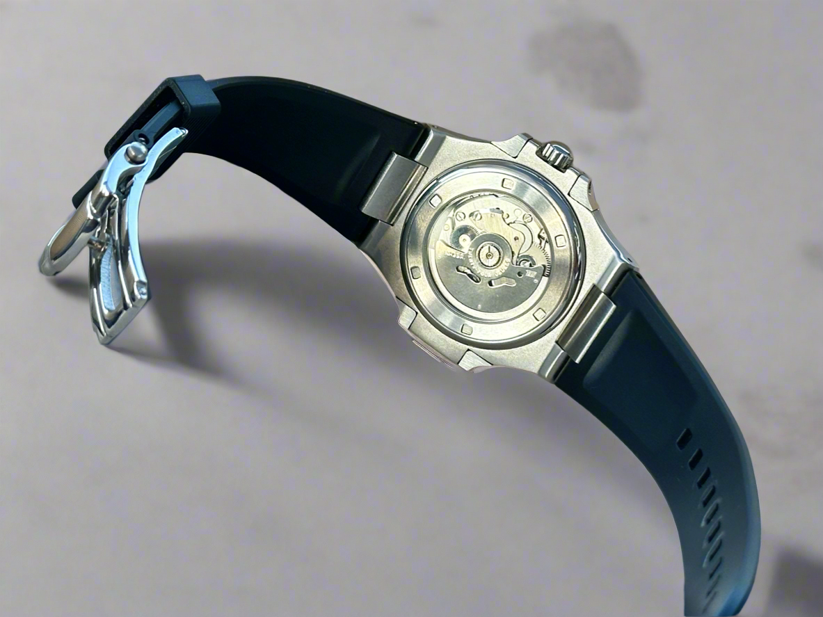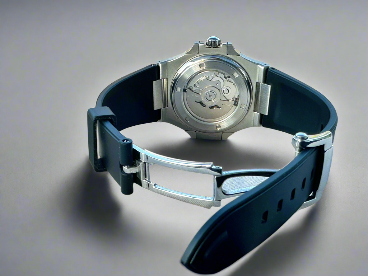 Experience luxury timekeeping with our Nautilus style white dial automatic watch. The beautiful horizontal texture dial and iconic case shape will make a statement anywhere. Fully automatic with a silicone black strap and deployment clasp for a comfortable and secure fit. Elevate your style with this must-have timepiece.