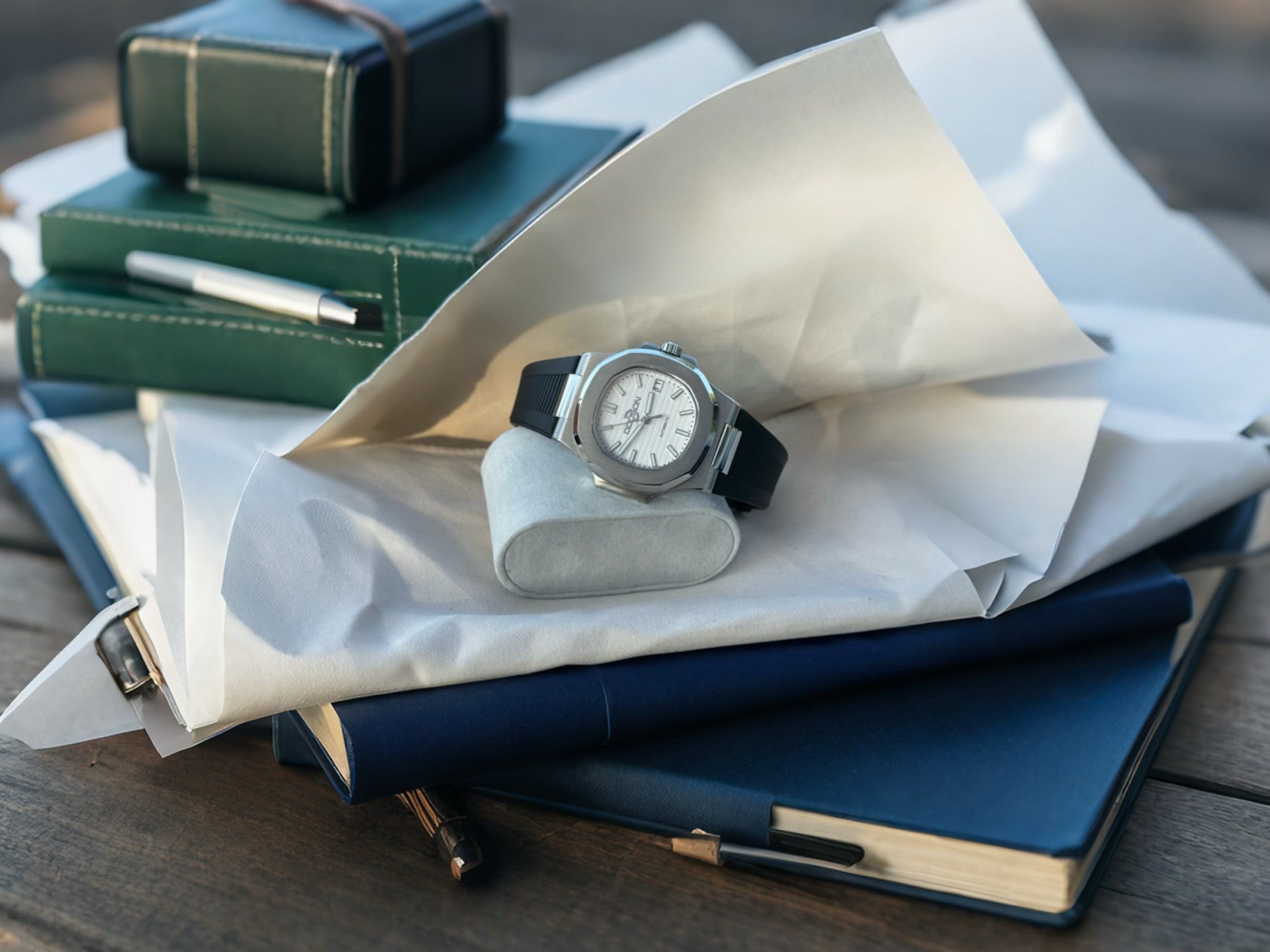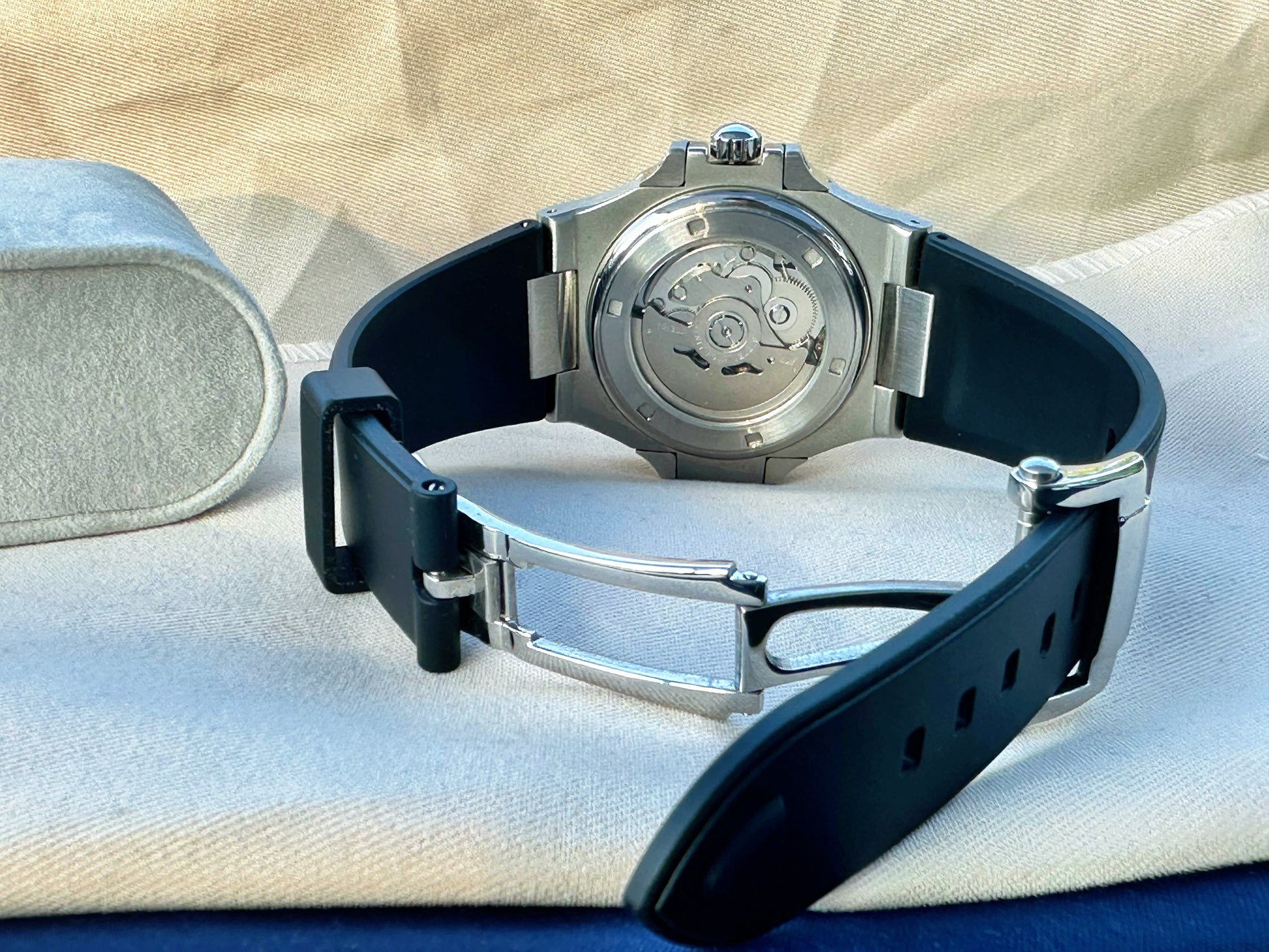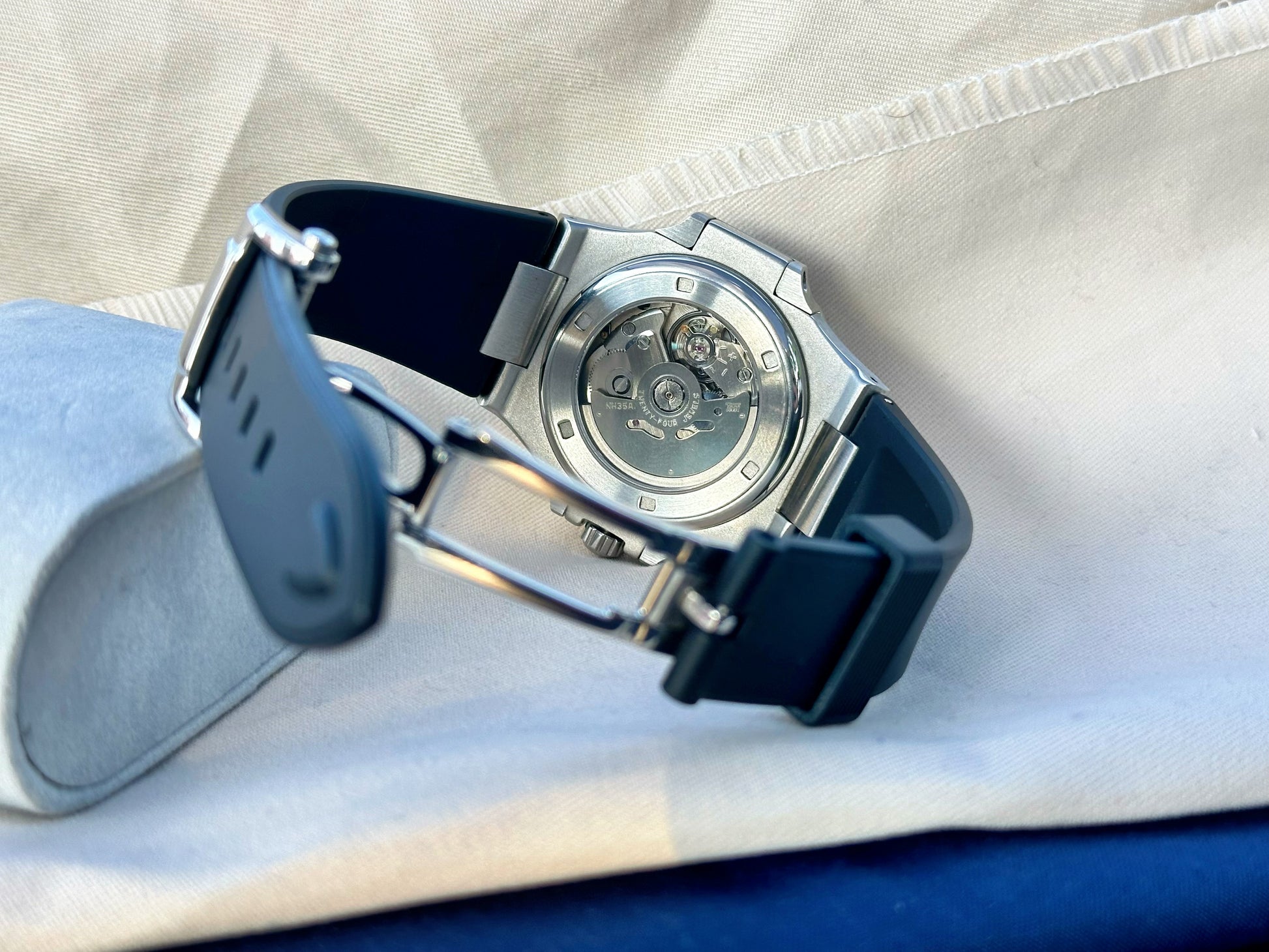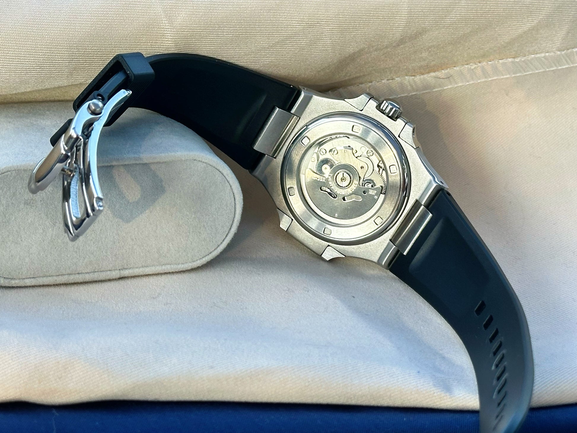 Experience luxury timekeeping with our Nautilus style white dial automatic watch. The beautiful horizontal texture dial and iconic case shape will make a statement anywhere. Fully automatic with a silicone black strap and deployment clasp for a comfortable and secure fit. Elevate your style with this must-have timepiece.