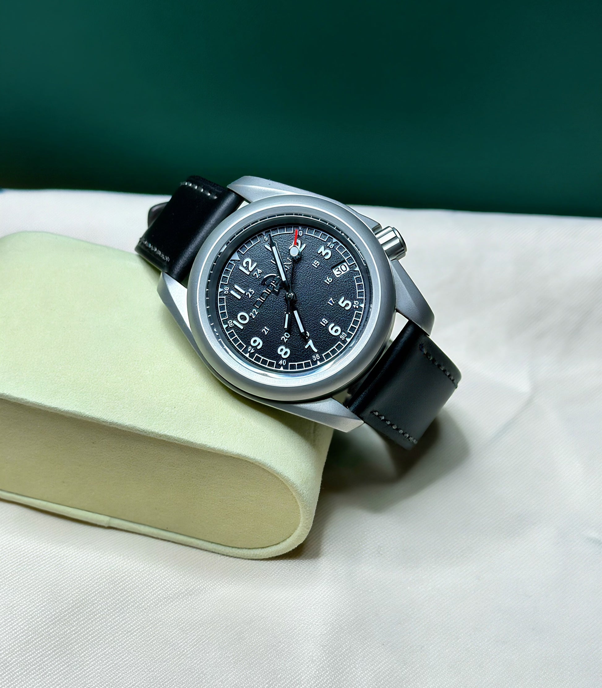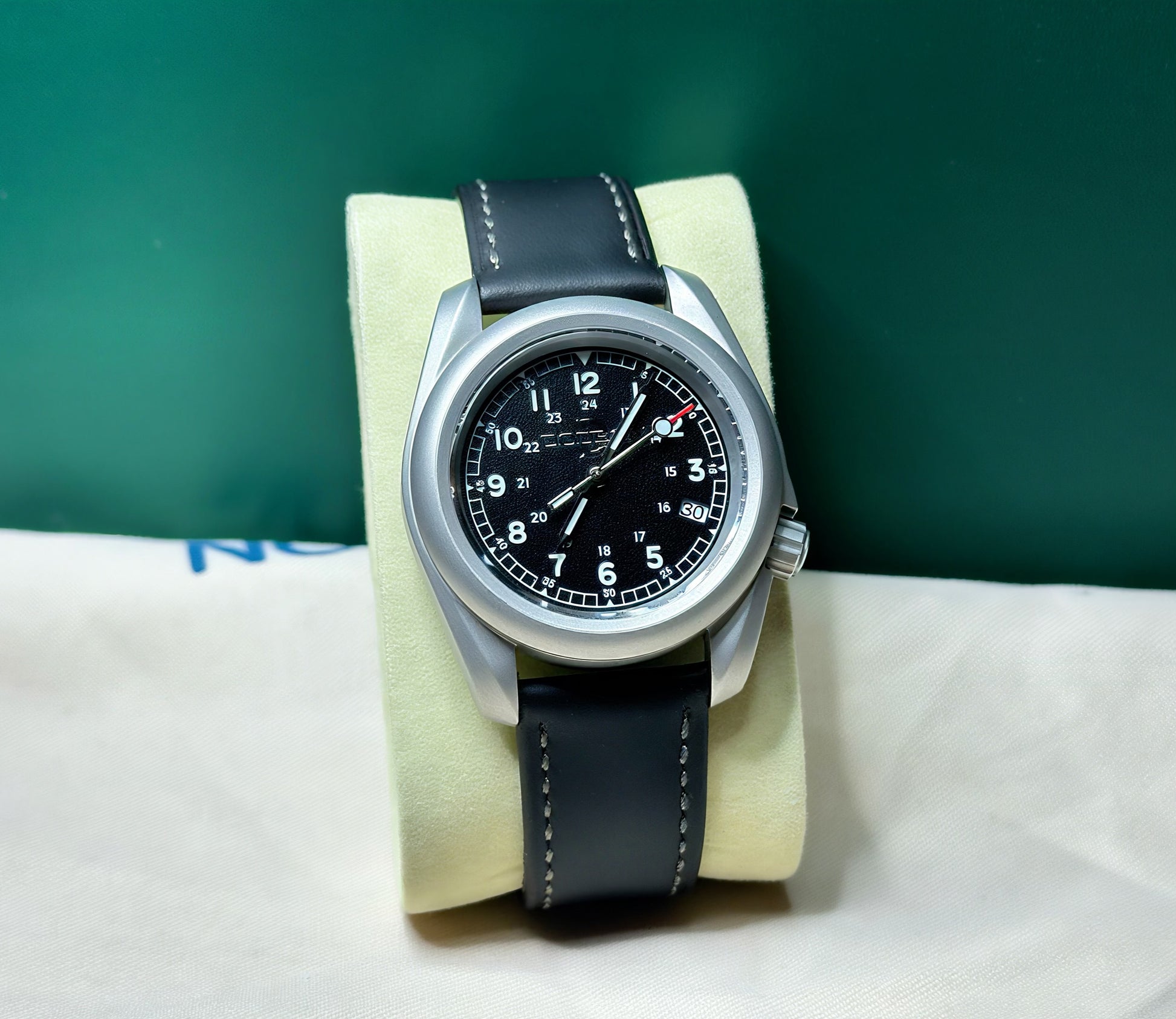 Sand Blasted 40mm Black Dial Field Watch on Genuine Black Leather Strap