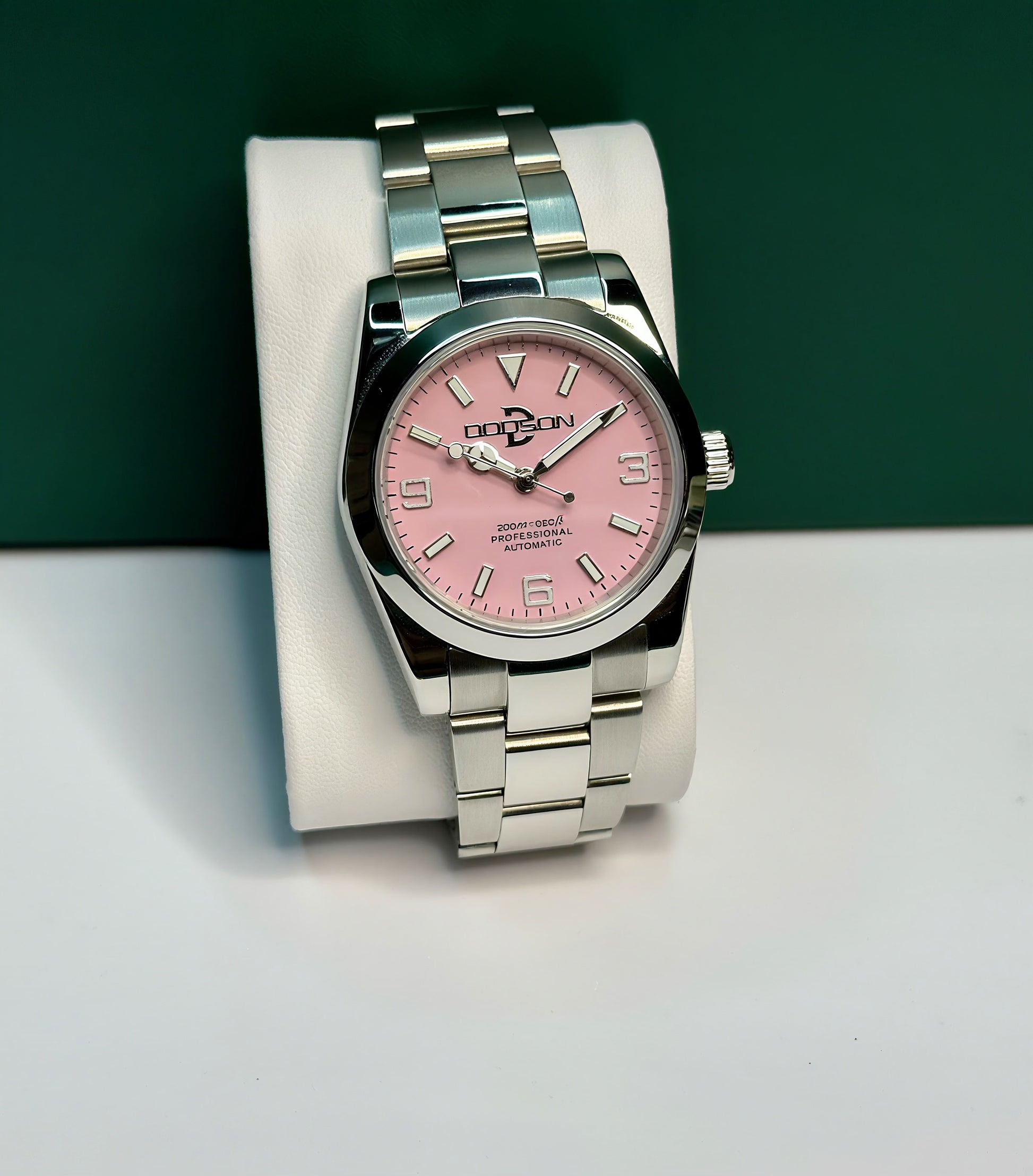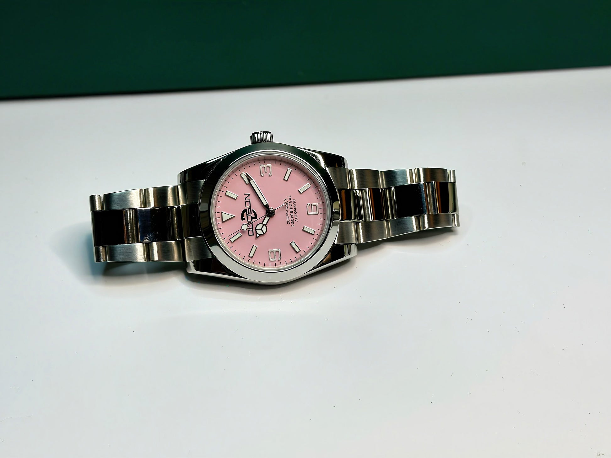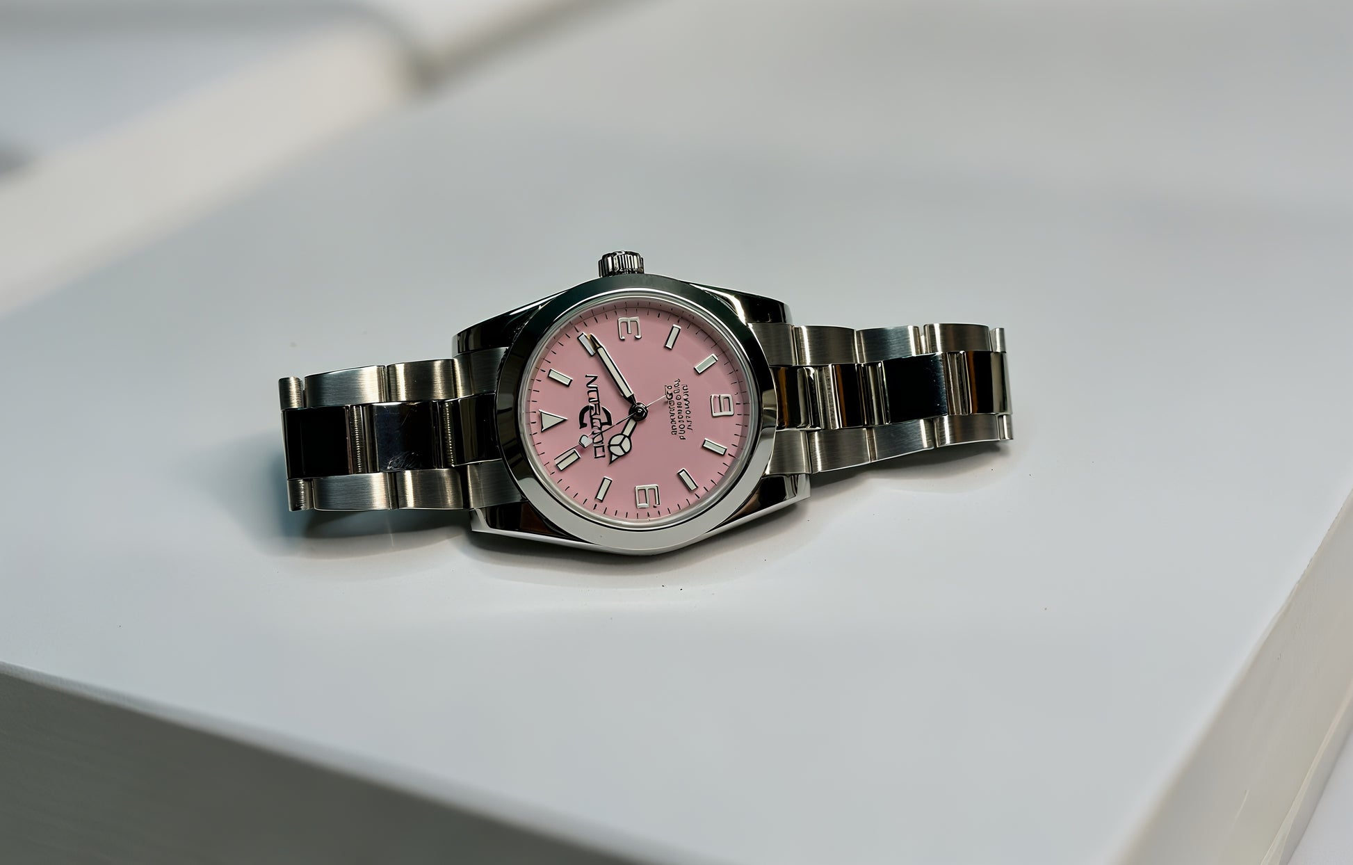 This 36mm pink Explorer watch is the perfect combination of style and functionality. Featuring a sapphire crystal and screw down crown, it offers added durability for everyday wear. The exhibition caseback allows for a stunning view of the inner workings of the watch. The pink dial with lume numbers and hands adds a touch of elegance to any outfit.
