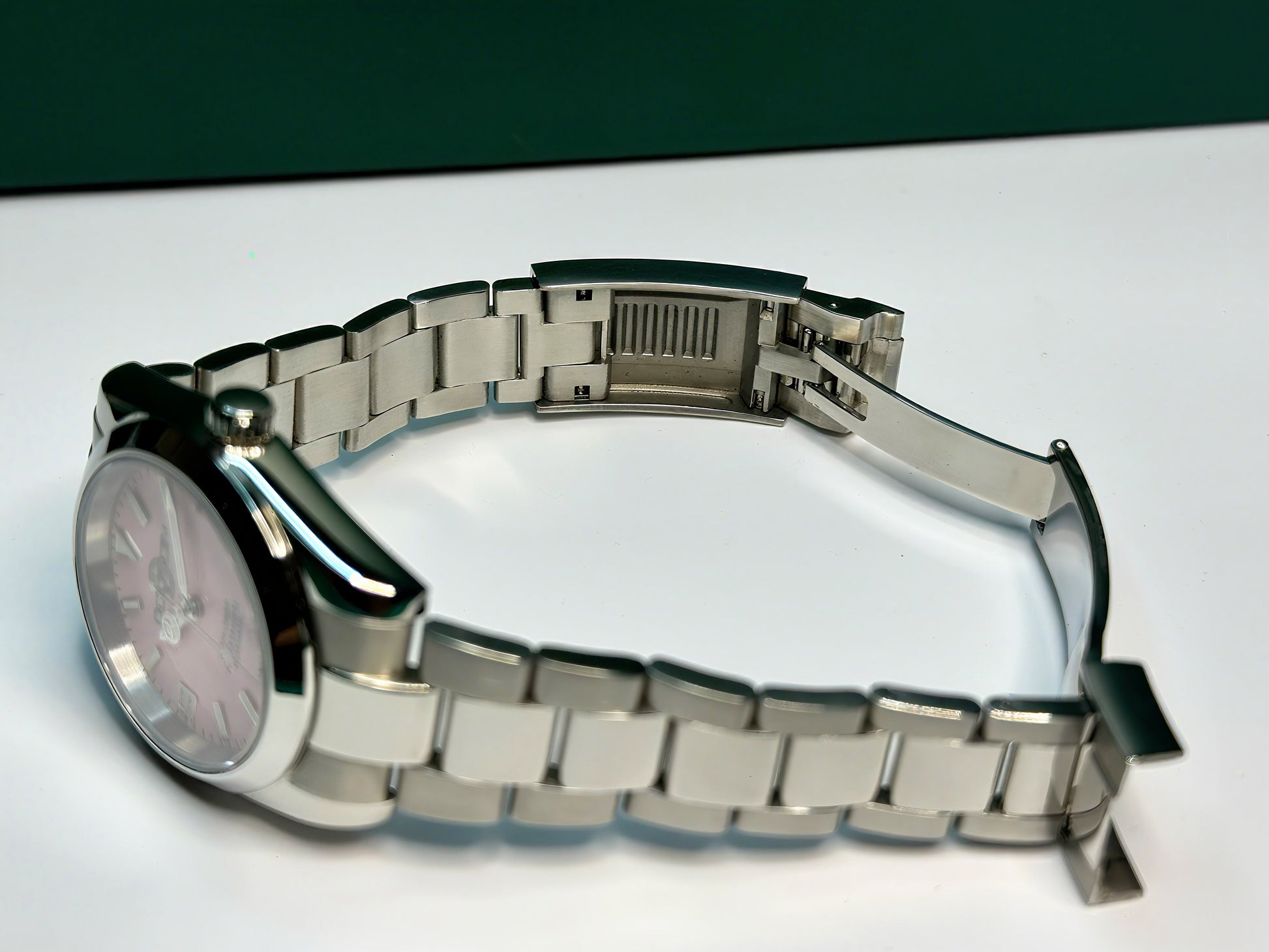 36mm Pink Explorer Automatic Watch on polished center link bracelet