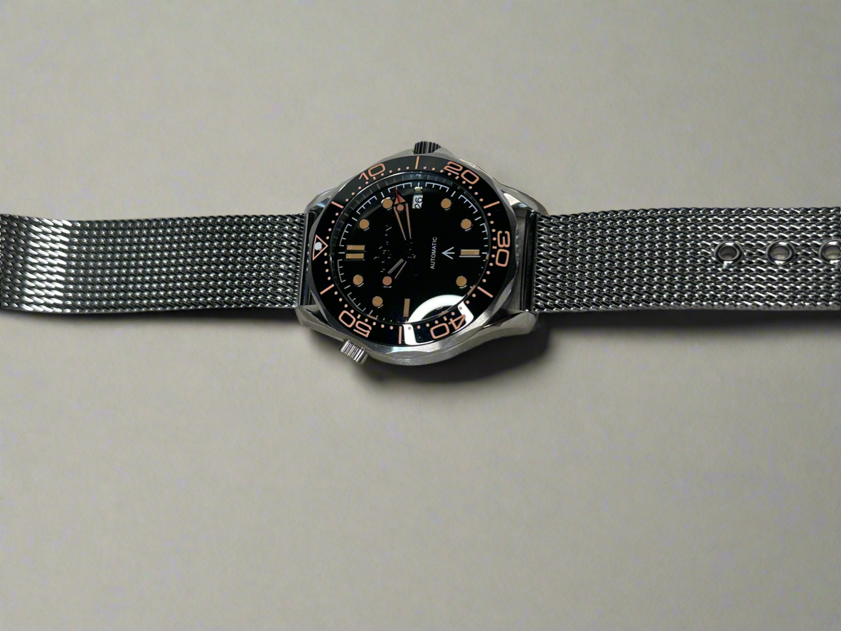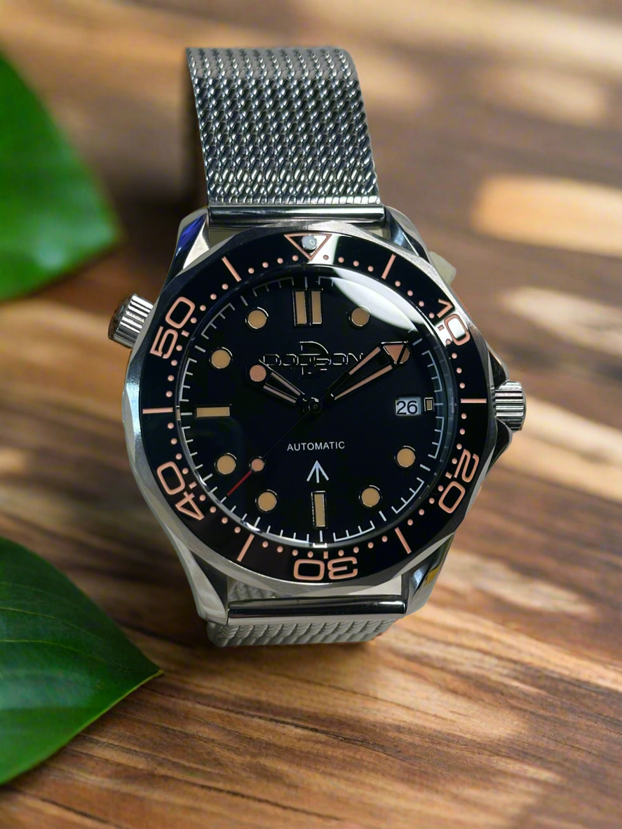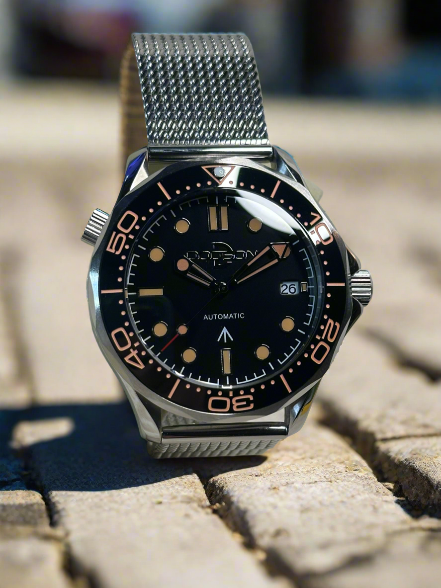 The 007 homage Watch. With a sleek black ghost logo, sapphire crystal, and screw down crown, this classic and timeless watch is perfect for any occasion, from a day in the office to an international spy adventure. Experience superior quality with its Japanese NH35 automatic movement and stainless-steel bracelet and deployment clasp. assembled by the Dodson Watch Company.