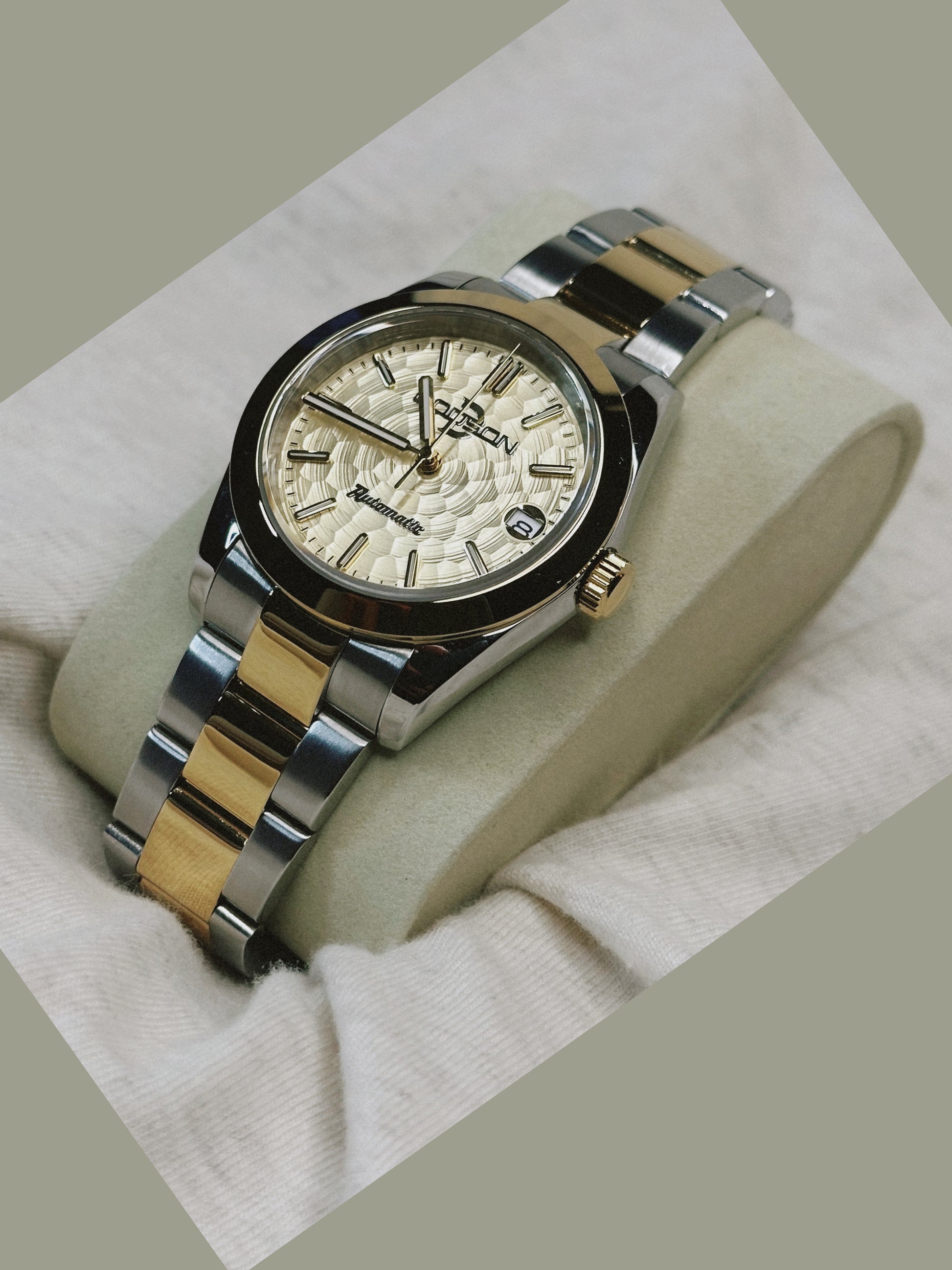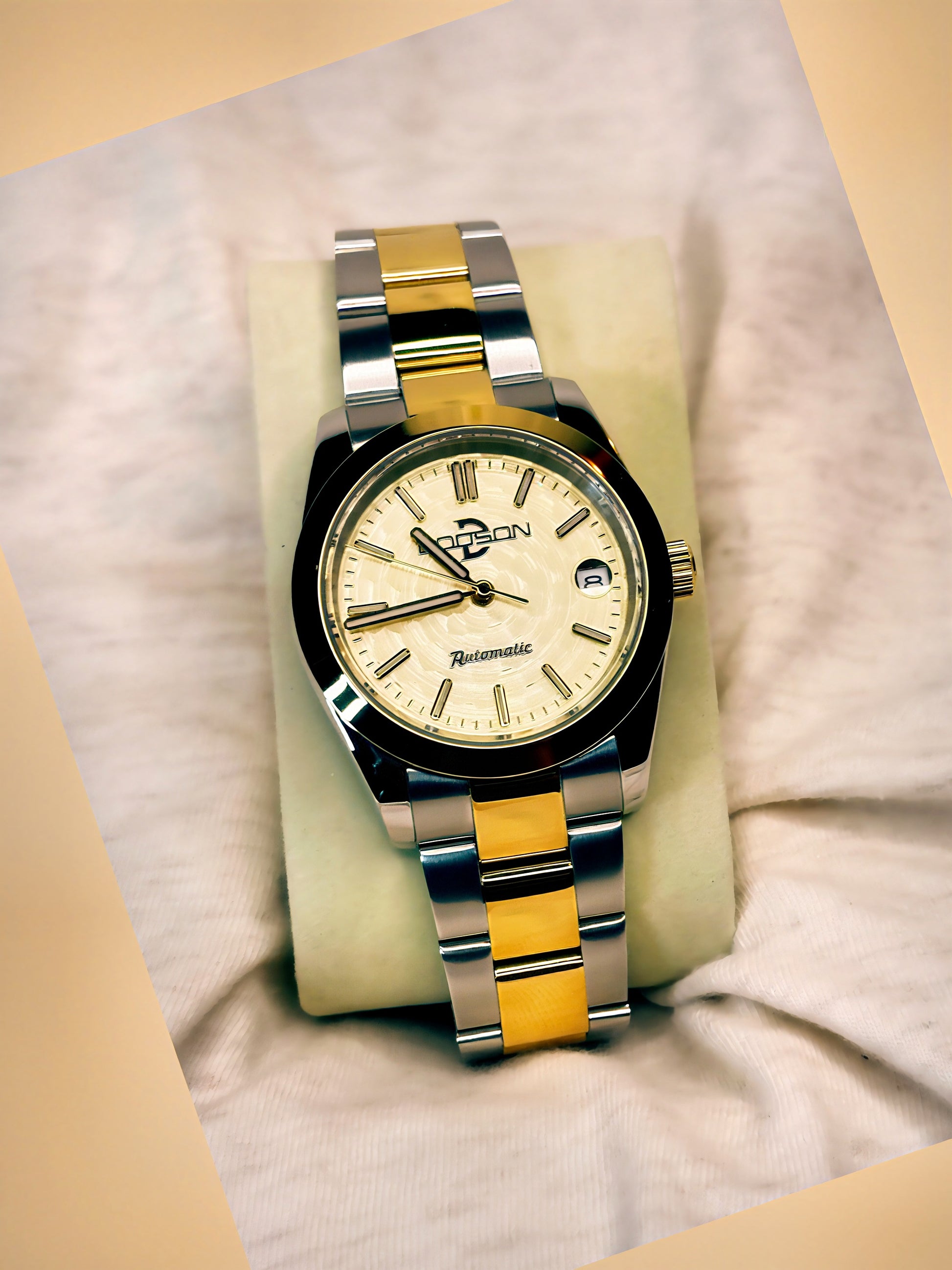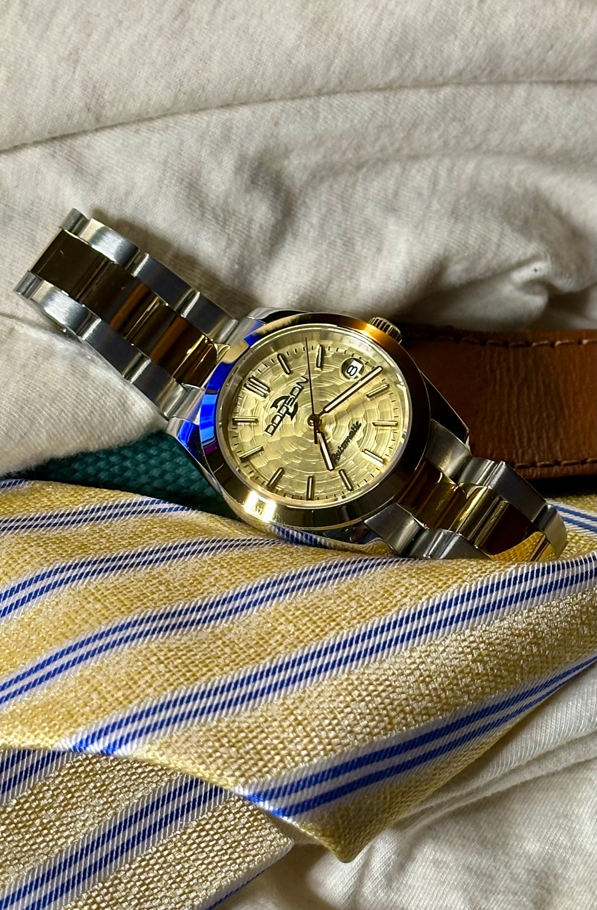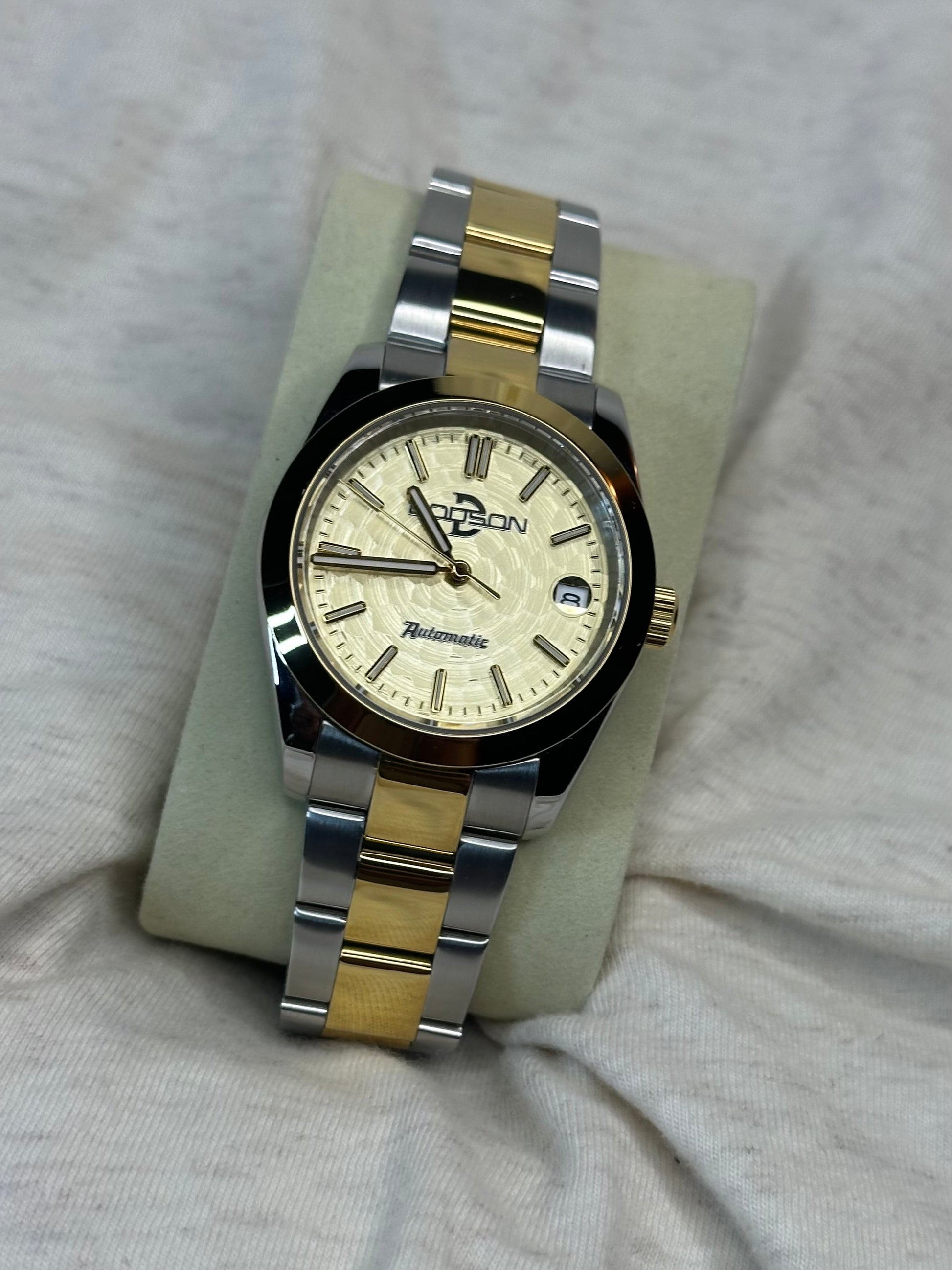 Expertly crafted by Dodson Watch Company in Pennsylvania, this beautiful 2-tone datejust combines timeless style with modern functionality. The textured gold dial is complemented by a sapphire crystal and screw down crown. A Japanese NH35 automatic movement ensures precise timekeeping. Perfect for any occasion, from casual to professional.