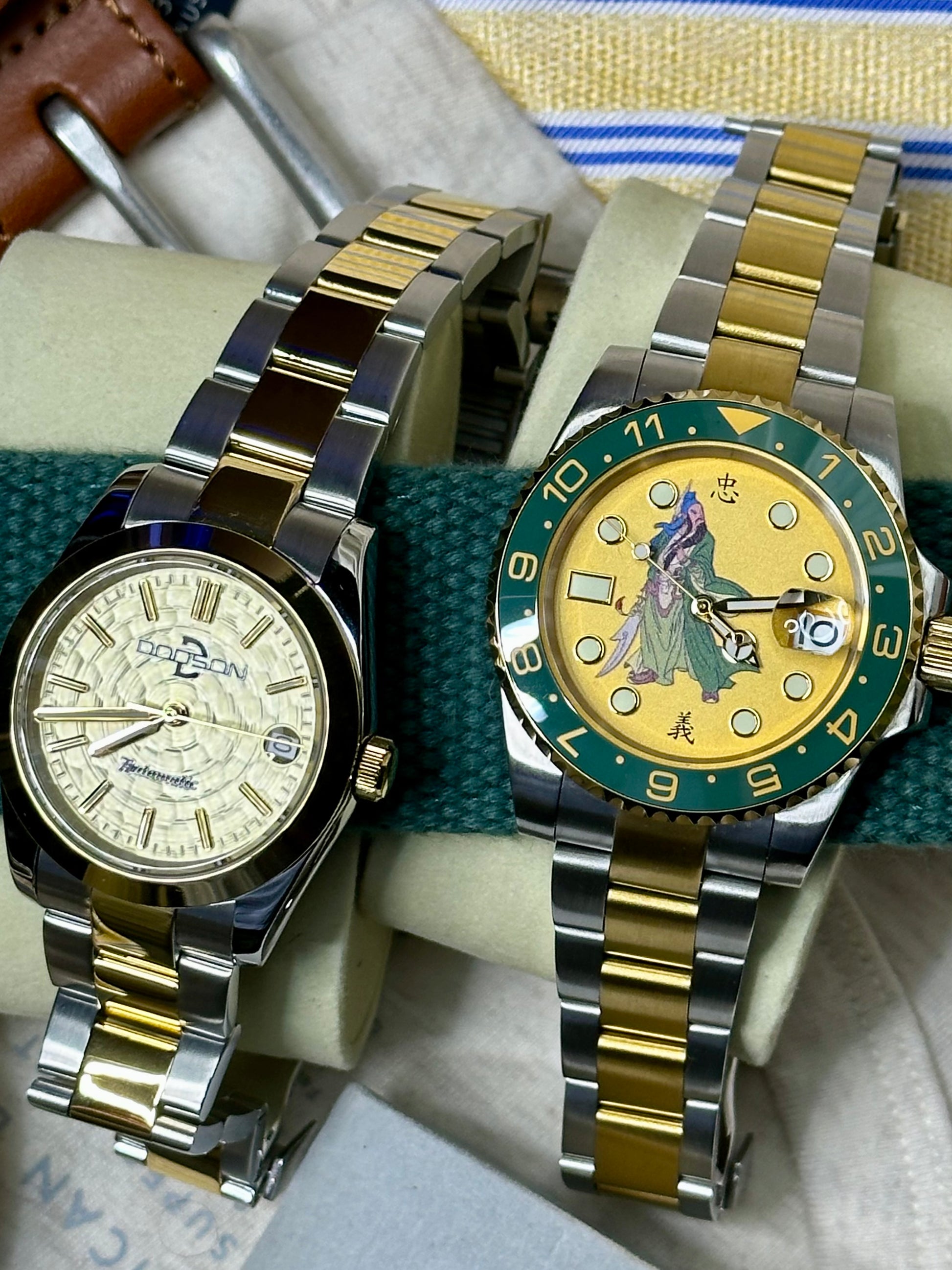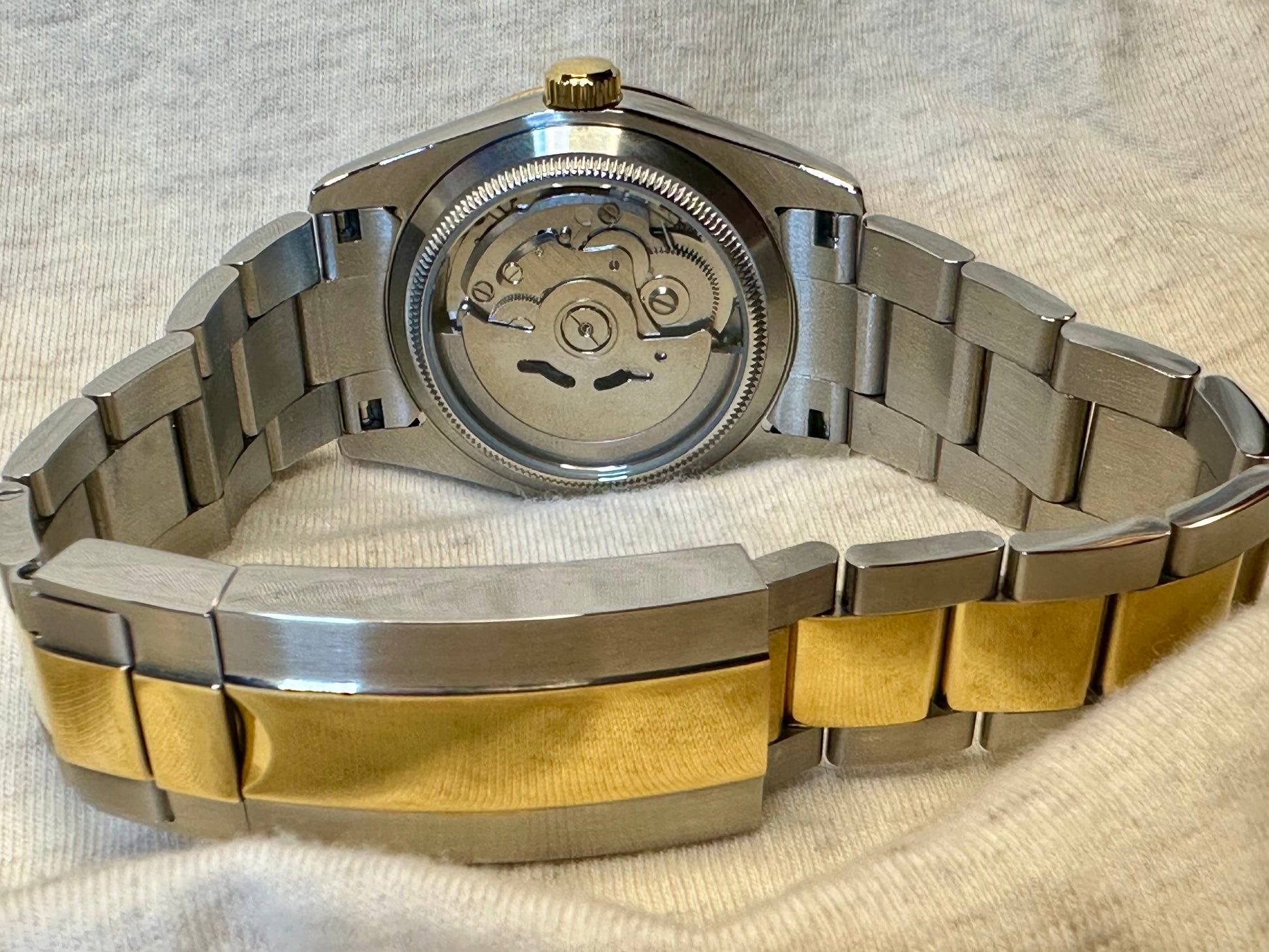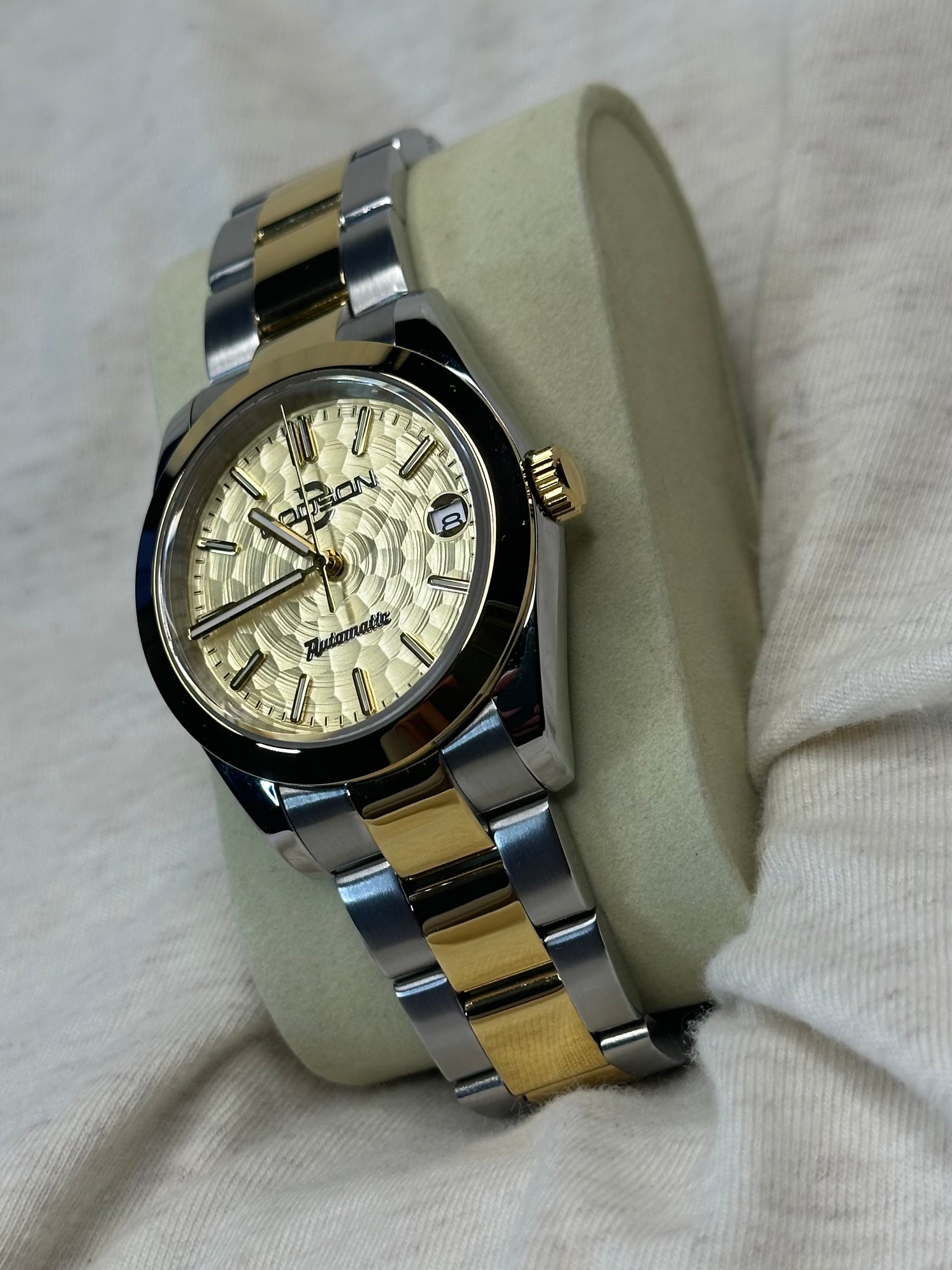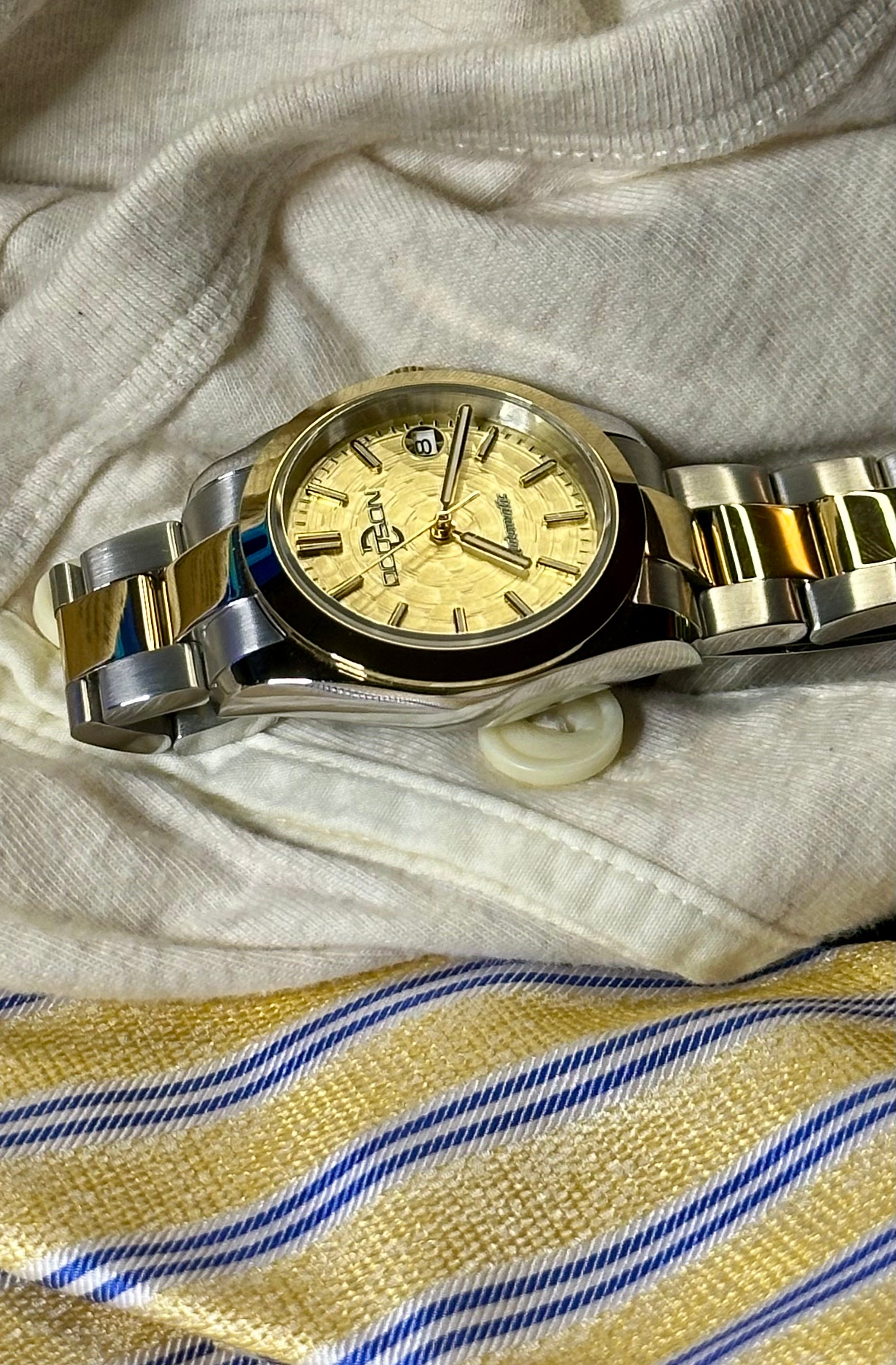 Expertly crafted by Dodson Watch Company in Pennsylvania, this beautiful 2-tone datejust combines timeless style with modern functionality. The textured gold dial is complemented by a sapphire crystal and screw down crown. A Japanese NH35 automatic movement ensures precise timekeeping. Perfect for any occasion, from casual to professional.
