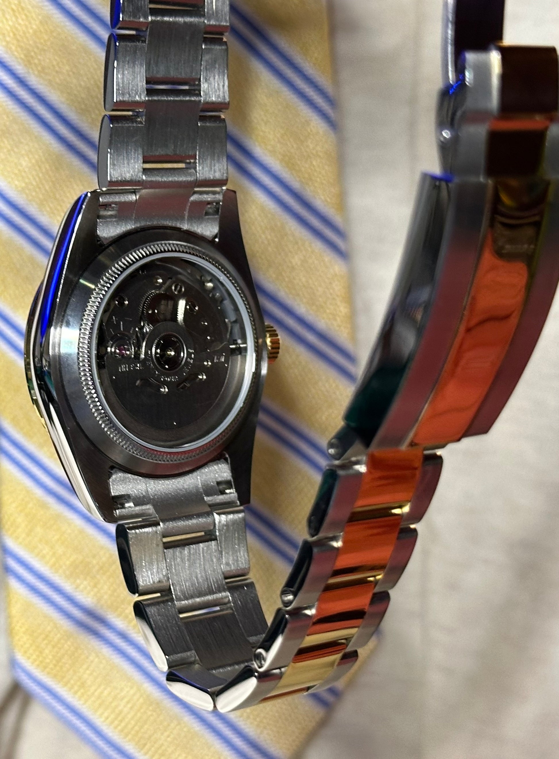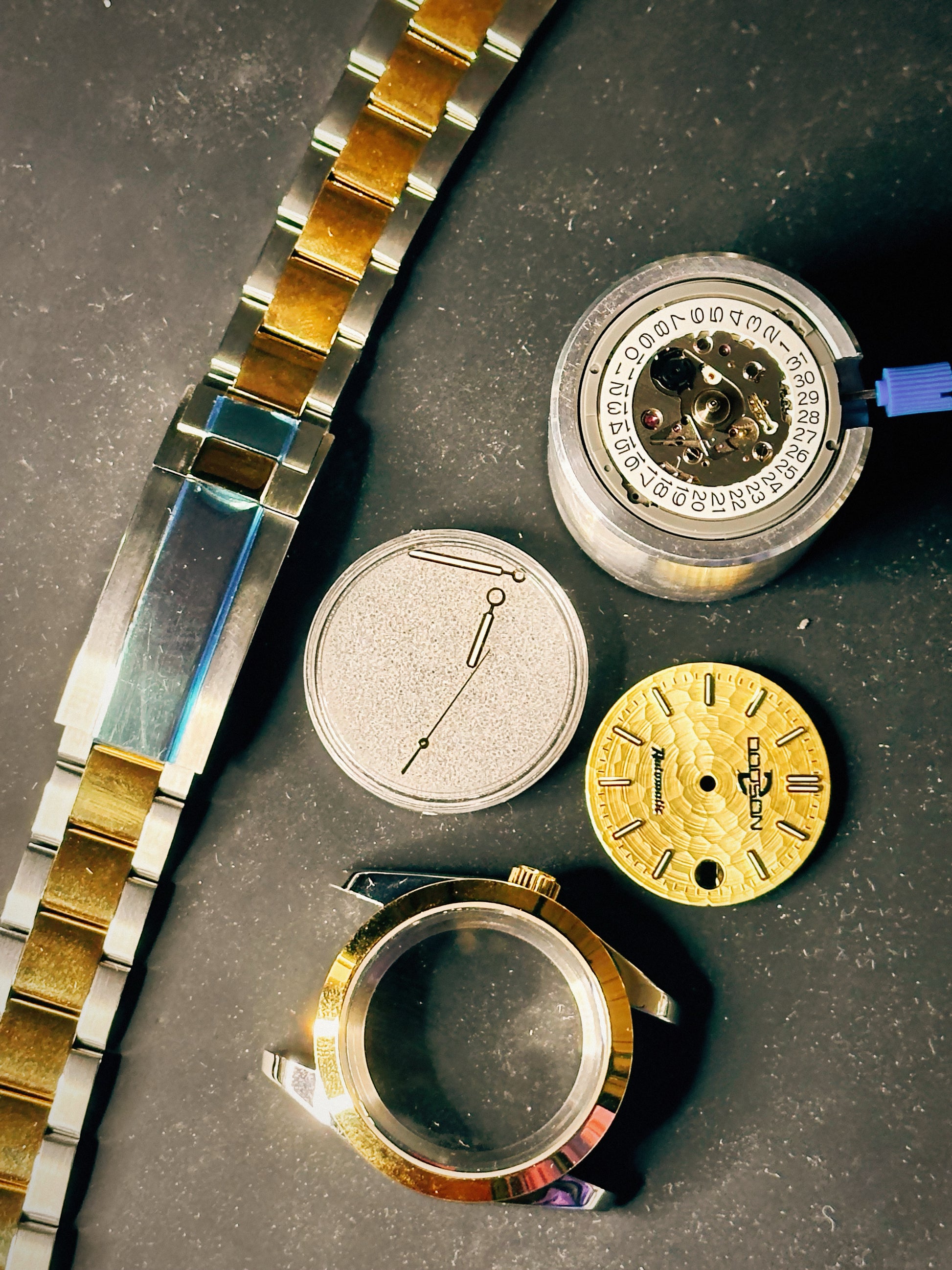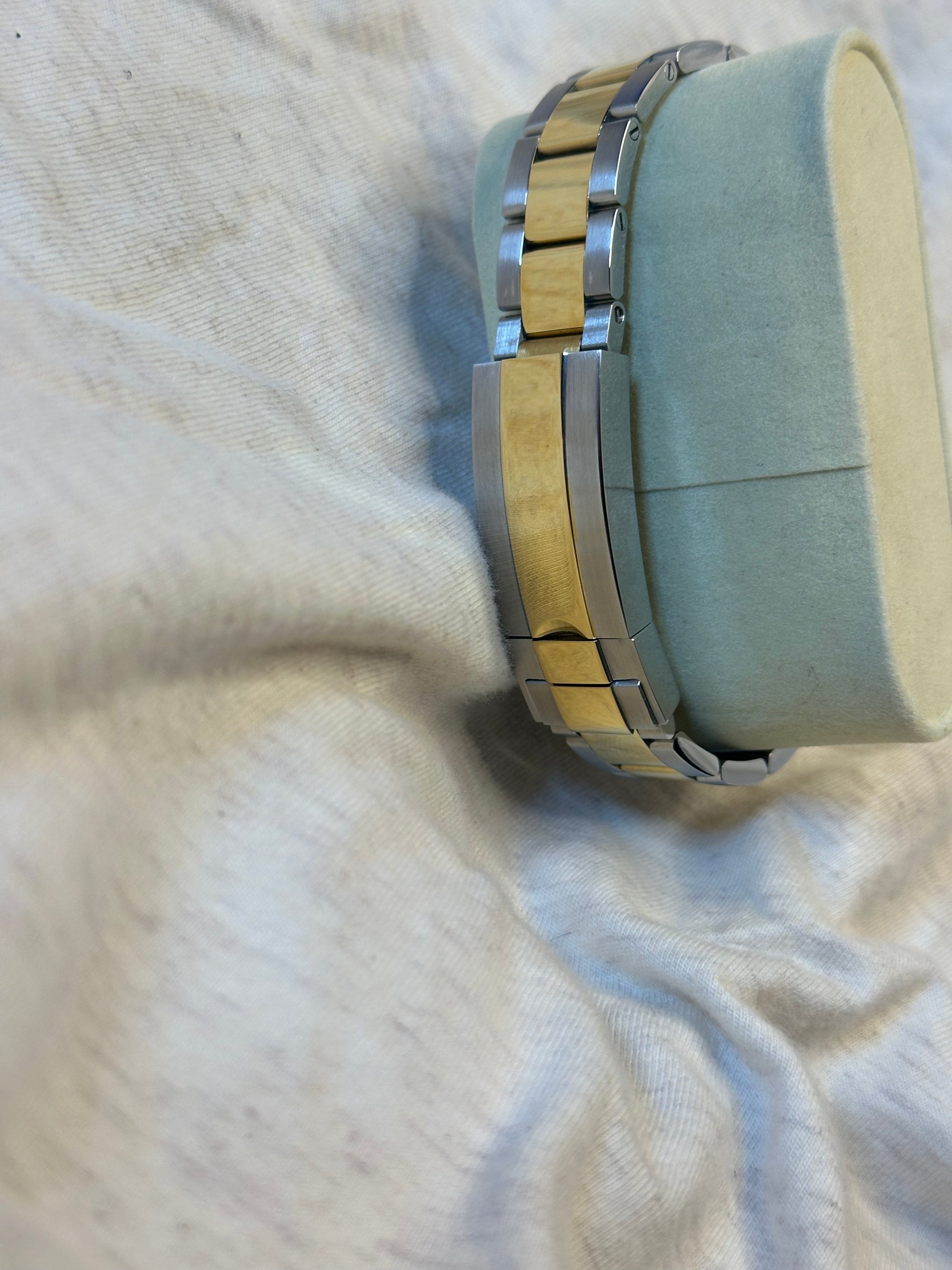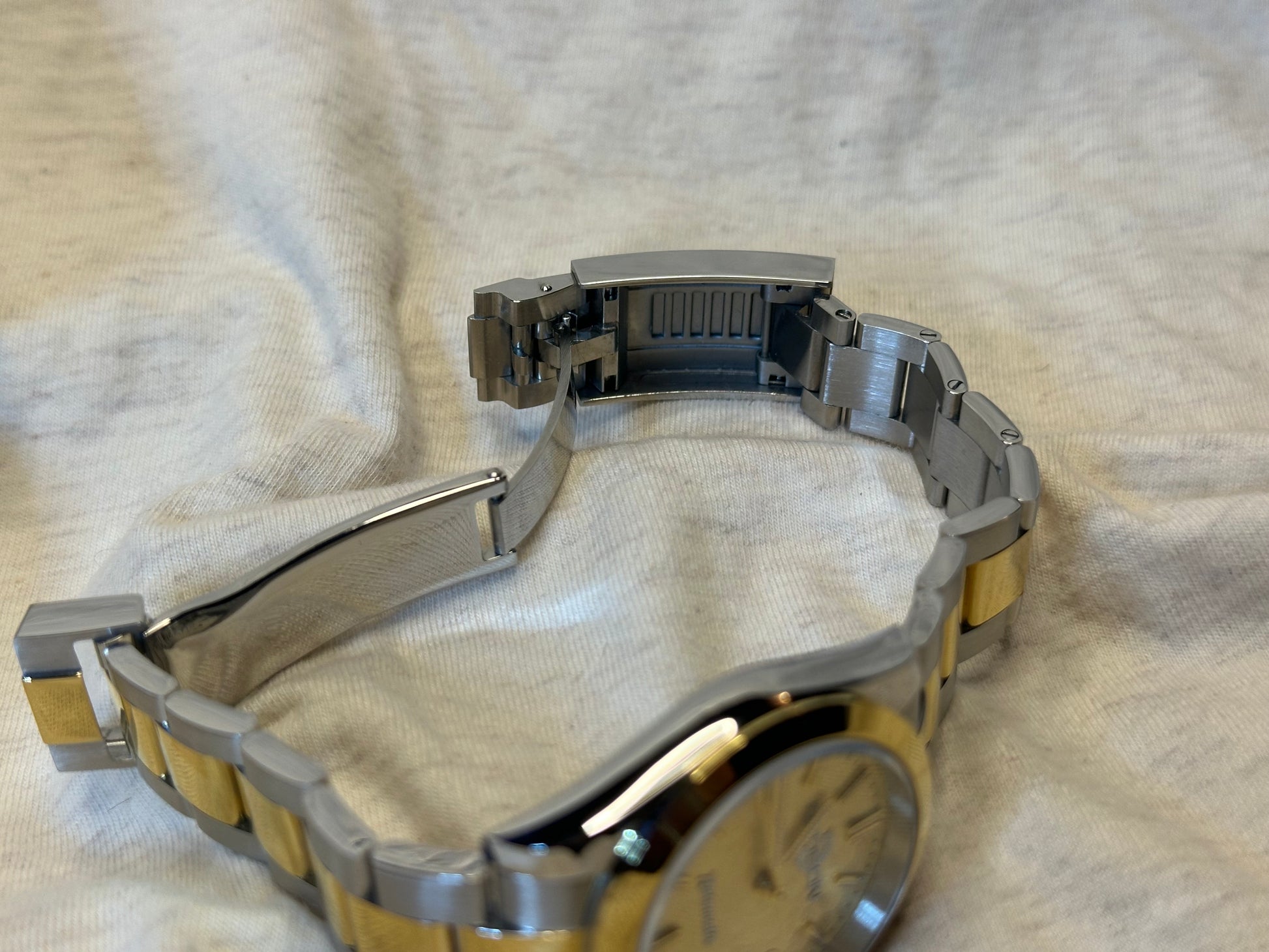 Expertly crafted by Dodson Watch Company in Pennsylvania, this beautiful 2-tone datejust combines timeless style with modern functionality. The textured gold dial is complemented by a sapphire crystal and screw down crown. A Japanese NH35 automatic movement ensures precise timekeeping. Perfect for any occasion, from casual to professional.
