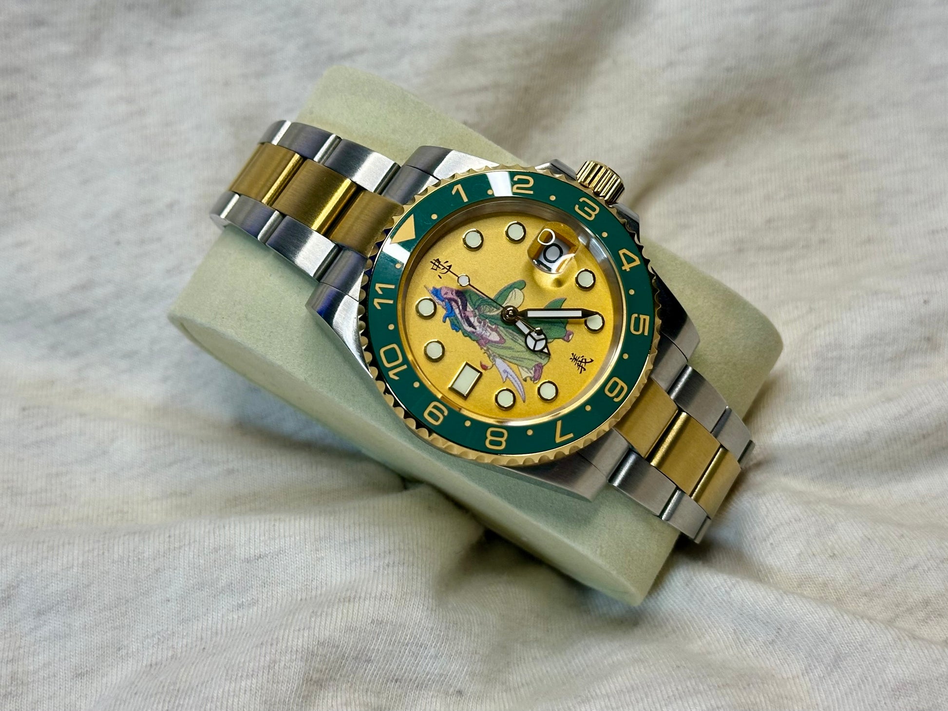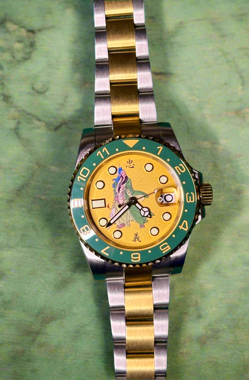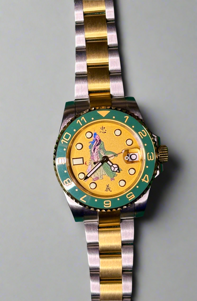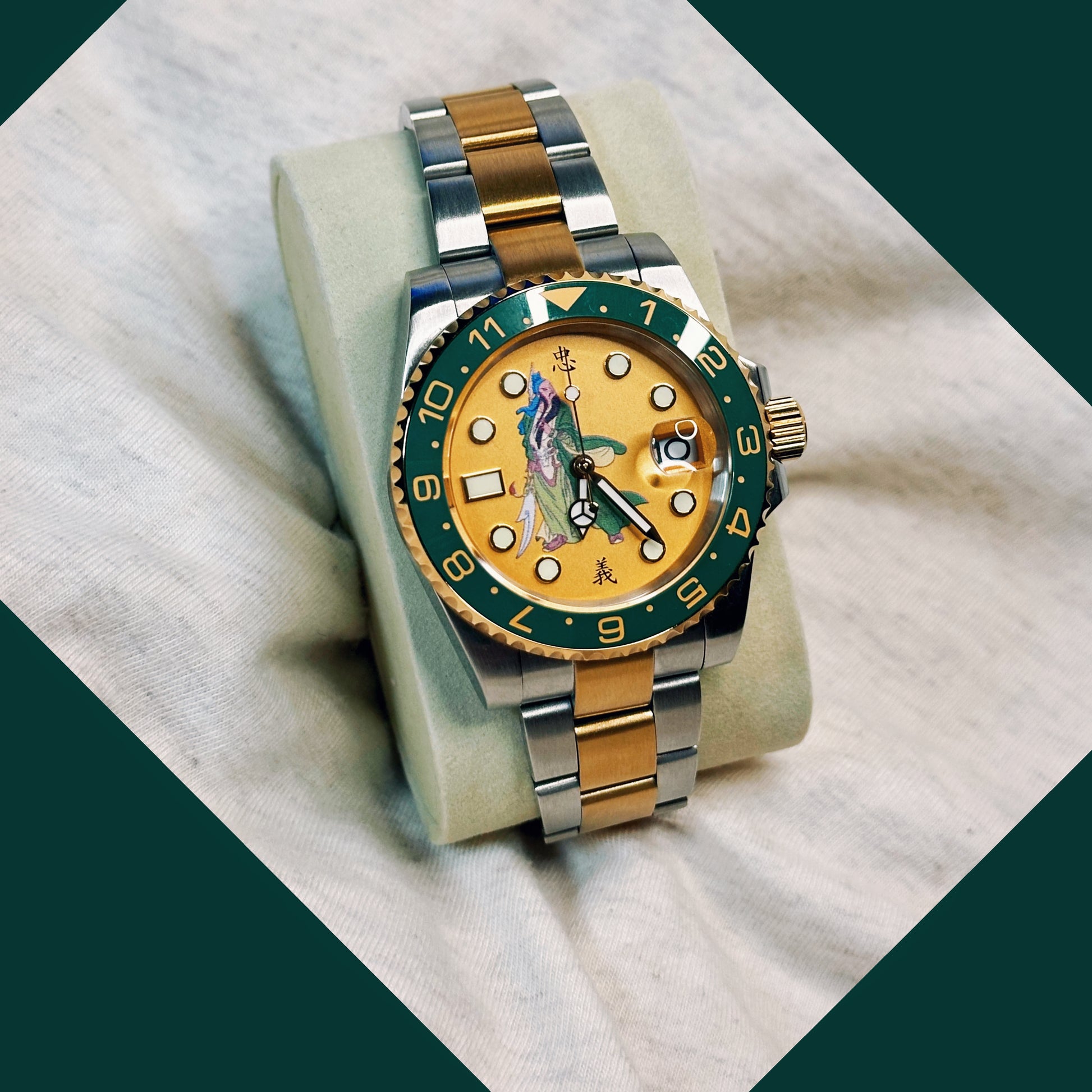 Introducing the Samurai Submariner - a unique timepiece crafted by Dodson Watches. Boasting a sleek green ceramic GMT bezel, scratch-resistant sapphire crystal, and a water-resistant case (100m, untested), this watch combines both style and practicality. The exhibition case back reveals a glimpse of the dependable Japanese NH35 automatic movement, accompanied by a custom gold dragon rotor. Elevate your timekeeping expertise with the Samurai Submariner.