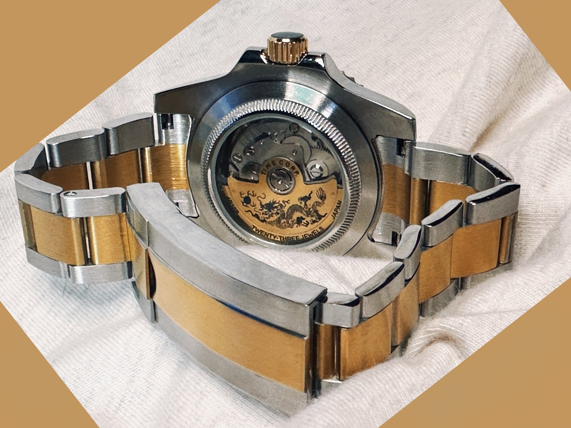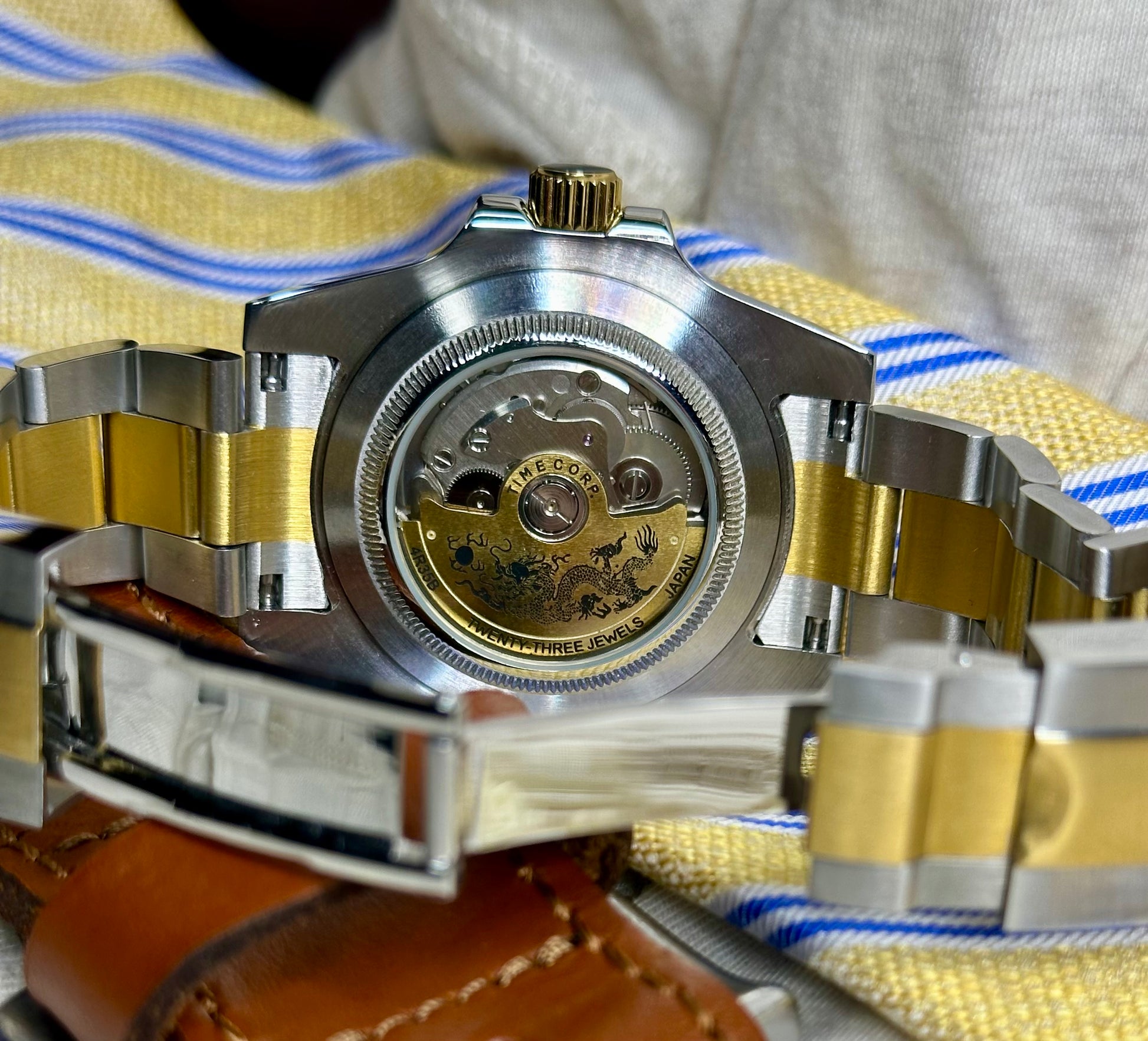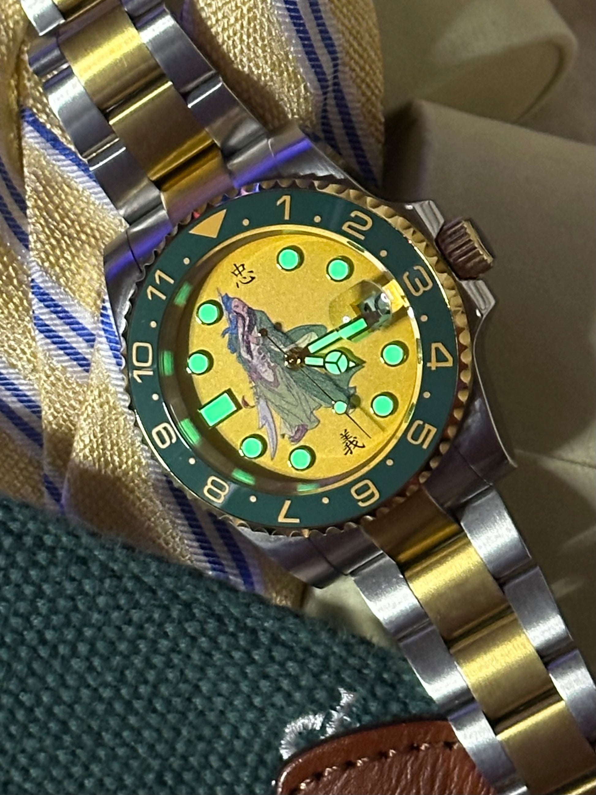 Introducing the Samurai Submariner - a unique timepiece crafted by Dodson Watches. Boasting a sleek green ceramic GMT bezel, scratch-resistant sapphire crystal, and a water-resistant case (100m, untested), this watch combines both style and practicality. The exhibition case back reveals a glimpse of the dependable Japanese NH35 automatic movement, accompanied by a custom gold dragon rotor. Elevate your timekeeping expertise with the Samurai Submariner.