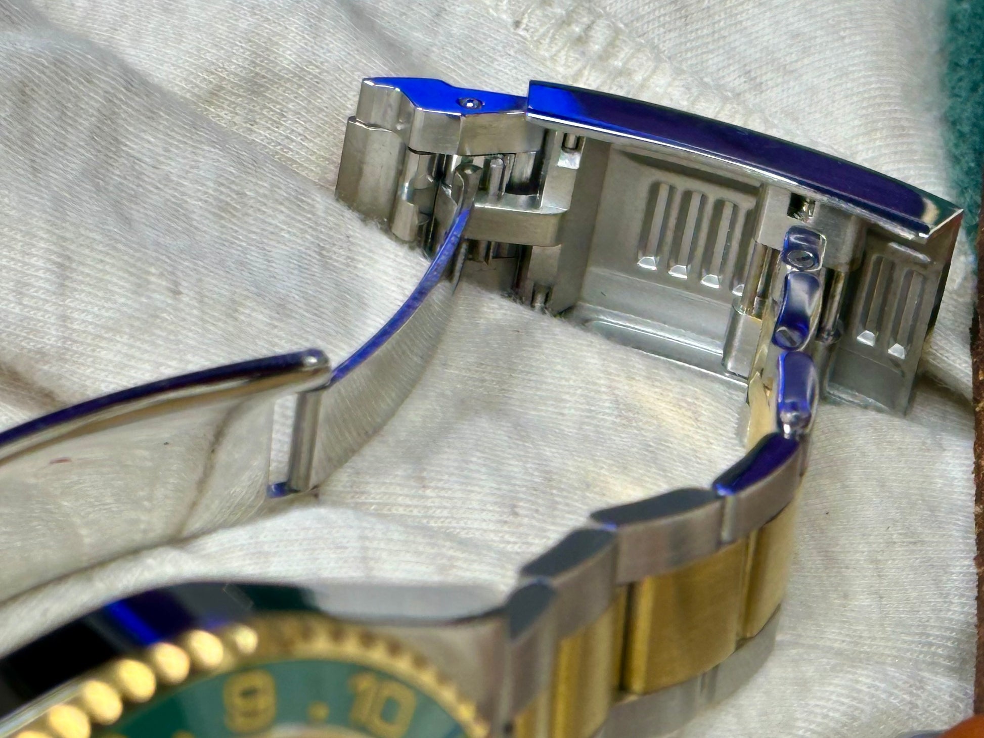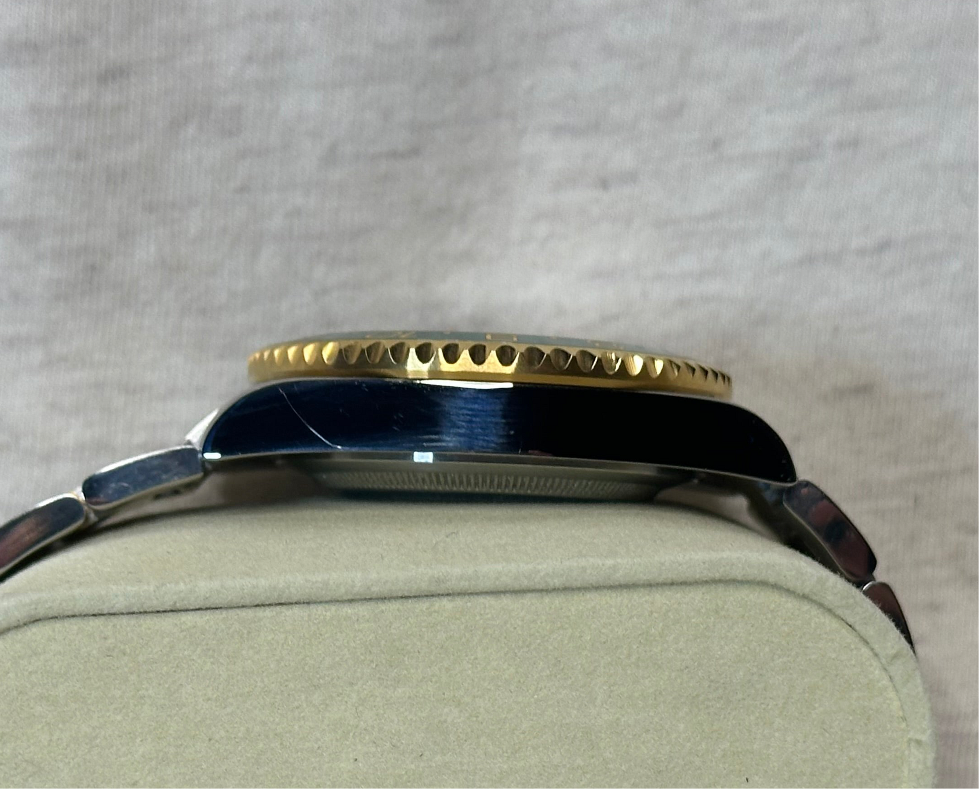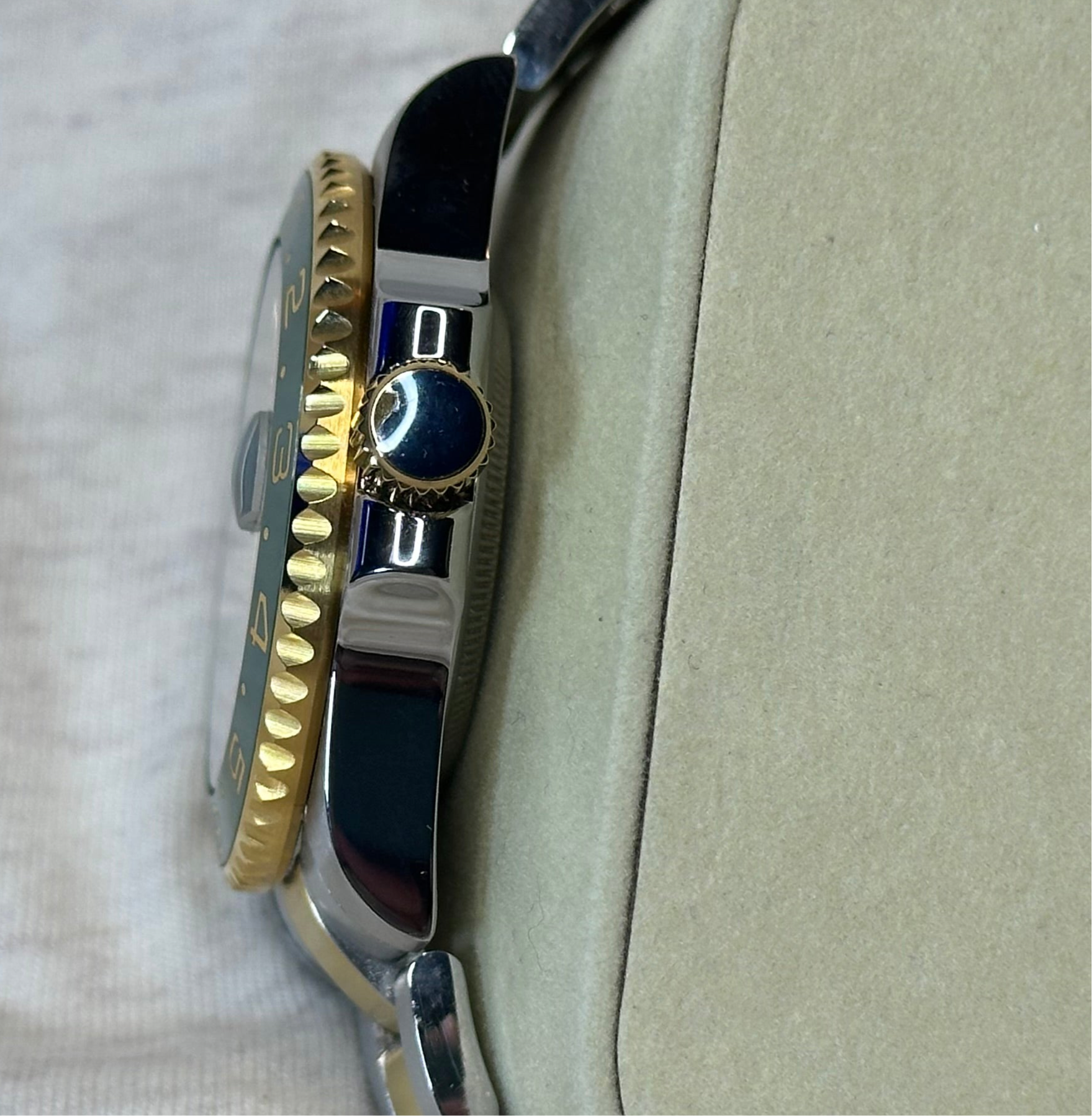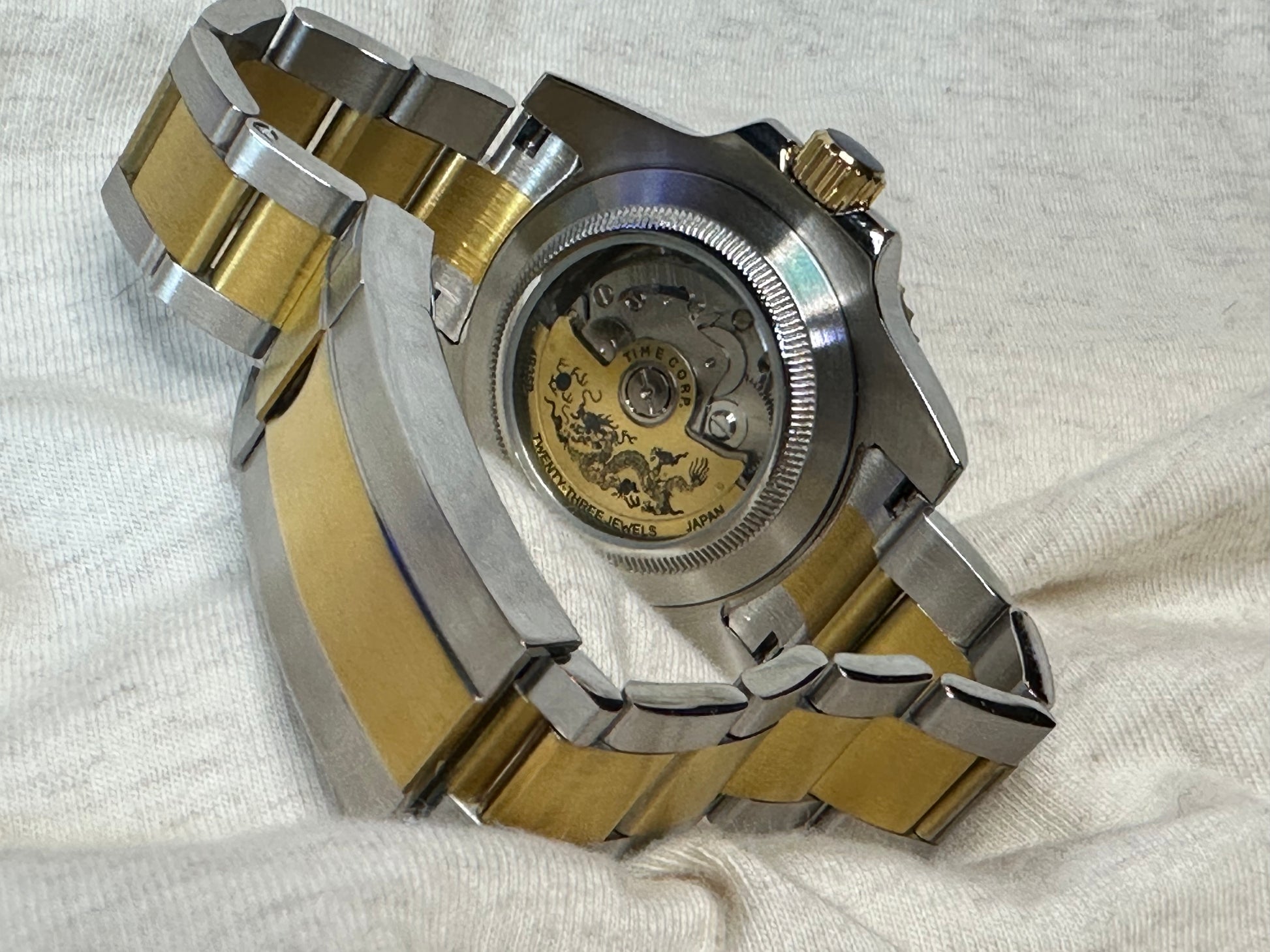 Introducing the Samurai Submariner - a unique timepiece crafted by Dodson Watches. Boasting a sleek green ceramic GMT bezel, scratch-resistant sapphire crystal, and a water-resistant case (100m, untested), this watch combines both style and practicality. The exhibition case back reveals a glimpse of the dependable Japanese NH35 automatic movement, accompanied by a custom gold dragon rotor. Elevate your timekeeping expertise with the Samurai Submariner.